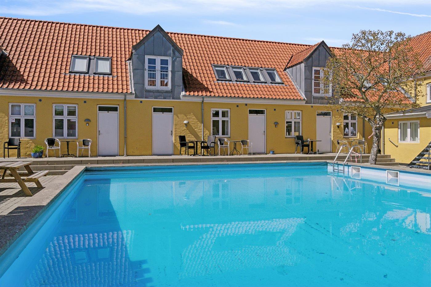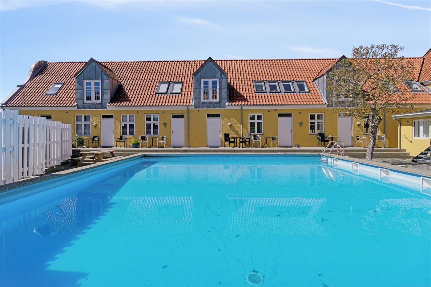 I den flisebelagte gård er der en fælles udendørs swimmingpool (uopvarmet) - poolen kan benyttes fra 1. juni til 30. september. Supermarked lige ved komplekset, så der er ikke langt til morgenbrødet under ferien. Restauranter, Røgeri, is og chokolade og små cafeer - det hele er lige ved hånden. Husk gode travesko - gaderne i Gudhjem er stejle, men absolut charmerende.
