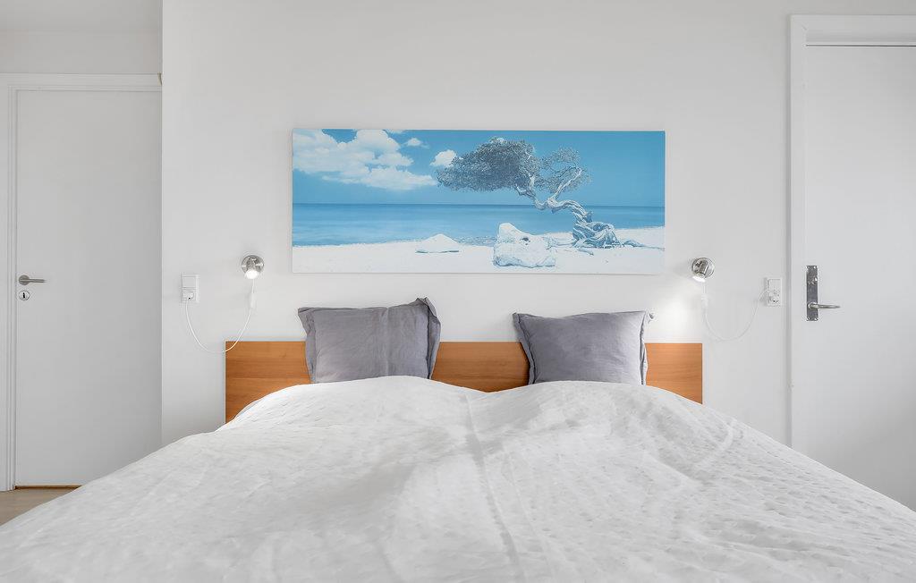 Bemærk, at soveværelset og stuen er adskilt af en skydedør.