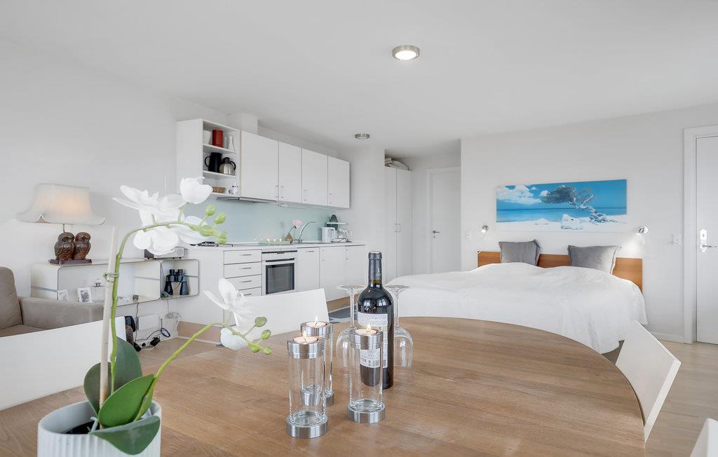 Moderne ferielejlighed i Gudhjem med panoramaudsigt over havet og adgang til fælles pool og terrasser.
