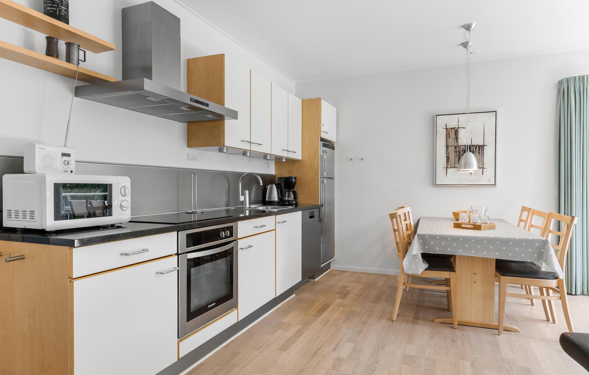 Lejlighederne i komplekset er identiske, og hvis I gerne vil rejse som en større flok, finder I et stort udvalg af boliger, så I kan holde ferie sammen og stadig nyde mulighed for privatliv og god komfort. Indretningen fremtræder lyst og komfortabelt med velvalgte materialer og et fuldt udstyret køkken, hvor I kan tilberede familiens livretter efter en herlig dag på farten. Senere kan I hive brætspillene frem eller rykke over i stuen med snacks og en god film, mens I lægger planer for de kommende dage.