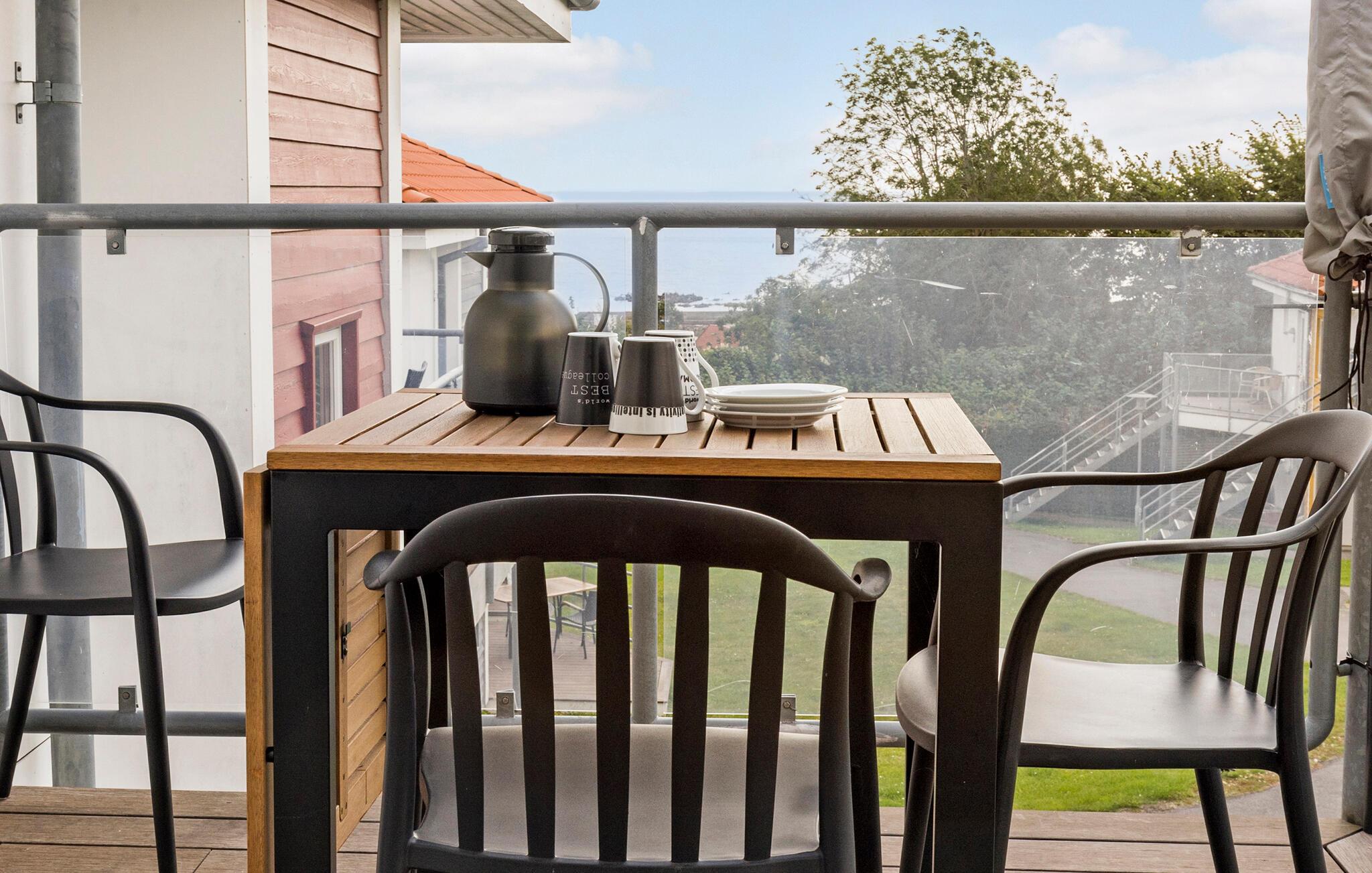 Til lejligheden hører to terrasser. Den ene er foran indgangsdøren, den anden er ved siden af stuen, så I kan finde sol, skygge og læ efter behov i løbet af dagen. Herfra kan I også spejde ud over havet, som kun er en kort gåtur væk.