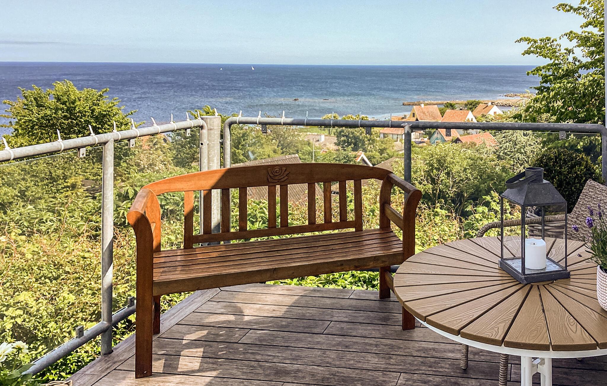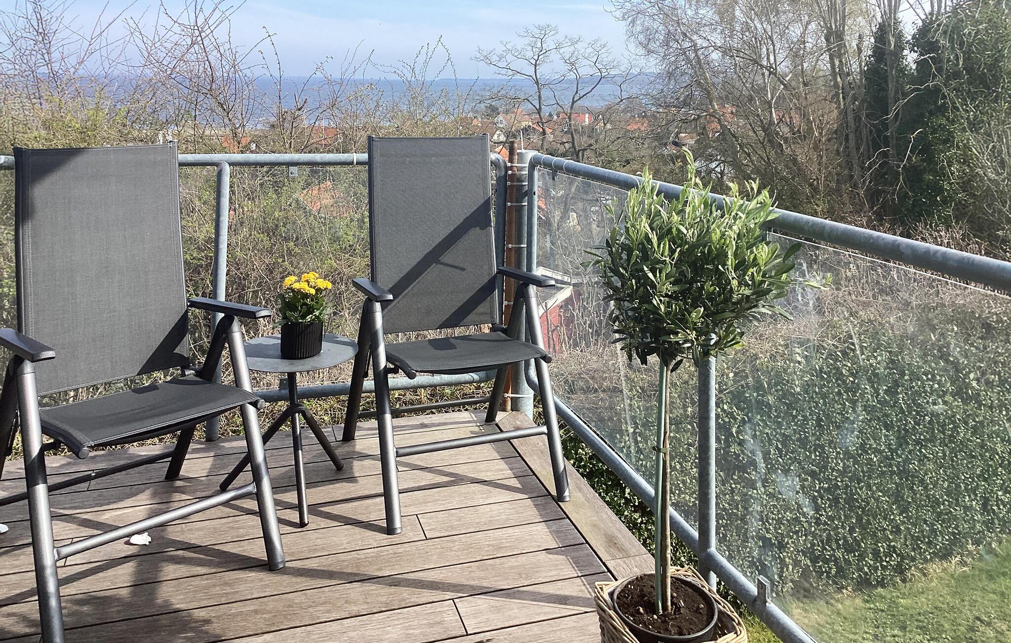 Lys og indbydende ferielejlighed i Gudhjem med delvis havudsigt og to terrasser tæt på havet.