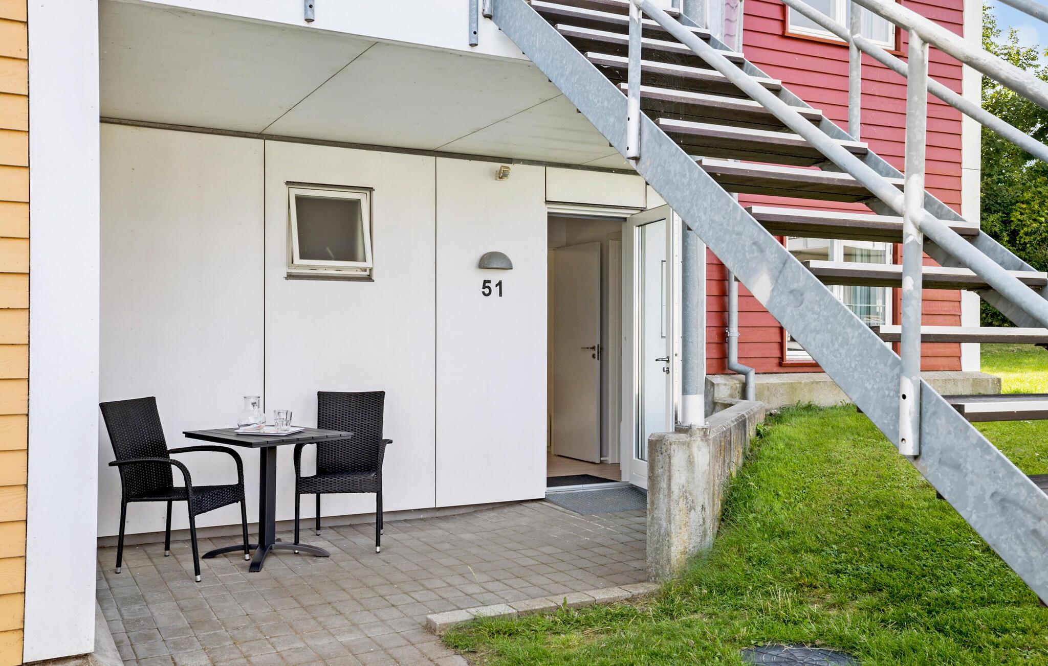 Til lejligheden hører to terrasser. Den ene er foran indgangsdøren, den anden er ved siden af stuen, så I kan finde sol, skygge og læ efter behov i løbet af dagen. Herfra kan I også spejde ud over havet, som kun er en kort gåtur væk.