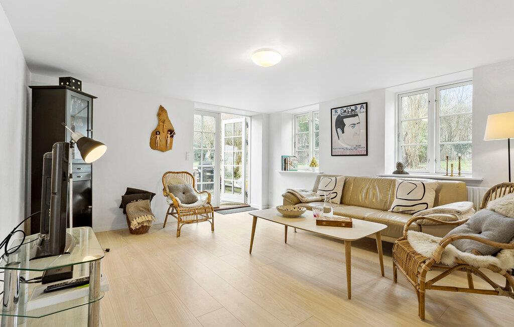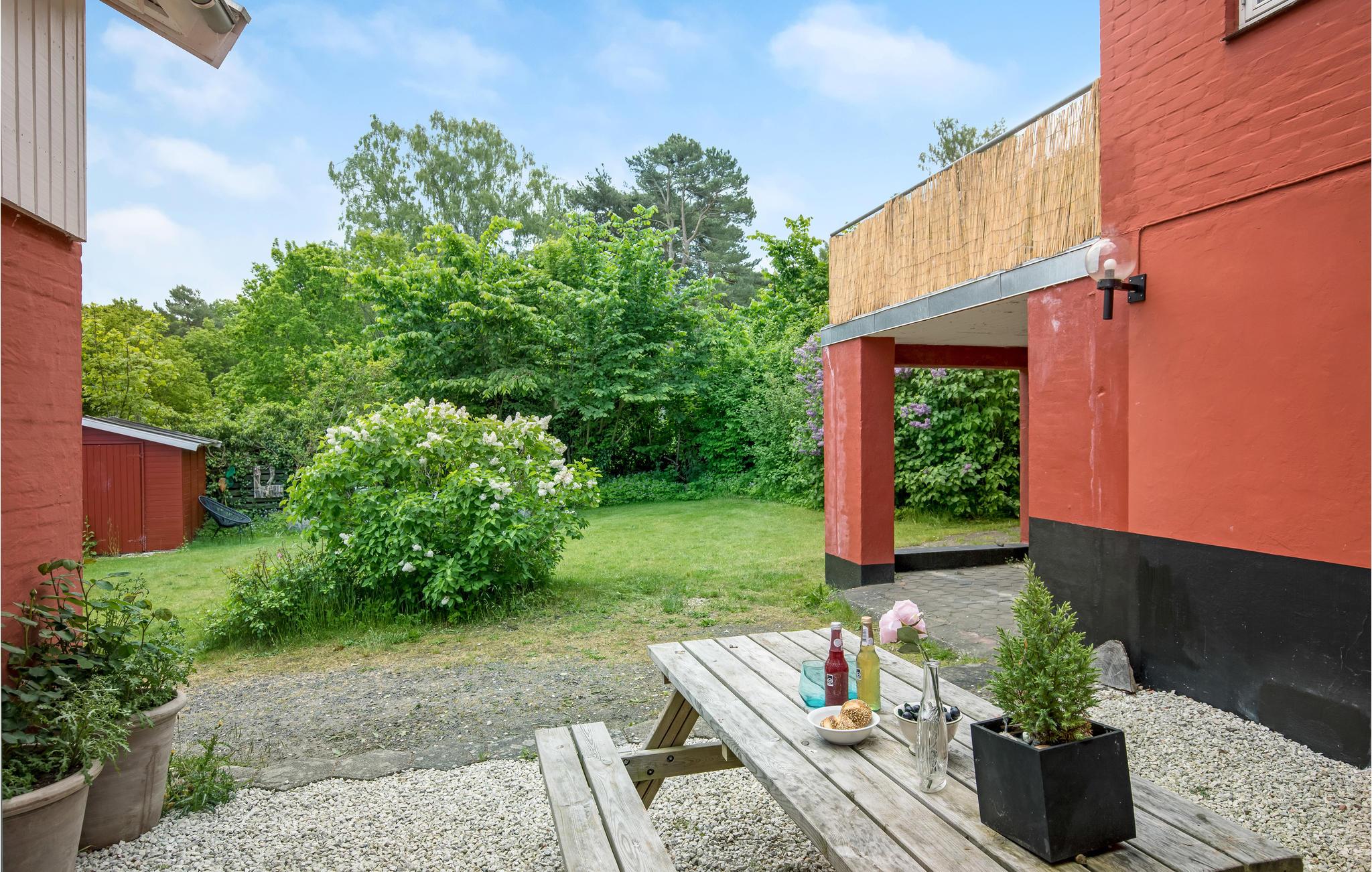 Denne lejlighed ligger i en charmerende ejendom, et flot murstensbyggeri med rødmalet facade. Det store hus har en pragtfuld, rolig placering på en stor naturgrund i et fredet naturområde. Indretningen er funktionel og moderne, og der er gode faciliteter, så her får I en fin base til jeres feriedage.