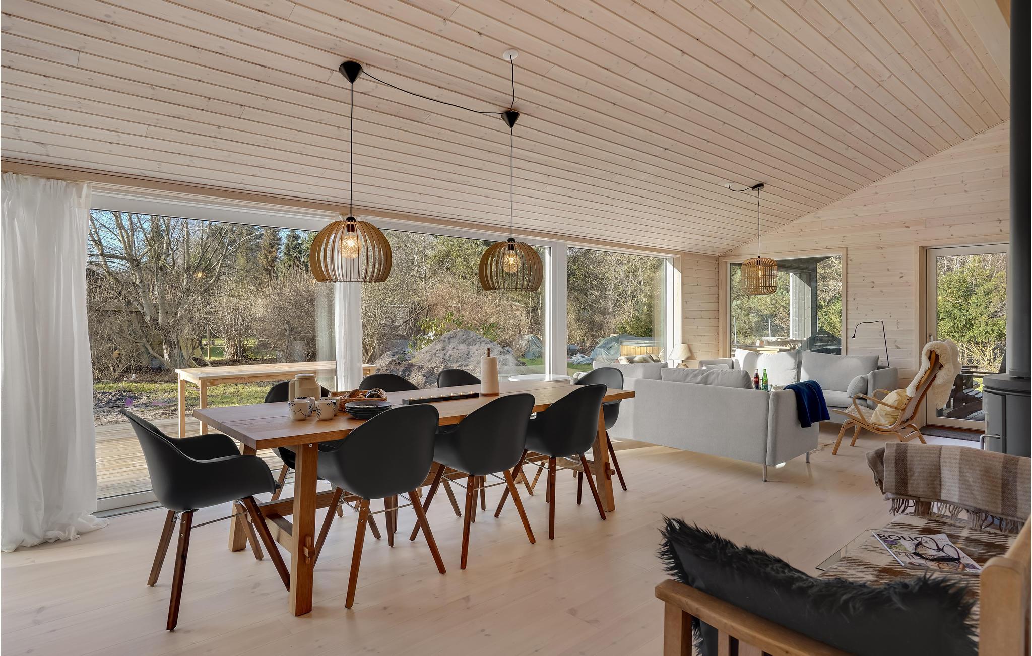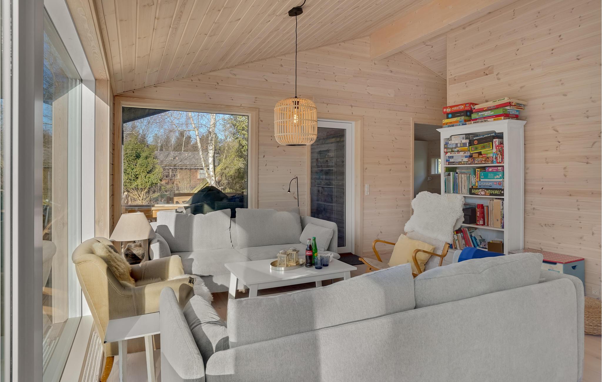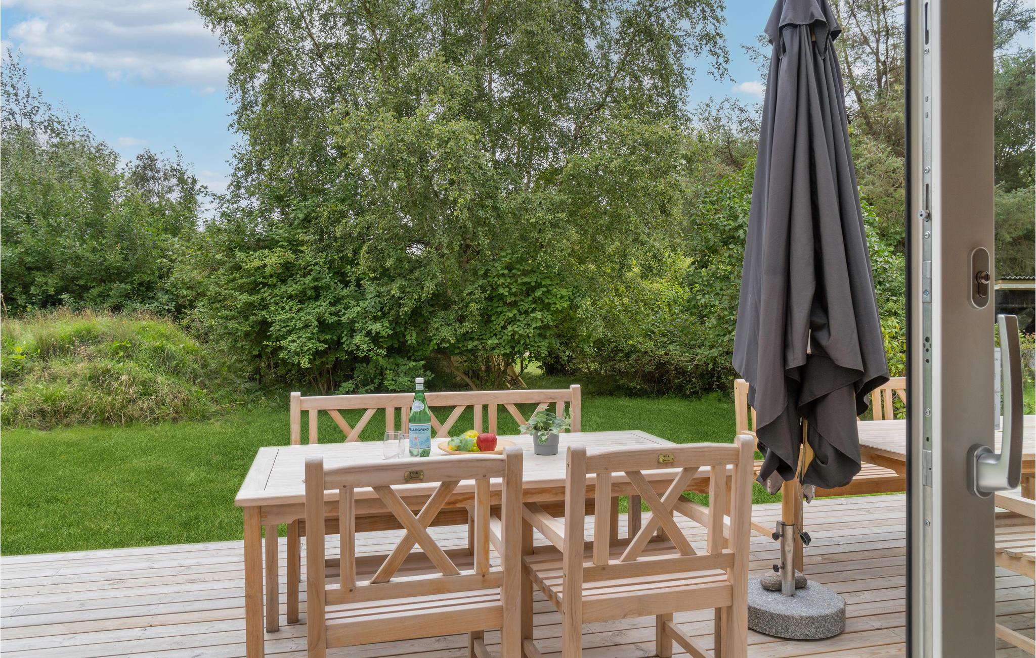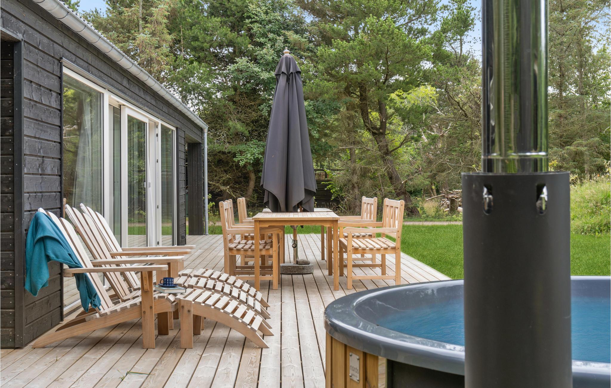 Hele siden af huset er omsluttet af en smuk træterrasse, hvor I finder to overdækkede områder eller blot kan sidde udenfor til måltider og spilaftener. Til velvære og afslapning finder I et vildmarksbad ved siden af terrassen samt et boblebad og en sauna inde i huset. I haven er der også plads til, at børnene kan lege og boltre sig.