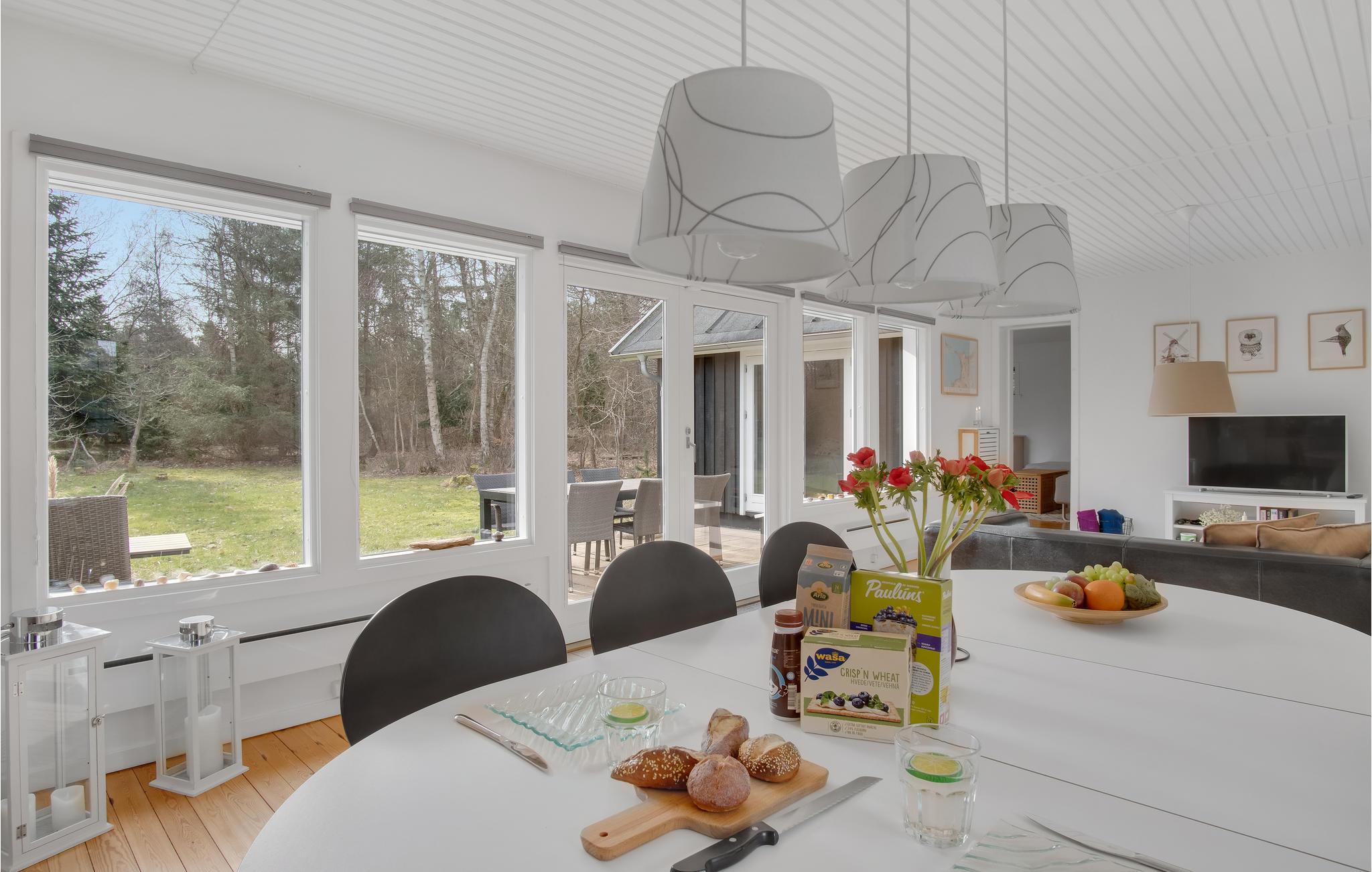 Velkommen til Odsherred, hvor I kan holde en herlig ferie i naturskønne omgivelser. Her ligger dette store, flotte sommerhus placeret og giver jer en lys og behagelig ramme om feriedagene. Både når I finder sammen omkring spisebordet og sætter jer til rette i sofaen, er der udsigt til haven. Efter en lang dag på farten kan I fyre op i brændeovnen og nyde den hyggelige varme, mens I ser serier, læser bøger eller spiller brætspil.