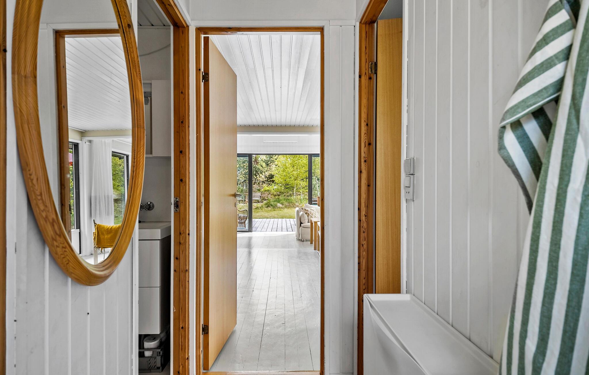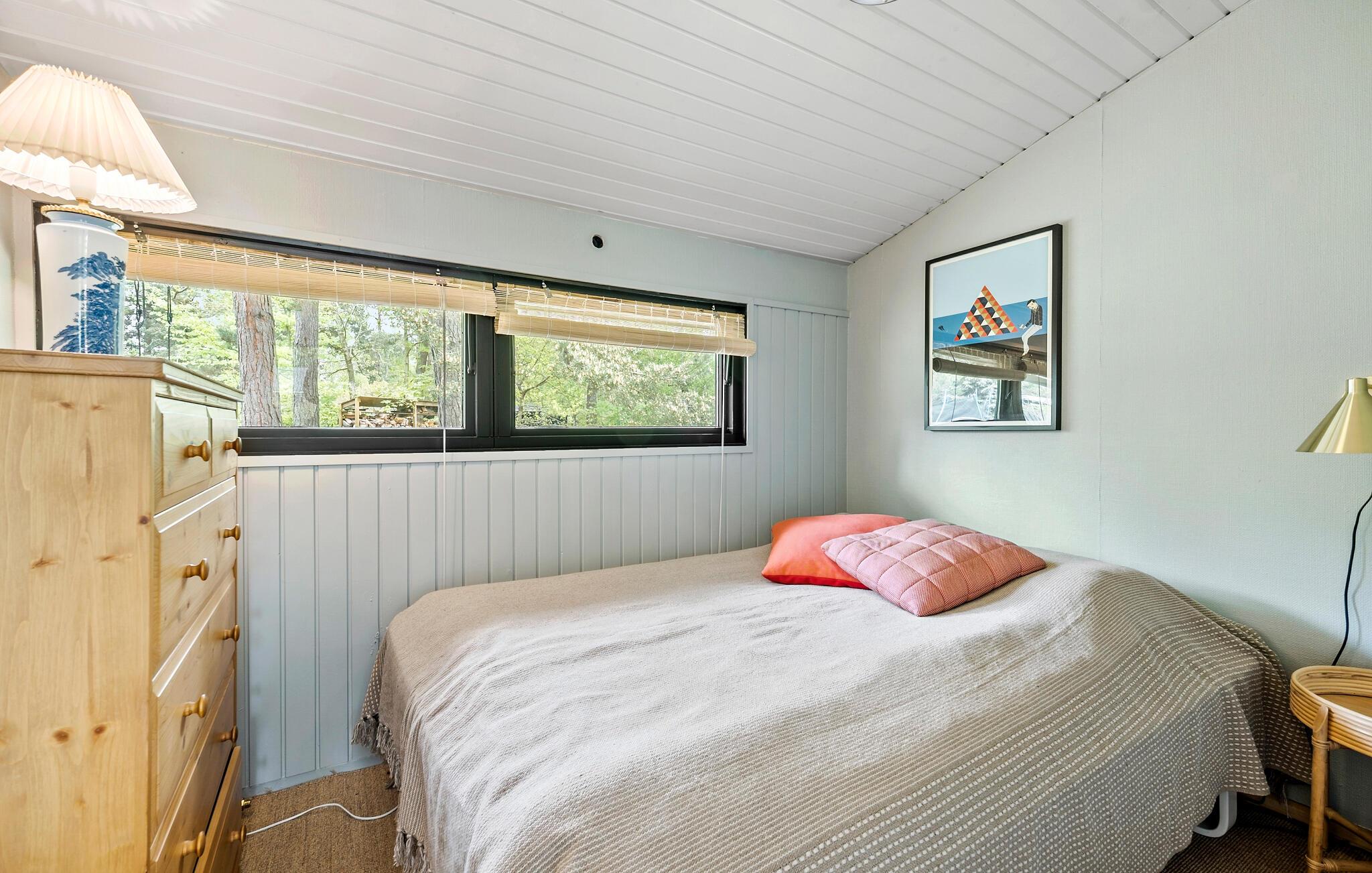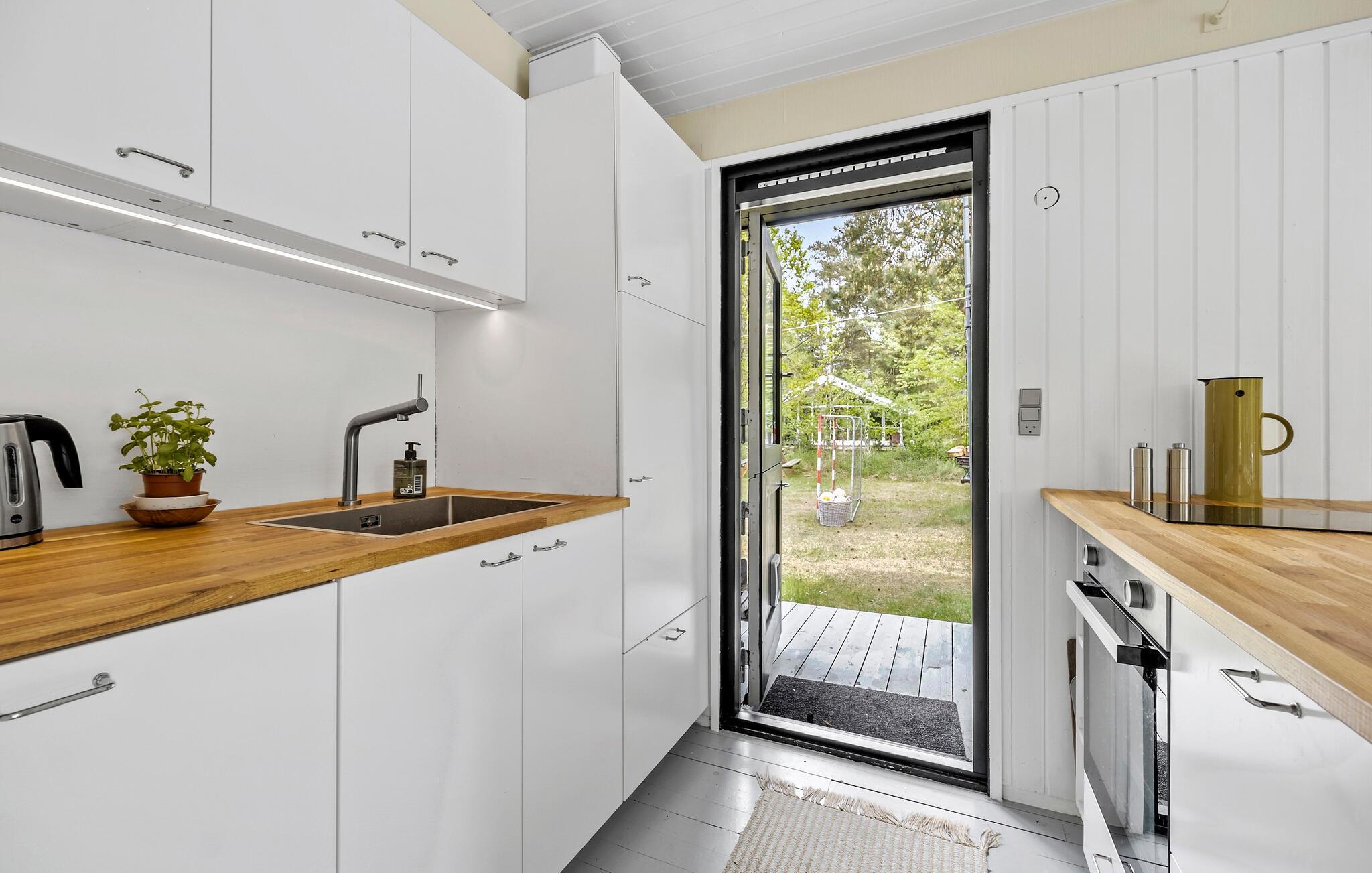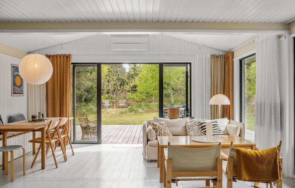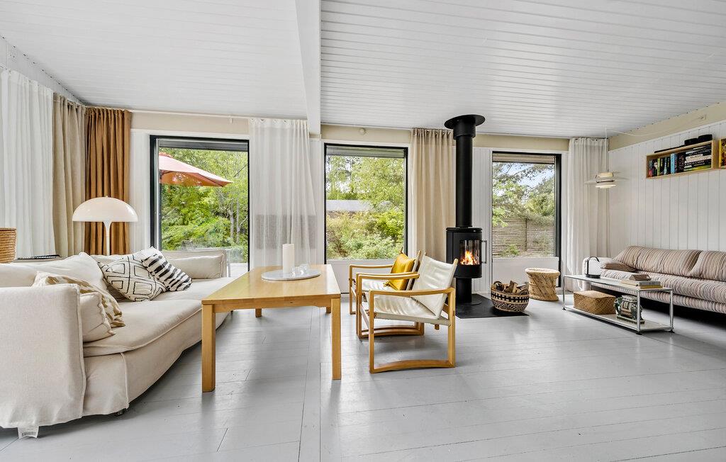 Dette charmerende feriehus byder jer velkommen med et lyst og stilfuldt møbleret interiør, hvor store vinduer lukker masser af naturskønt dagslys ind og giver jer en smuk udsigt over de grønne omgivelser. Tænd brændeovnen og Find jer til rette, mens I forvandler friske råvarer fra gårdbutikken til lækre måltider. Efter en lang dag udendørs kan I slappe af i den behagelige sofa med en spilleaften eller streame en god serie.