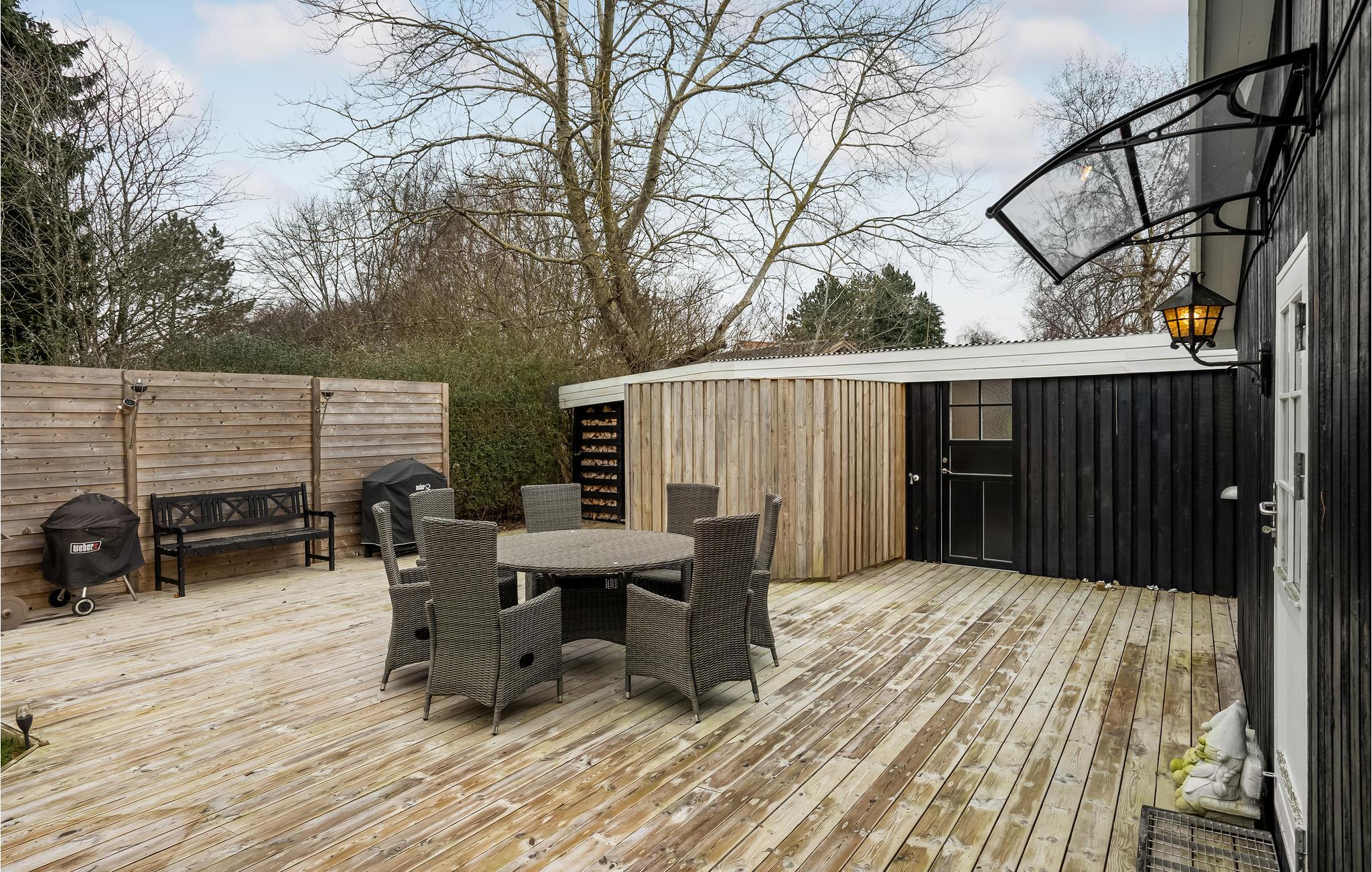 Hyggeligt feriehus nær Gudmindrup Strand med to terrasser, grill og aktiviteter for hele familien.