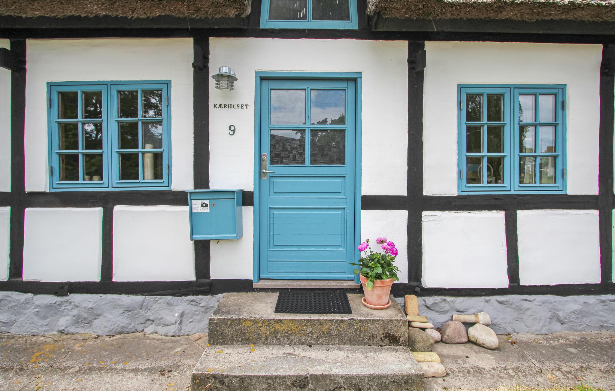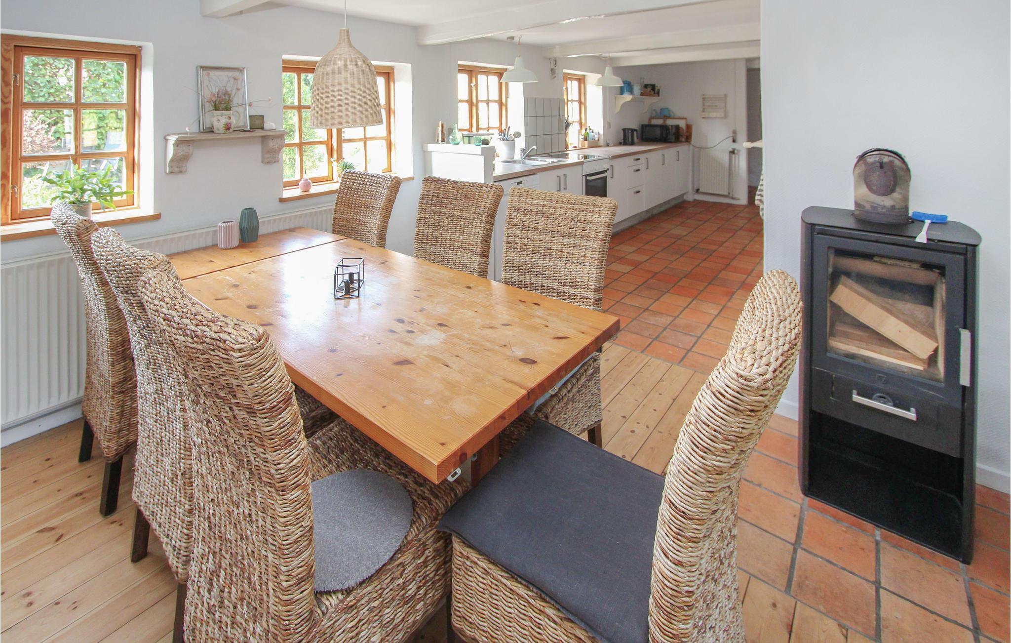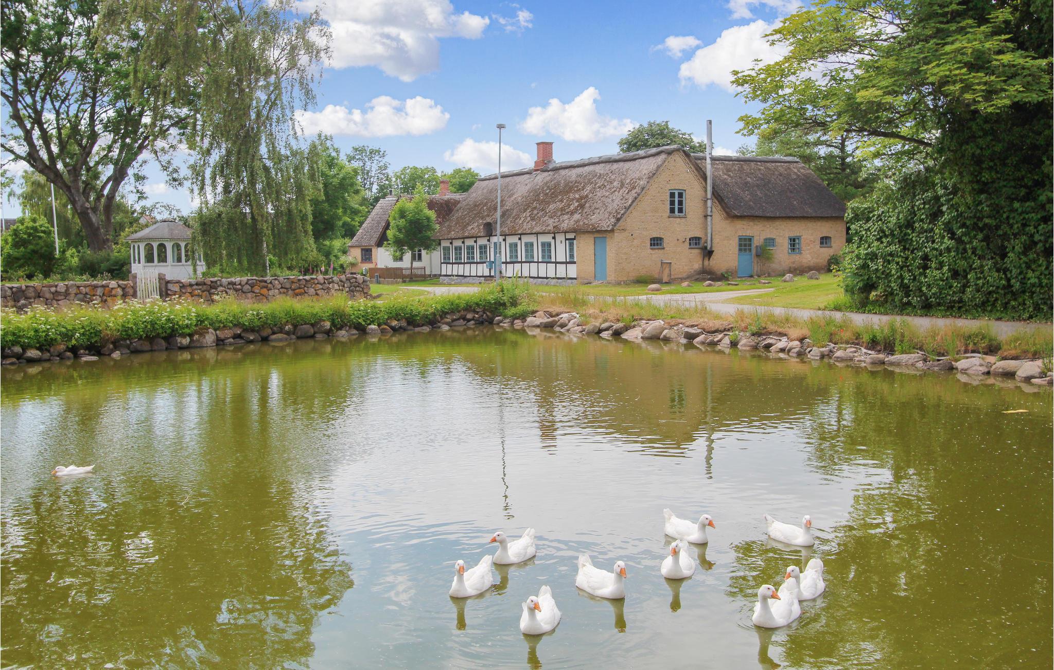 Det indbydende sommerhus med stråtag byder jer velkommen på en smuk beliggenhed ved landsbyens dam. Husets er indrettet med smagfuldt design, hvor moderne og traditionelle elementer indgår i en vellykket blanding. En familie med børn vil føle sig hjemme her, og jeres firbenede ven kan også komme med på ferie. Nyd måltiderne sammen og de dejlige aftener med de knitrende flammer i brændeovnen.
