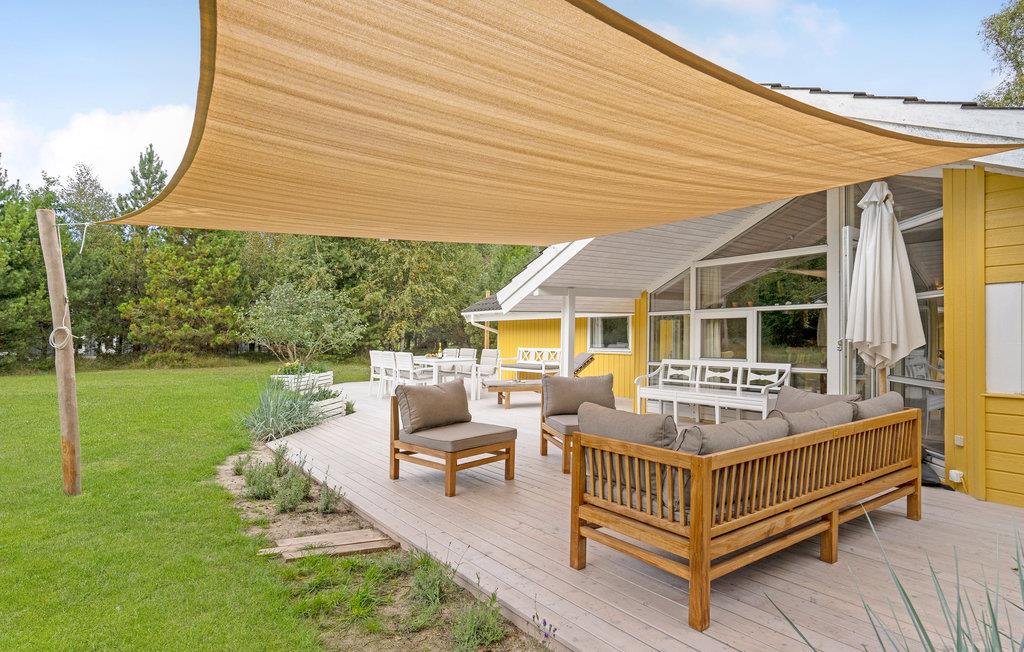 Udenfor inviterer den overdækkede terrasse med havemøbler jer til at tilbringe behagelige timer i den friske luft. I kan slappe af her med en kop kaffe eller en kølig drink, mens børnene leger på plænen.