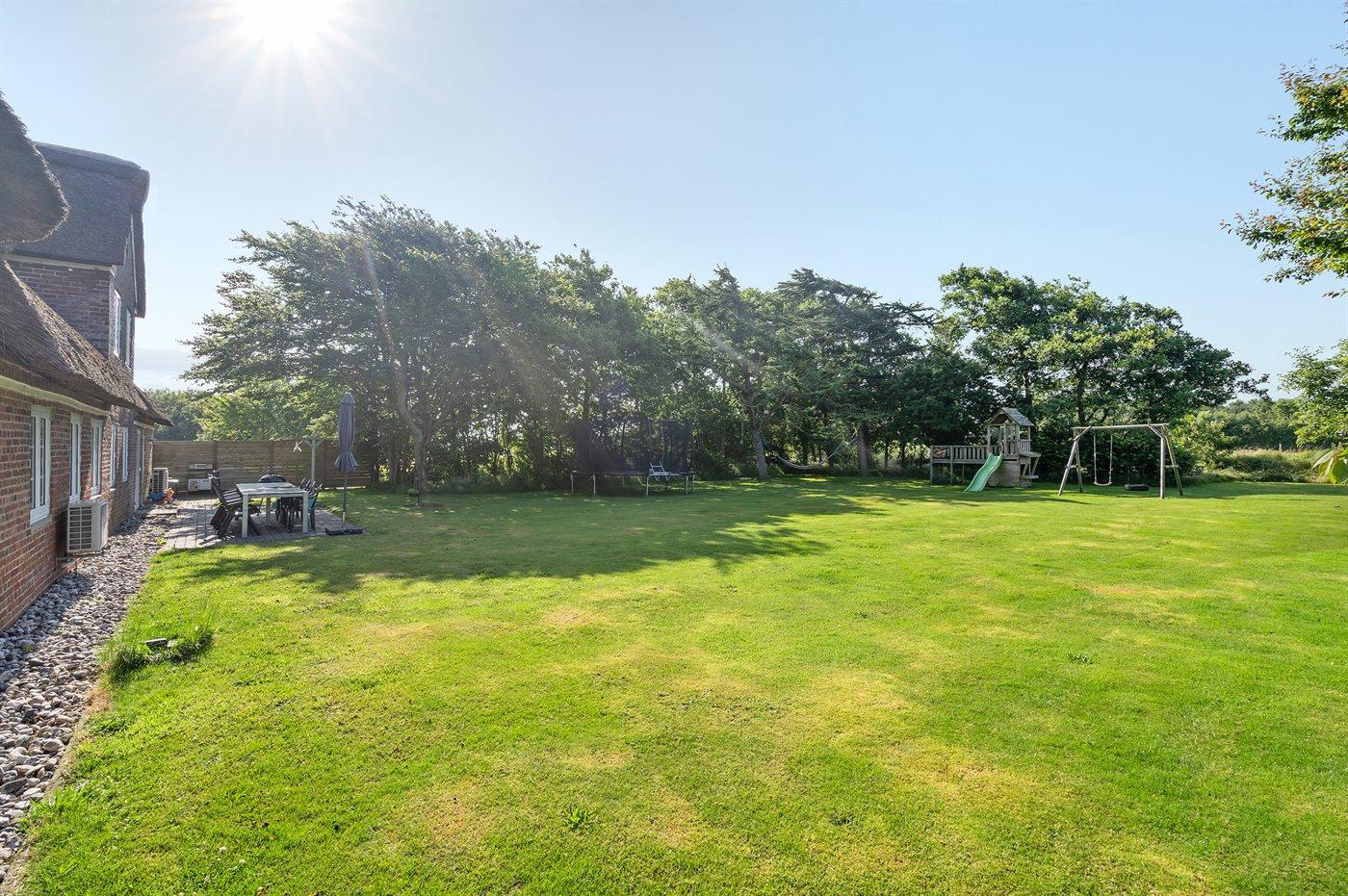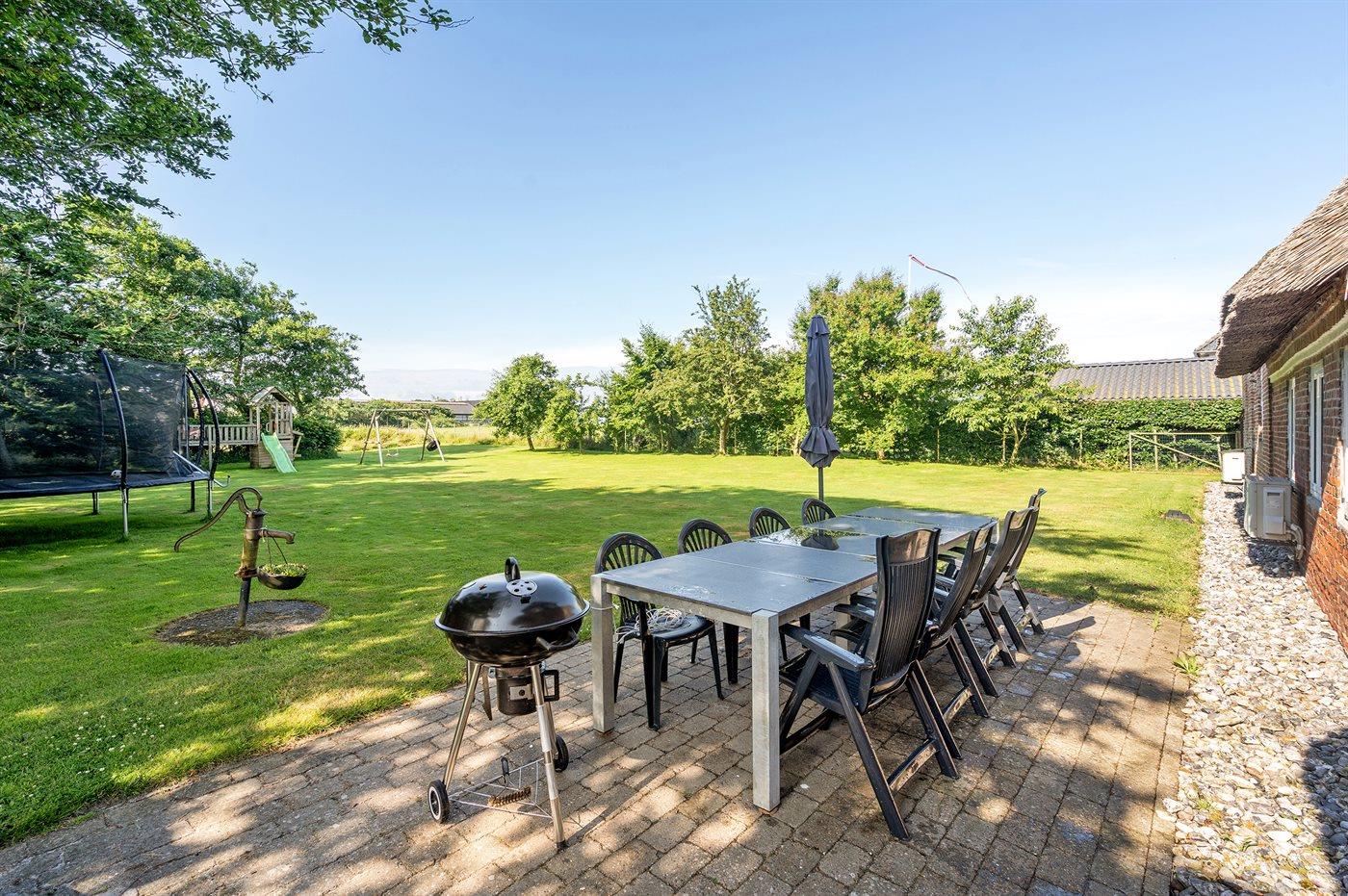 Ferieboligen er beliggende på en 1879 m² stor naturgrund. Grunden er indhegnet. Der er 16000 m til havet. Der er 900 m til Vadehavet. Nærmeste forretning er beliggende i en afstand af 5500 m. Til ferieboligen hører 24 m² terrasseareal. Der er redskabsrum. Gynge. Sandkasse. Trampolin. Legetårn. Rutchebane. Grill til rådighed. Parkering ved ferieboligen.