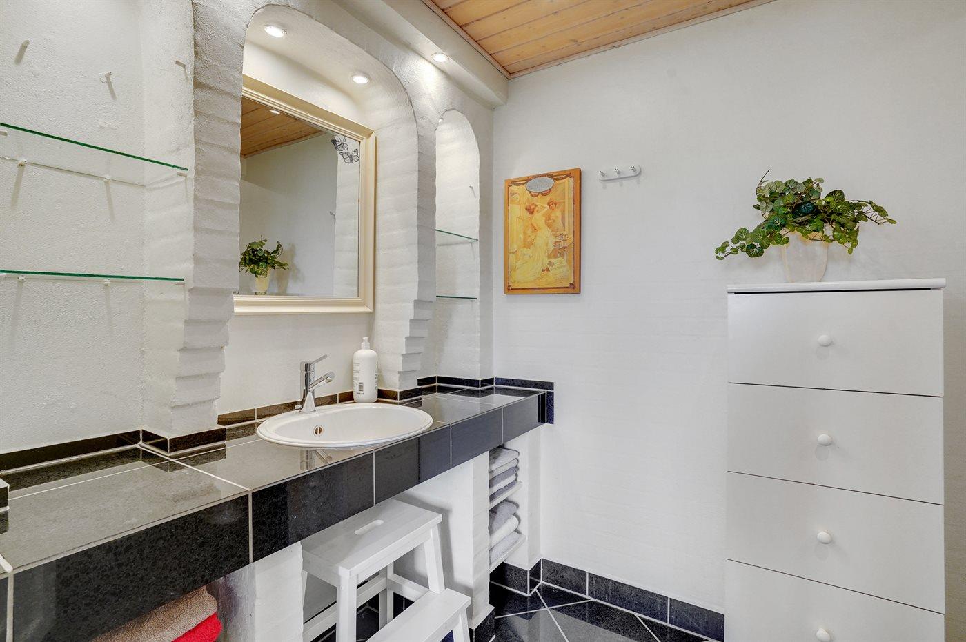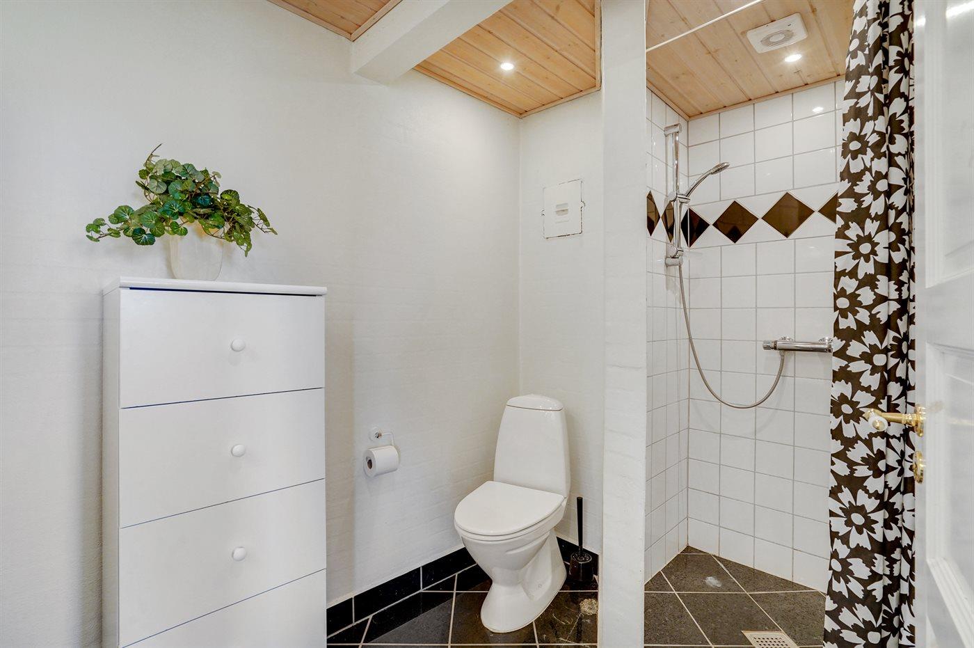 Der er 2 badeværelser med bruseniche og 2 toiletter. Der er gulvvarme på 1 badeværelse.