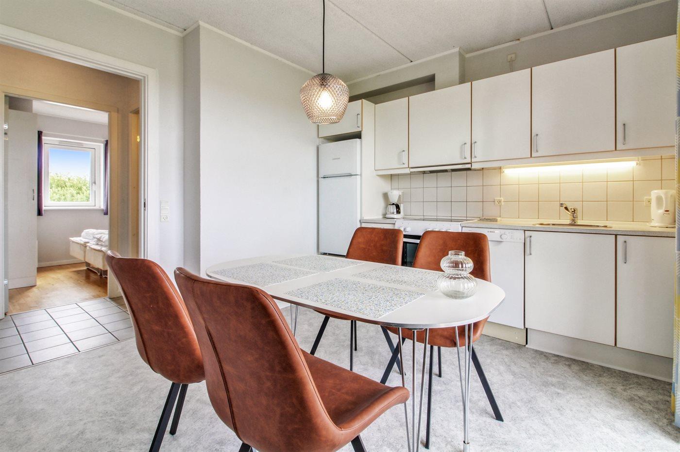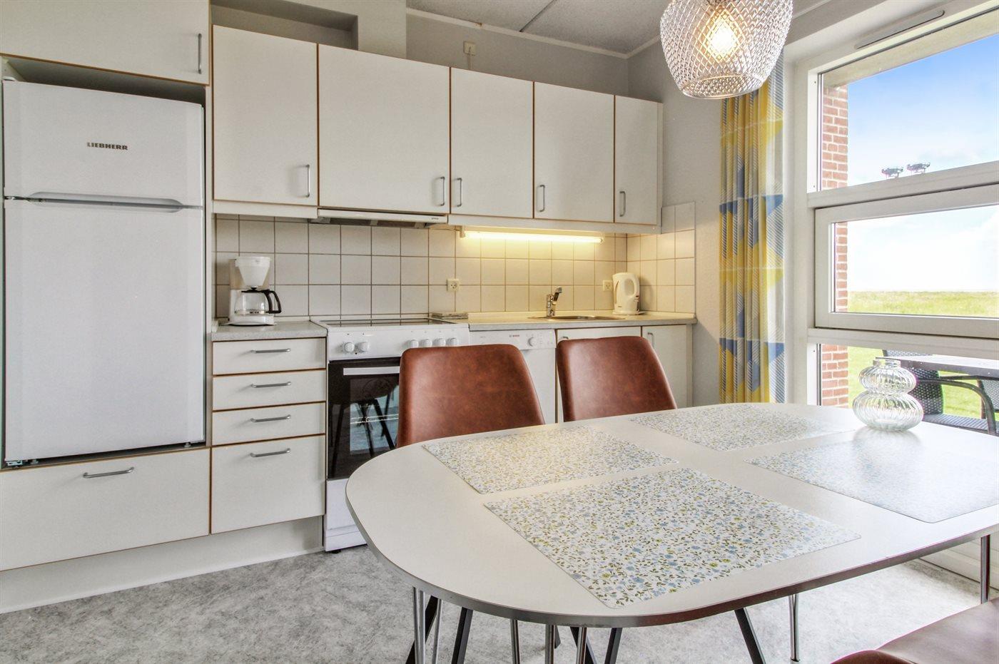 Køkkenet er udstyret med 1 køleskab. Der er 4 elkogeplader, bageovn samt opvaskemaskine.