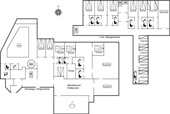 Der er i alt 16 soveværelser. Sovepladserne fordeler sig på: 22 sovepladser i dobbeltsenge. 10 sovepladser i enkeltsenge. Derudover er der 3 stk. barnesenge.