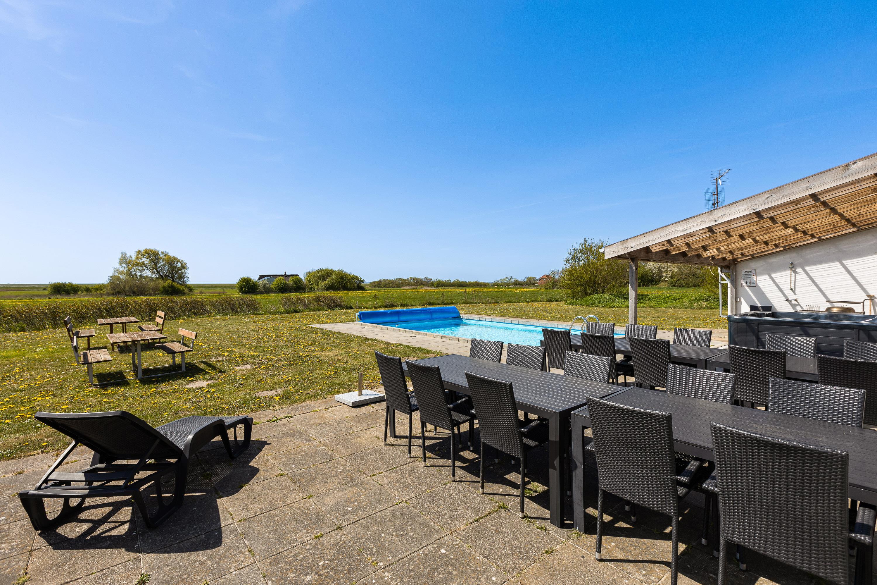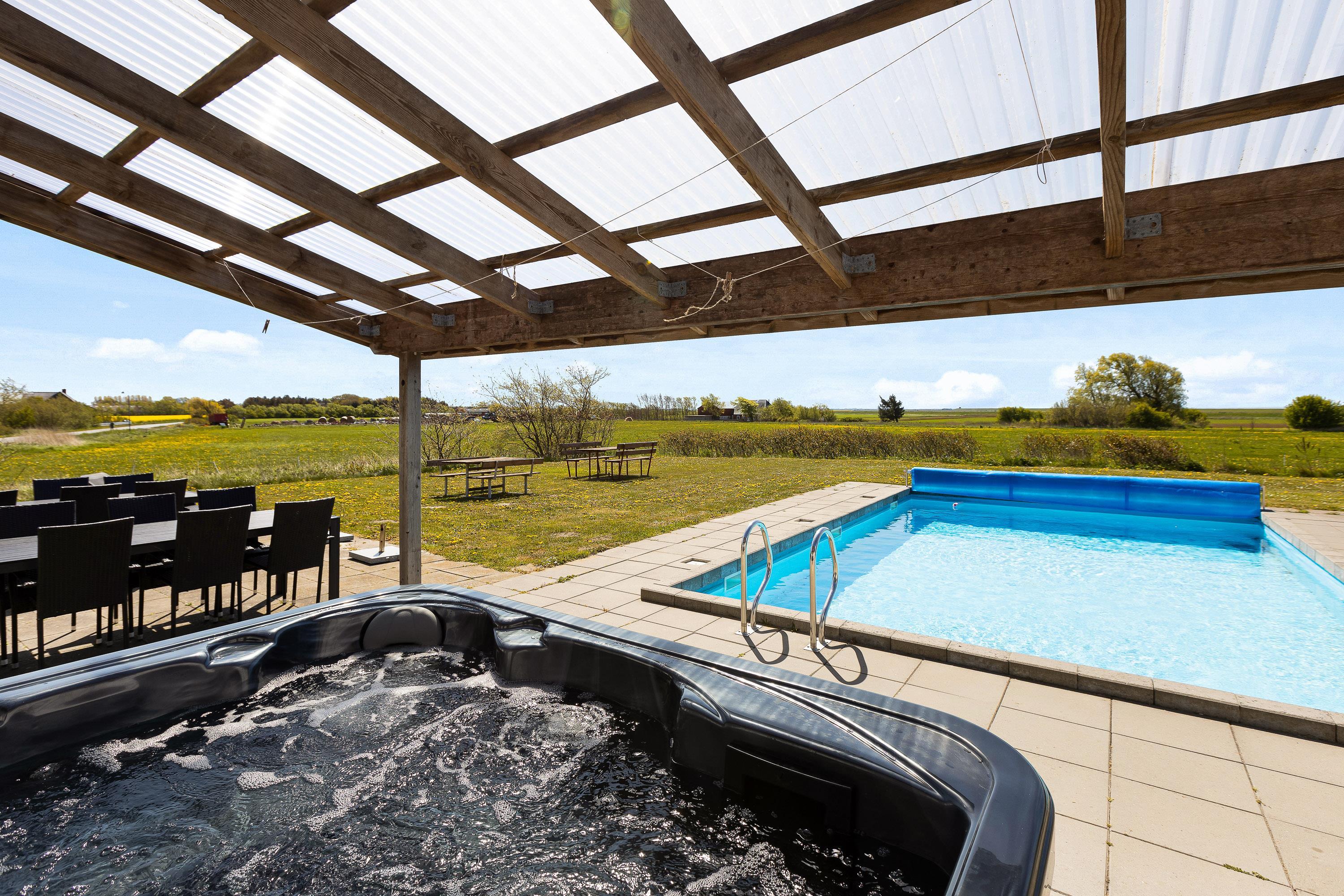 Bag feriehuset ligger den store terrasse, som er delvis overdækket. Her finder du et af højdepunkterne i dette feriehus - Det udendørs boblebad, som kan bruges hele året rundt, uanset årstiden. Både den udendørs pool og det udendørs brusebad er kun tilgængelige i sommermånederne (1. maj-30. september).