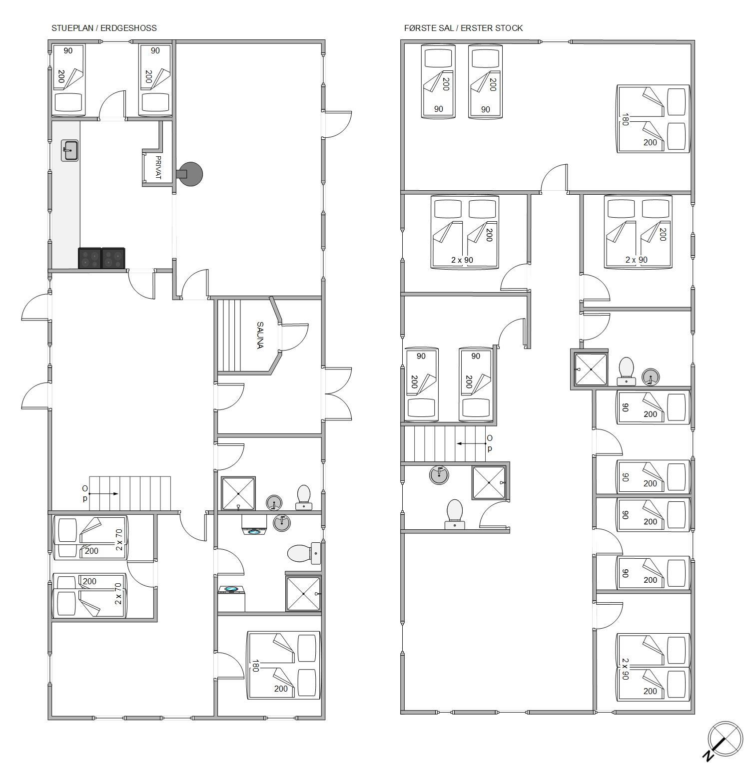 Dette feriehus passer særdeles godt til jer, hvis I planlægger en rejse med hele familien eller sammen alle vennerne. I alt kan op til 24 personer tilbringe nogle skønne og underholdende dage i sommerhuset tæt ved vandet. Det samlede boligareal på 300 m² er fordelt på 2 etager, og I har 10 soveværelser og i alt 4 badeværelser, 1 sauna og en rummelig opholds- og spiseplads med et praktisk udstyret køkken til din rådighed. Der er endda 2 opvaskemaskiner og 2 komfurer, så det er nemt og hurtigt at tilberede måltider sammen og vaske op.