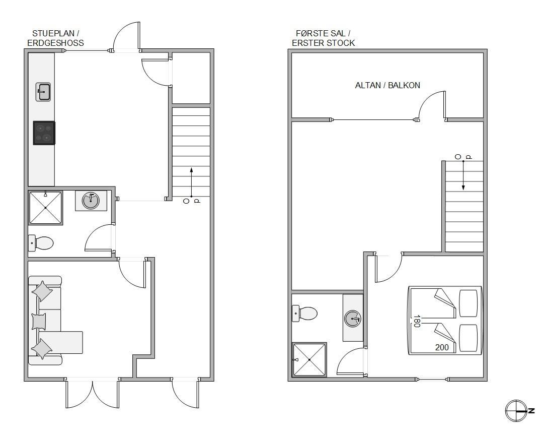 I stueetagen af lejligheden finder du et lyst køkken med blandt andet opvaskemaskine og fryser samt spiseplads. Herfra kan du gå ud på den overdækkede terrasse. Den hyggelige stue ligger på første sal, og herfra samt fra altanen har du en betagende udsigt over Vadehavet. På første sal er der et soveværelse med en komfortabel dobbeltseng. I stueetagen er der et hyggeligt soveværelse med en dobbelt sovesofa, som kan bruges som opholdsrum af de mindre rejsende i løbet af dagen. Der er plads til i alt 4 personer.
