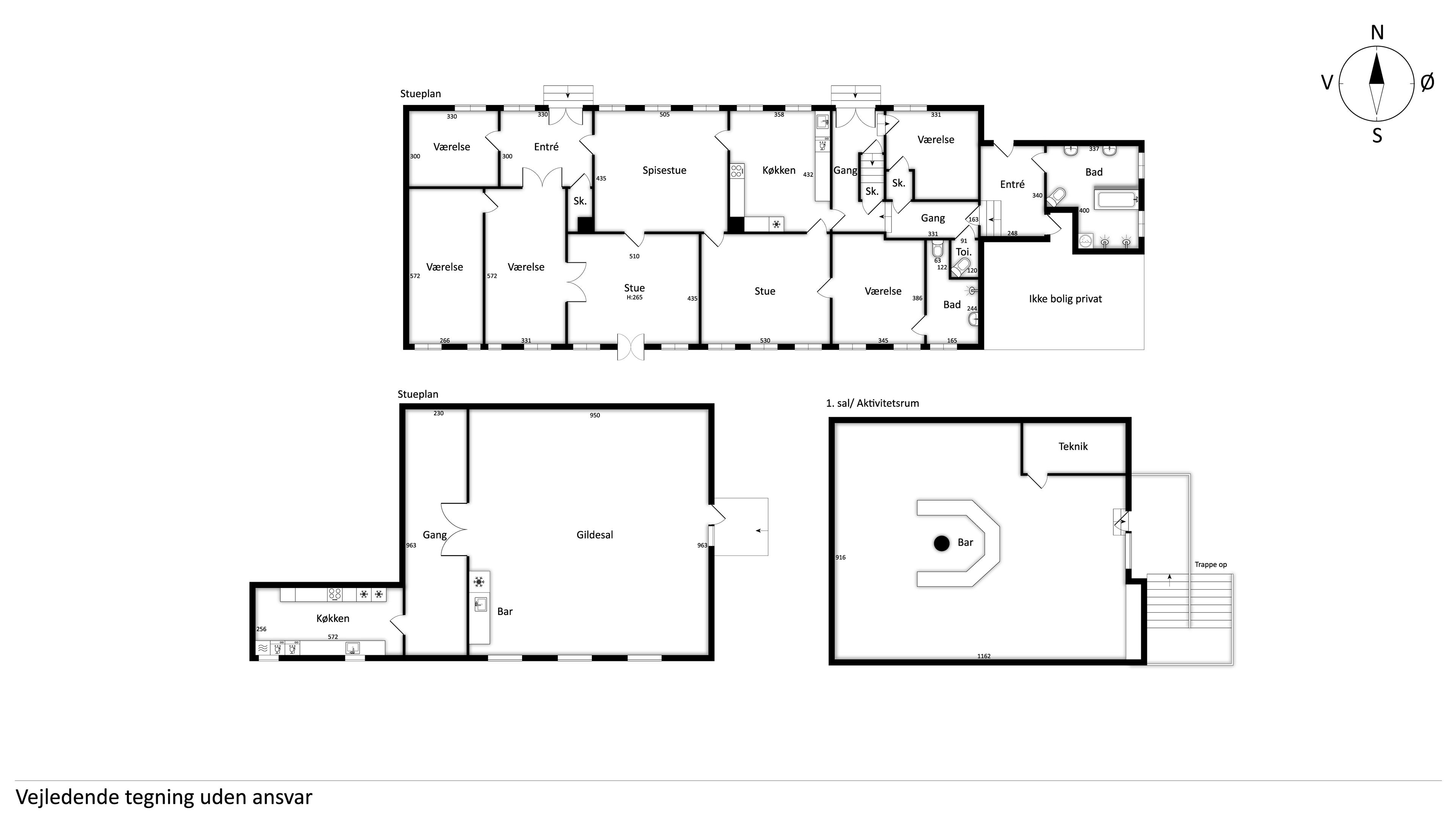 230 m2 stuehus ? 120 m2 aftægtsbolig ? 100 m2 aktivitetsrum ? 175 m2 gildesal/multirum med køkken og 2 badeværelser ? 4.700 m2. have med 2,25 meters vildmarksbad, 3,5 meters tøndesauna og 12-personeres grillhytte ? 30 kw DC hurtiglader til elbil