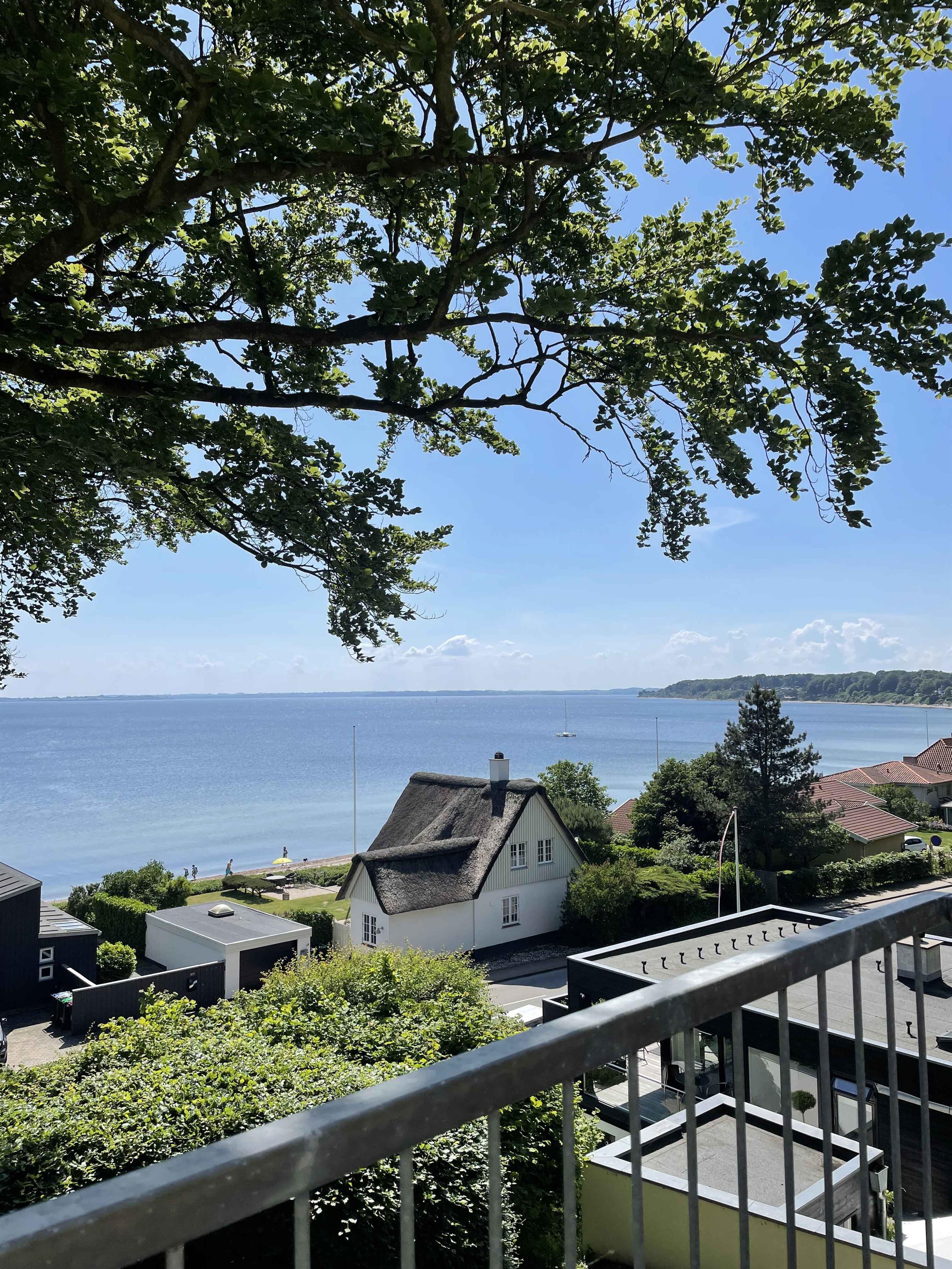 Panoramaudsigt, 50 m til vandet, ladestander, have i forskellige plateauer, med skoven som baghave, det sidste stykke vej op til huset er stejl, badehotelstil, tæt på Christiansfeld, som er på Unescos liste