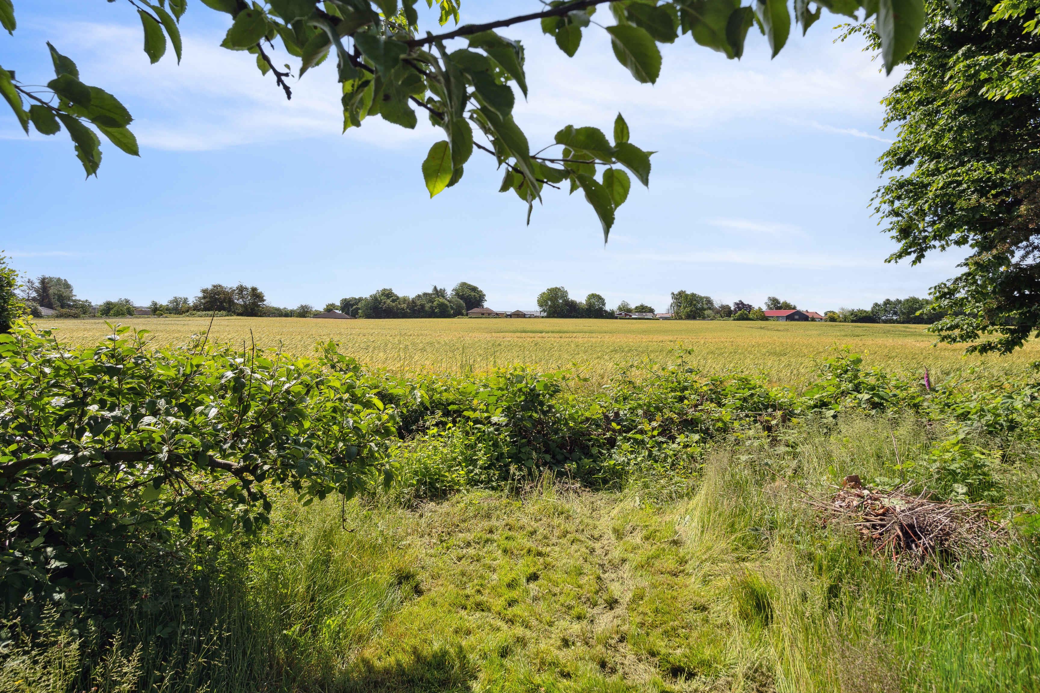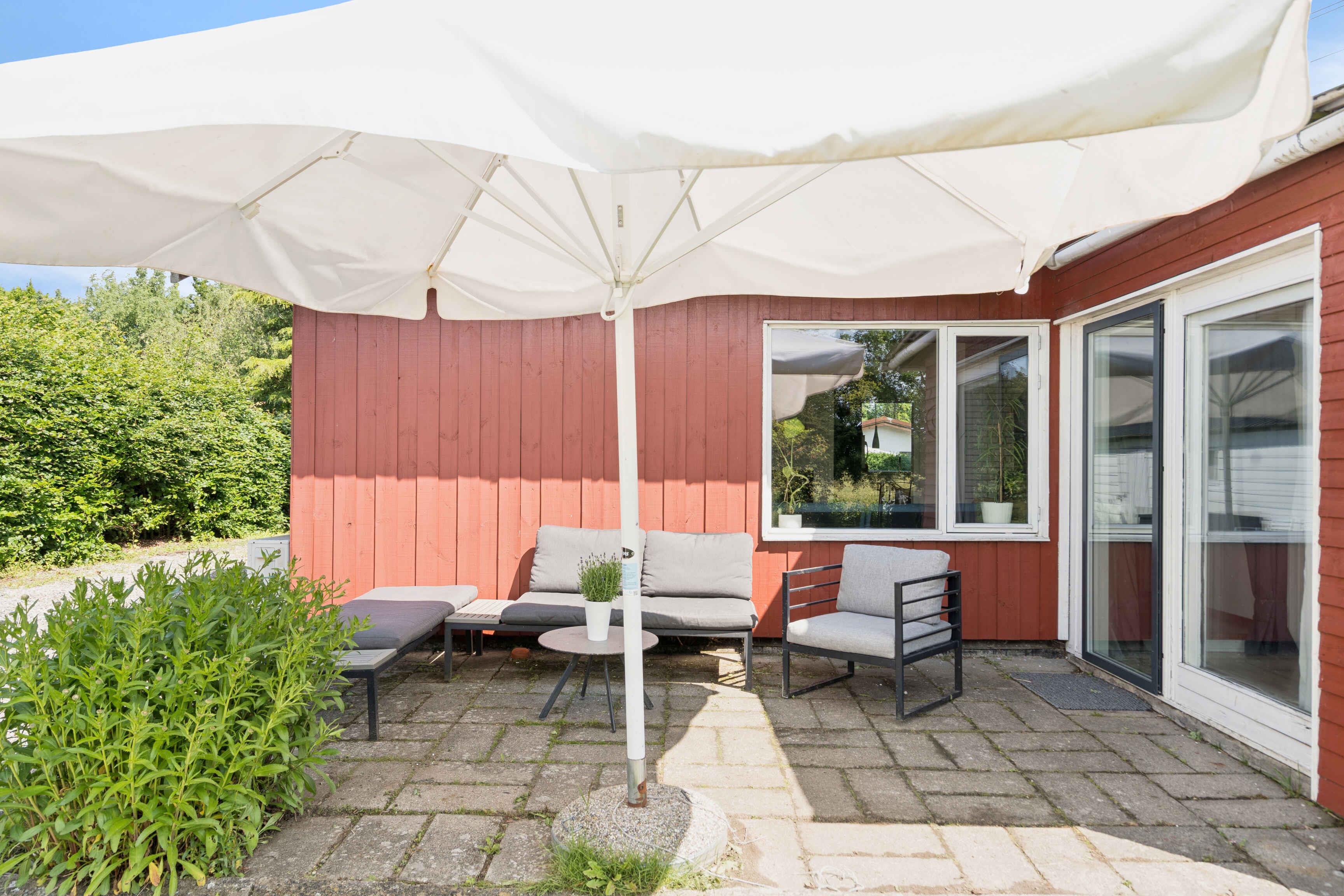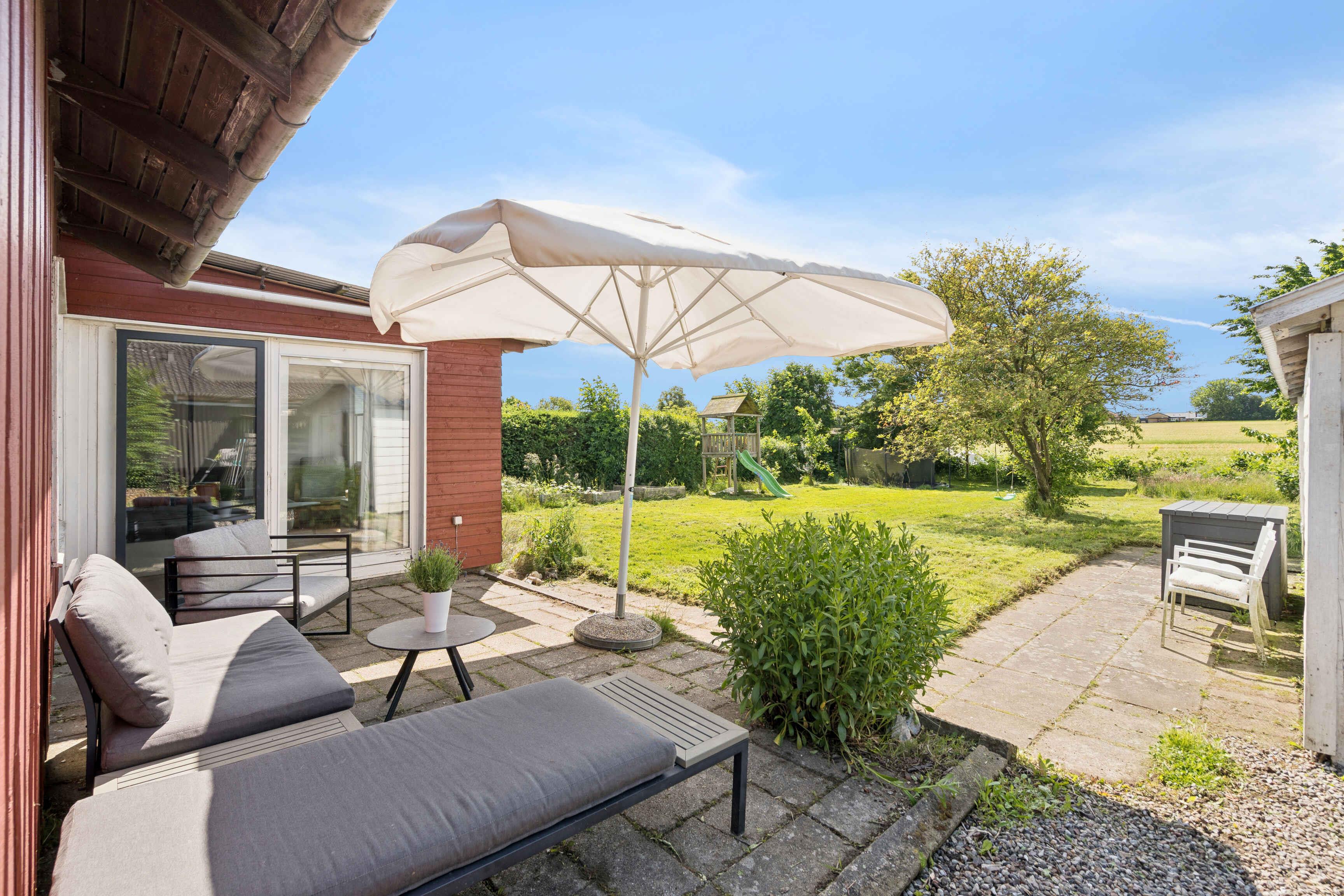Hyggeligt hus med rummelig have, hvor der er plads til, at børnene kan boltre sig. Fra huset er der kort afstand til både sø og dejlige badestrande. Fra terrassen og udestuen er der dejlig udsigt over den sommetider korngyldne mark.