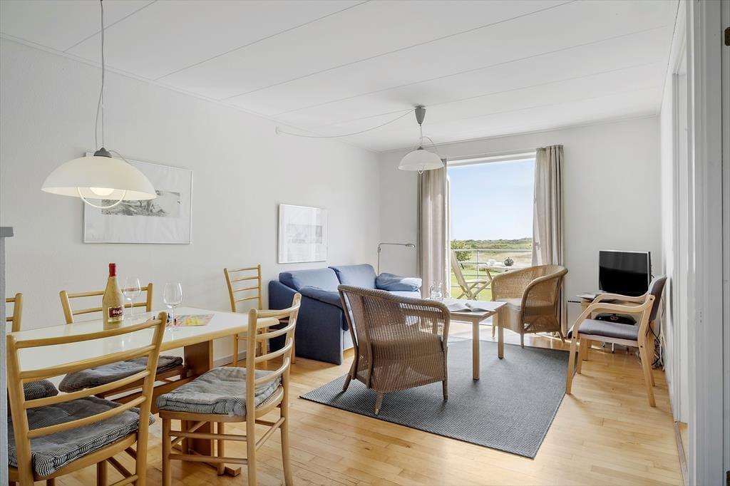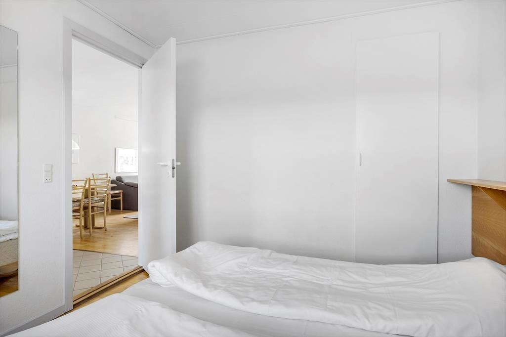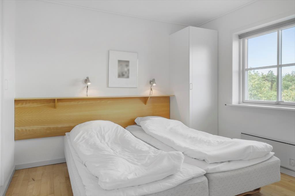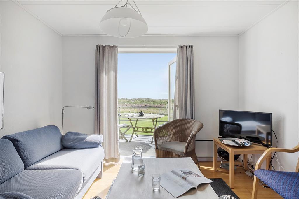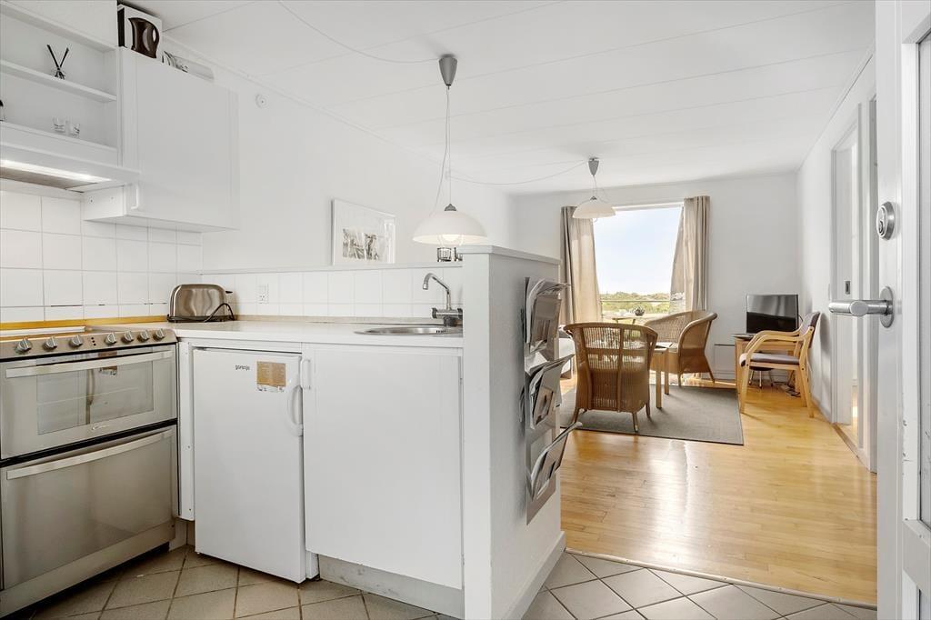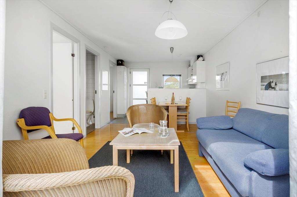 Inden døre i lejligheden er atmosfæren let og luftig. I opholdsrummet, som består af stue og køkken i åben forbindelse, er der gennemstrømmende lysindfald, og det nøje udvalgte møblement passer godt til den afslappede ferieboligatmosfære. Mod øst sørger den brede altandør for den uhindrede havudsigt, der som før nævnt også kan nydes fra det ene soveværelse. Udsigten fra lejlighedens andet soveværelse fejler bestemt heller ikke noget, for her kan I kigge ud på de skovklædte omgivelser. Planløsningen byder desuden også på et badeværelse, der ligesom resten af lejligheden fremstår pænt og velholdt.