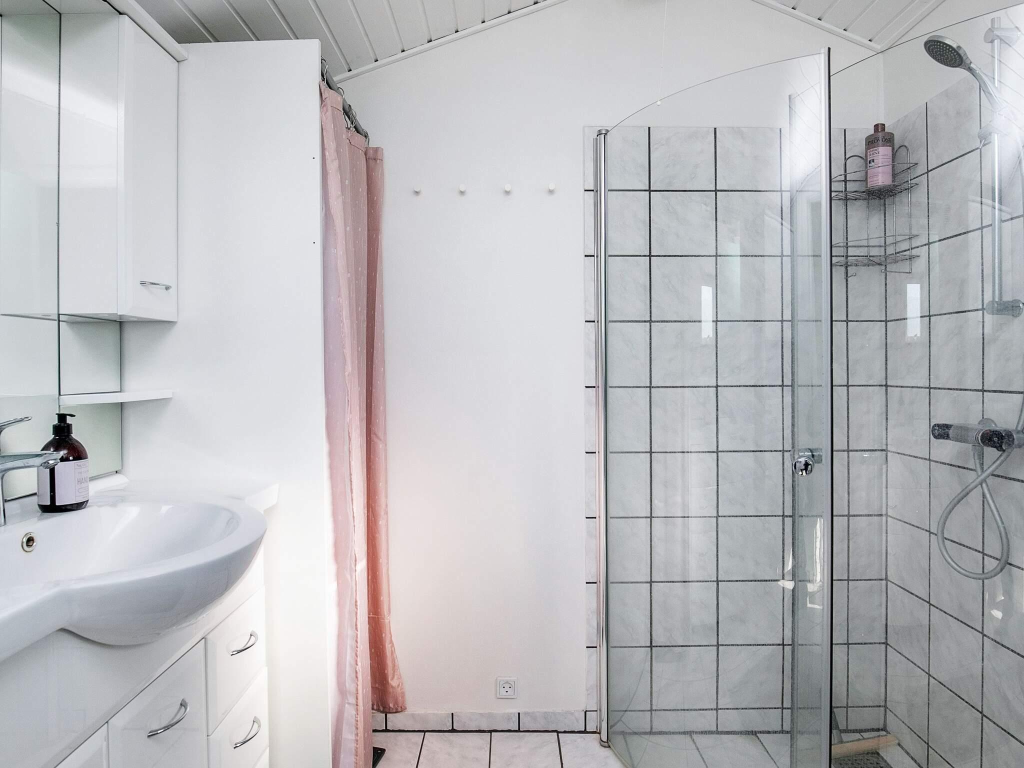 Badeværelse med badekar, bruser, toilet, samt gulvvarme. Der er en vaskemaskine.