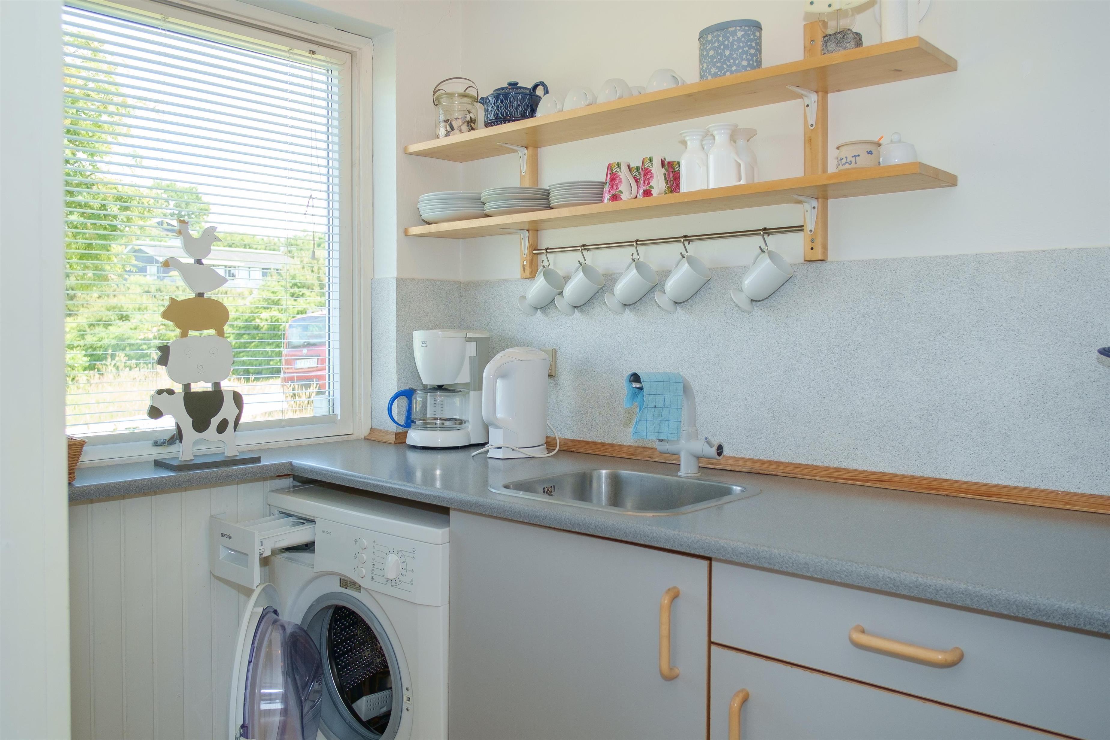 Ældre og velholdt sommerhus beliggende på kuperet naturgrund omgivet af flere terrasser med havemøbler og grill og med panoramaudsigt over Ebeltoft Vig. Lys og venlig indretning med hyggelig opholdsstue med pejs med pejseindsats, TV med parabol og stereoanlæg med CD-afspiller. Funktionelt køkken med kombineret elkomfur/opvaskemaskine, køleskab med lille fryser og mikrobølgeovn. Godt flisebadeværelse med bruseniche og gulvvarme. Vaskemaskine. Husets sovepladser fordeler sig på 2 soveværelser: 1 med dobbeltseng og 1 med enkeltsenge.