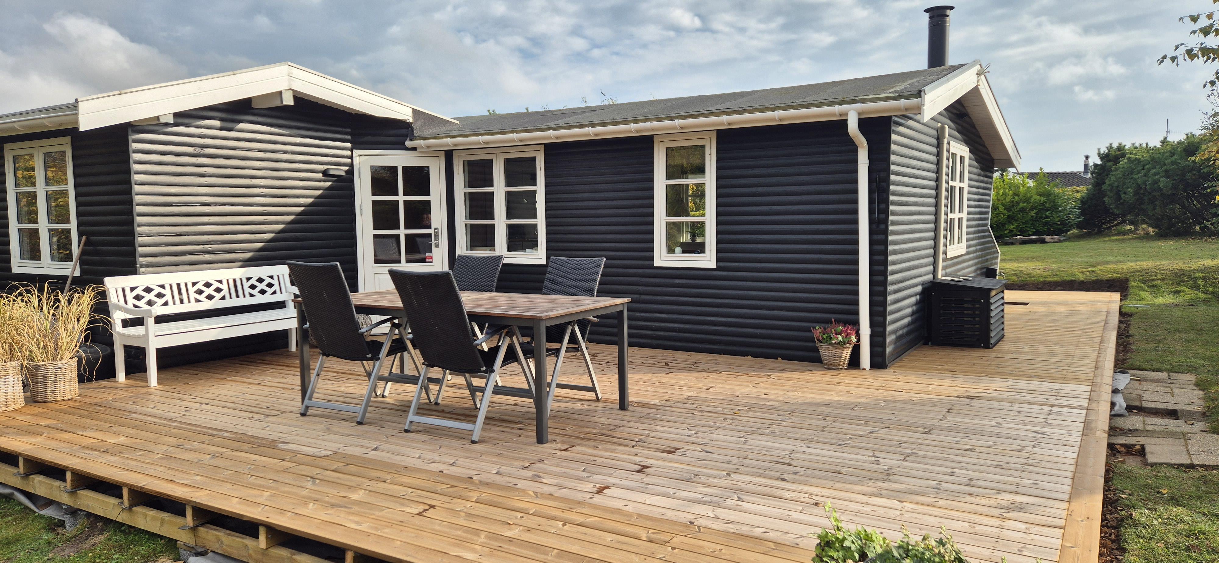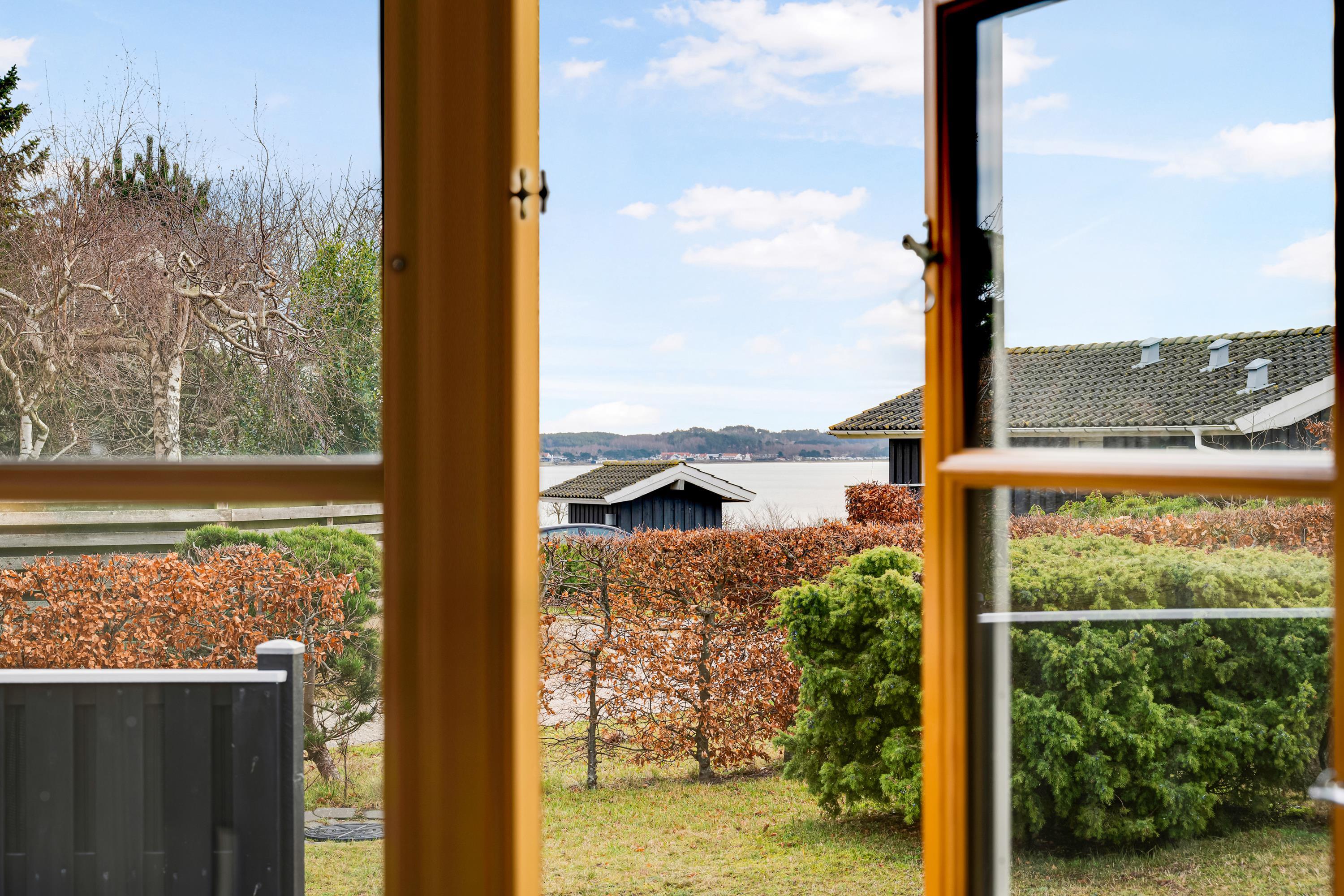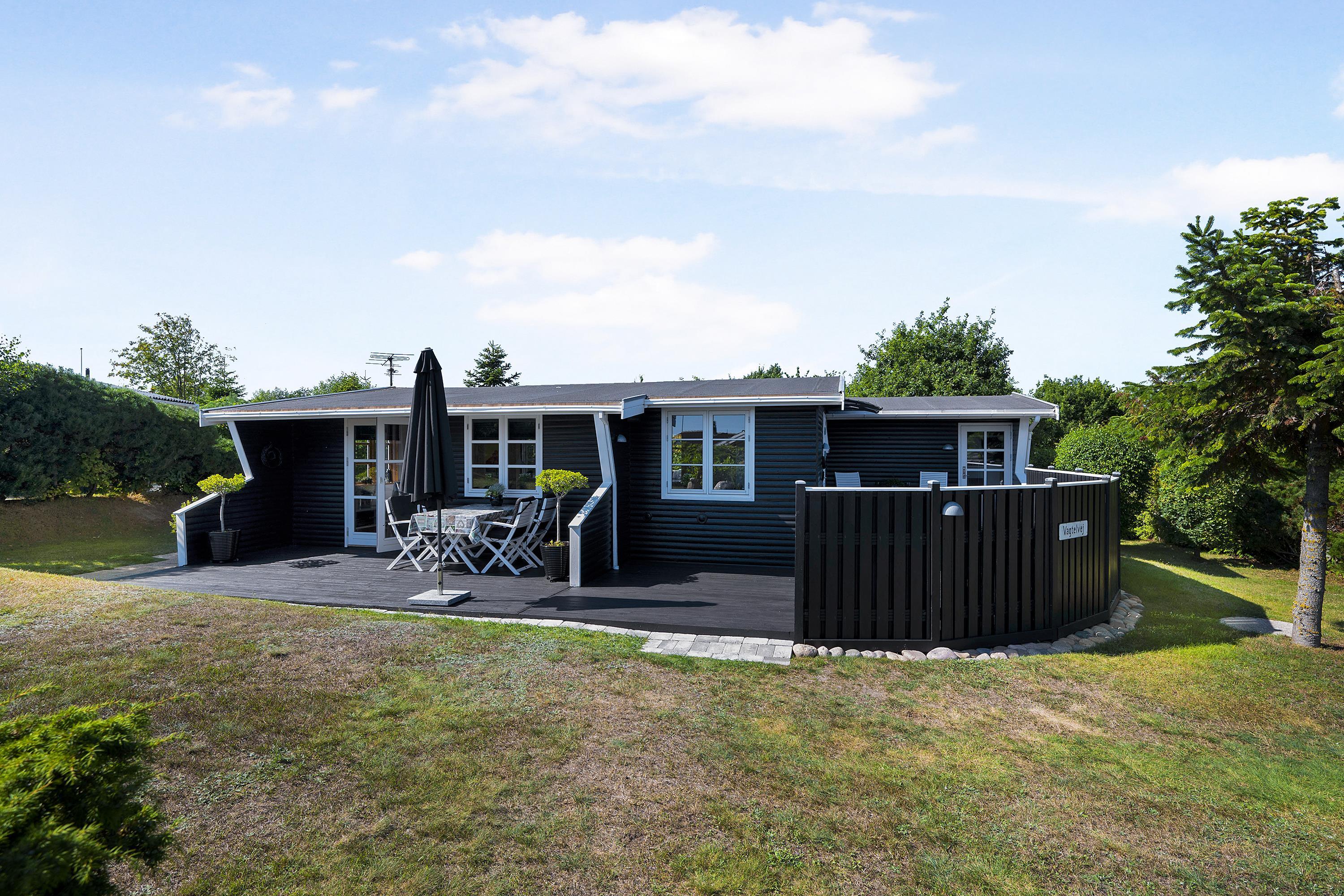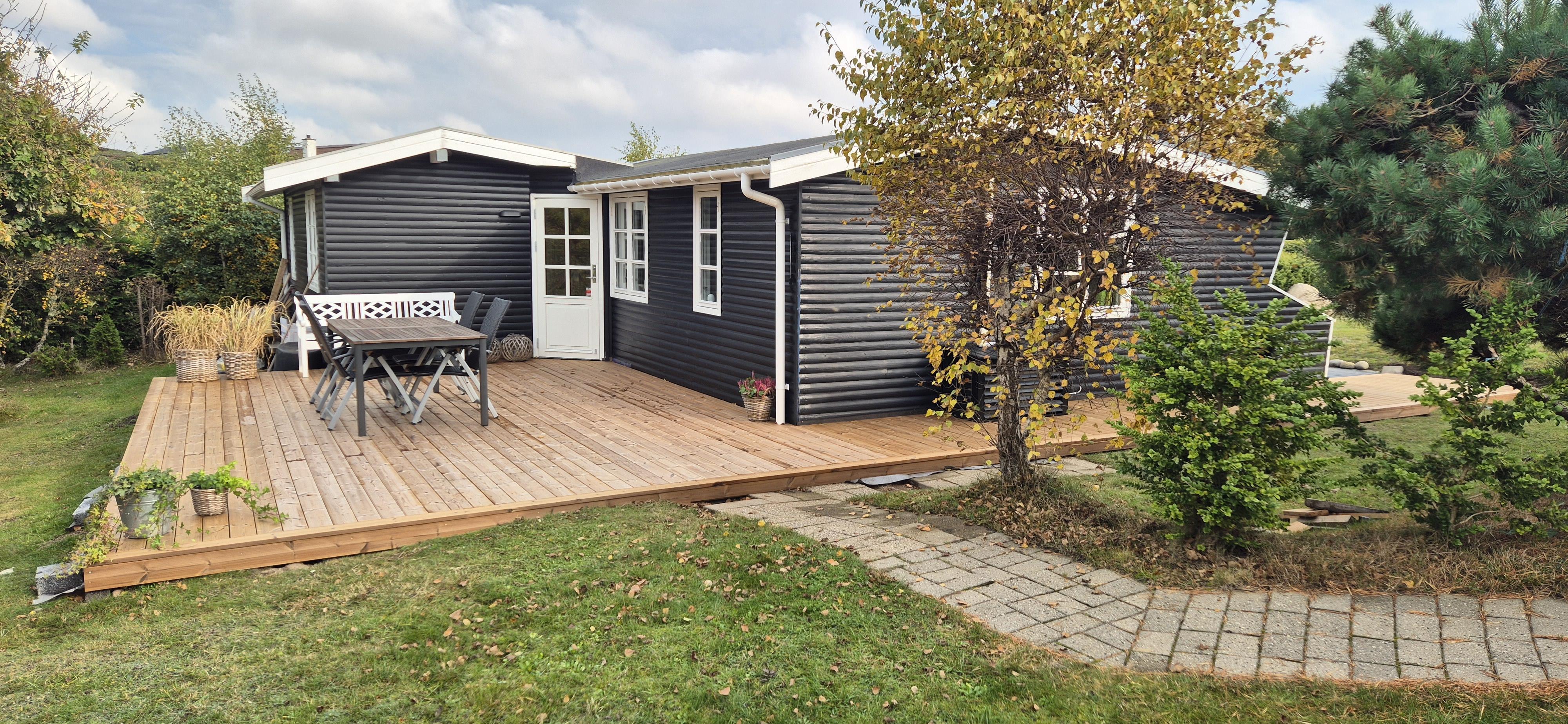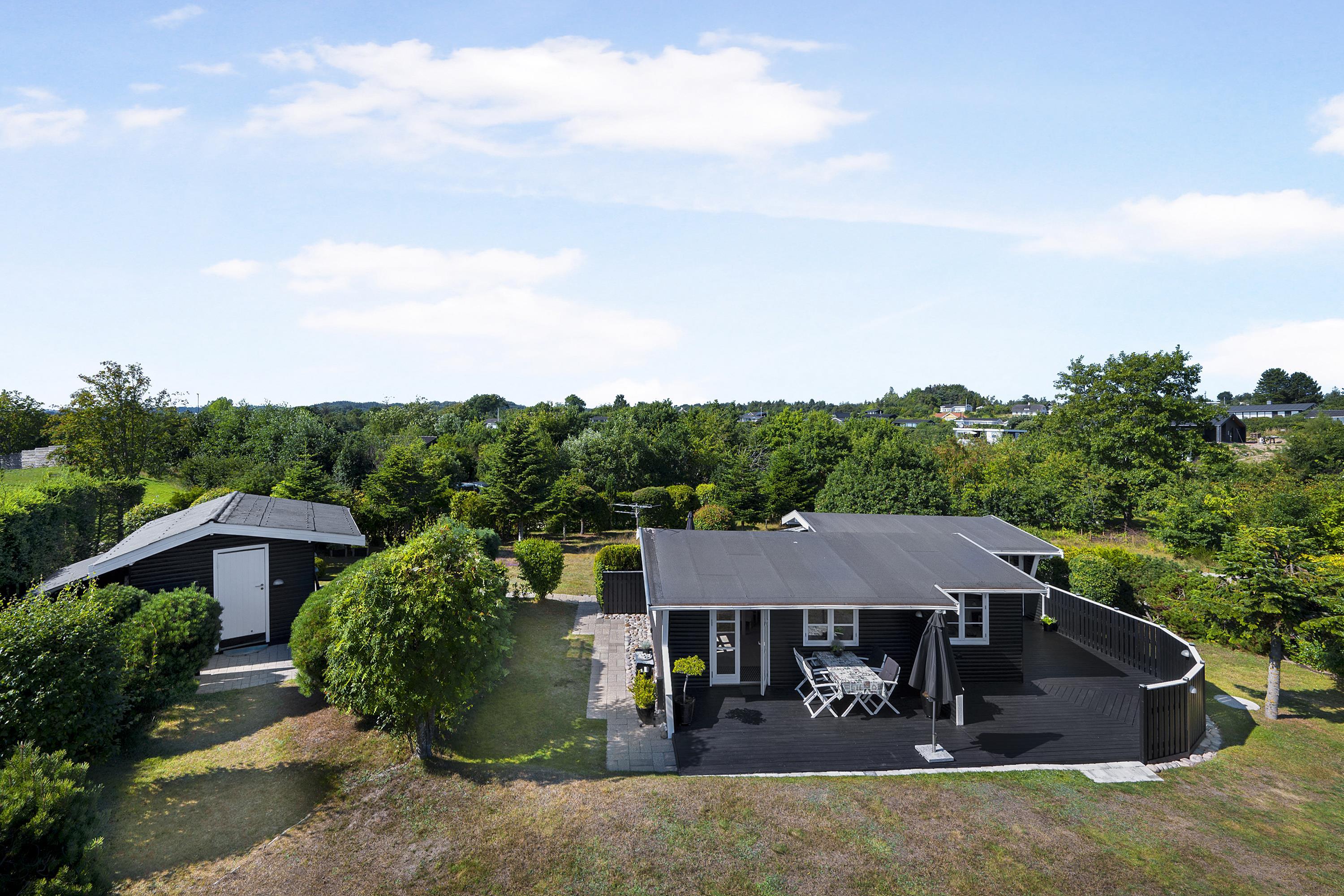 Huset er beliggende på en skøn grund med flere terrassearealer med havemøbler samt en grill. Her er mulighed for at nyde både solopgang og solnedgang. I haven finder man et bålsted, som man kan samles om en lun sommeraften og lave snobrød. Fra grunden har man "havkig" til vandet og det tager blot 10 min gang, så er man ved den dejlige sandstrand.
