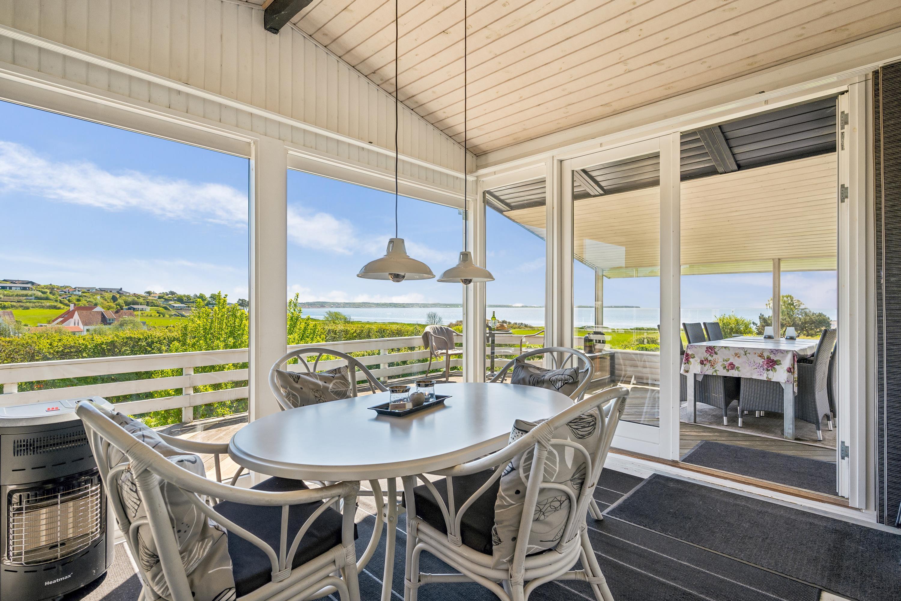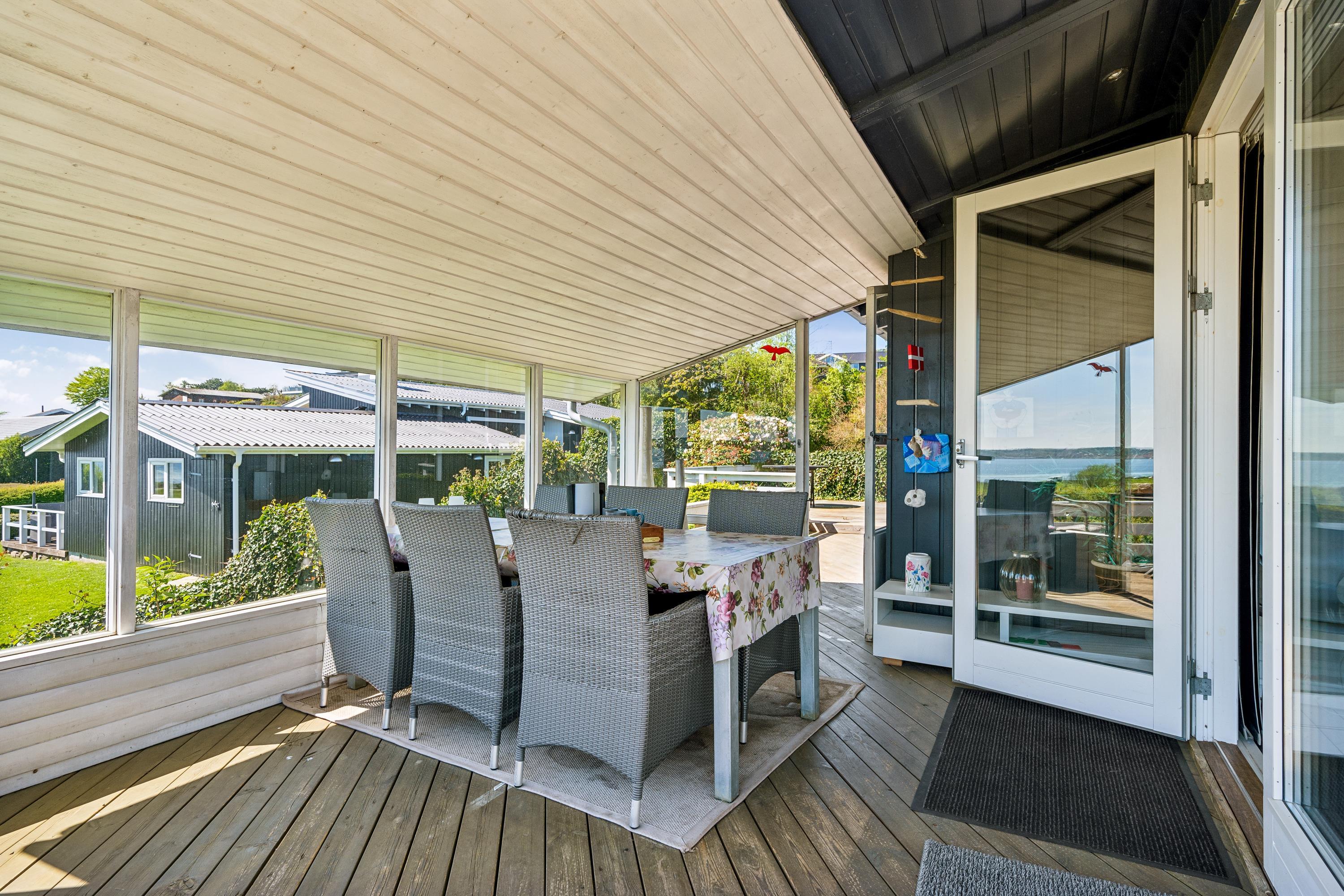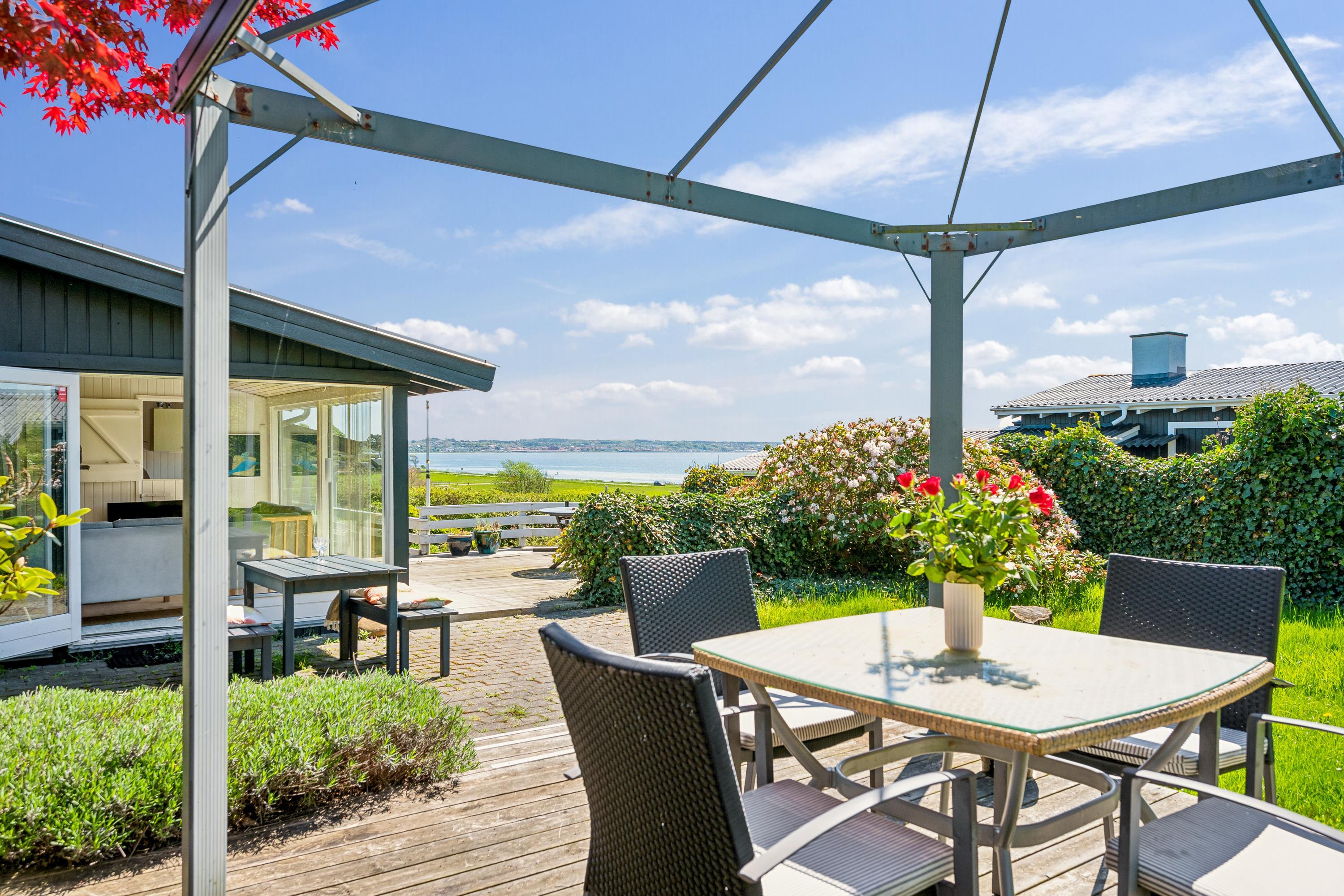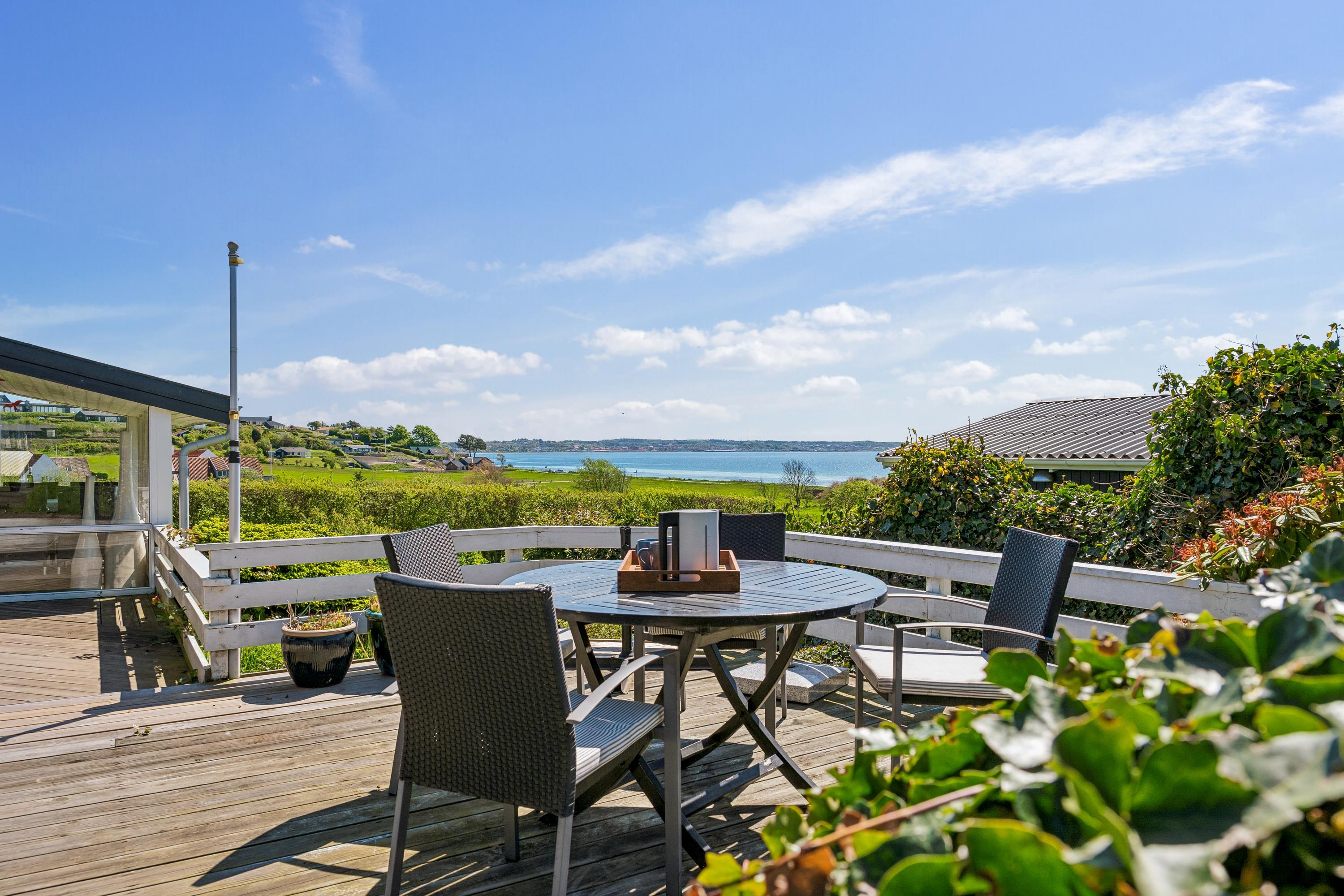 Med den mest fantastiske beliggenhed finder man dette skønne feriehus, som er højtbeliggende på en skrående grund. Såvel fra grunden som fra huset har man en storslået udsigt over vandet. Her finder man en skøn stue, hyggeligt møbleret med gode møbler, brændeovn og varmepumpe samt udgang til en af husets terrasser med havemøbler. Dejligt køkken med b.la. opvaskemaskine. Husets sovepladser finder man i tre gode værelser, heraf et værelse med en dobbeltseng, et værelse med en køjeseng og et værelse med to enkelt senge. To dejlige badeværelser, begge med bruseniche. Desuden er der et lille bryggers med vask og vaskemaskine. Hyggelig integreret havestue med spiseplads og hvorfra der er udgang til overdækket terrasse. Til de små feriegæster er der en høj barnestol, en barneseng og et babybadekar. Der chromecast samt stor Boxer tv pakke med tyske og nordiske kanaler. Ved huset er der flere dejlige terrassearealer med gode havemøbler og gasgrill.