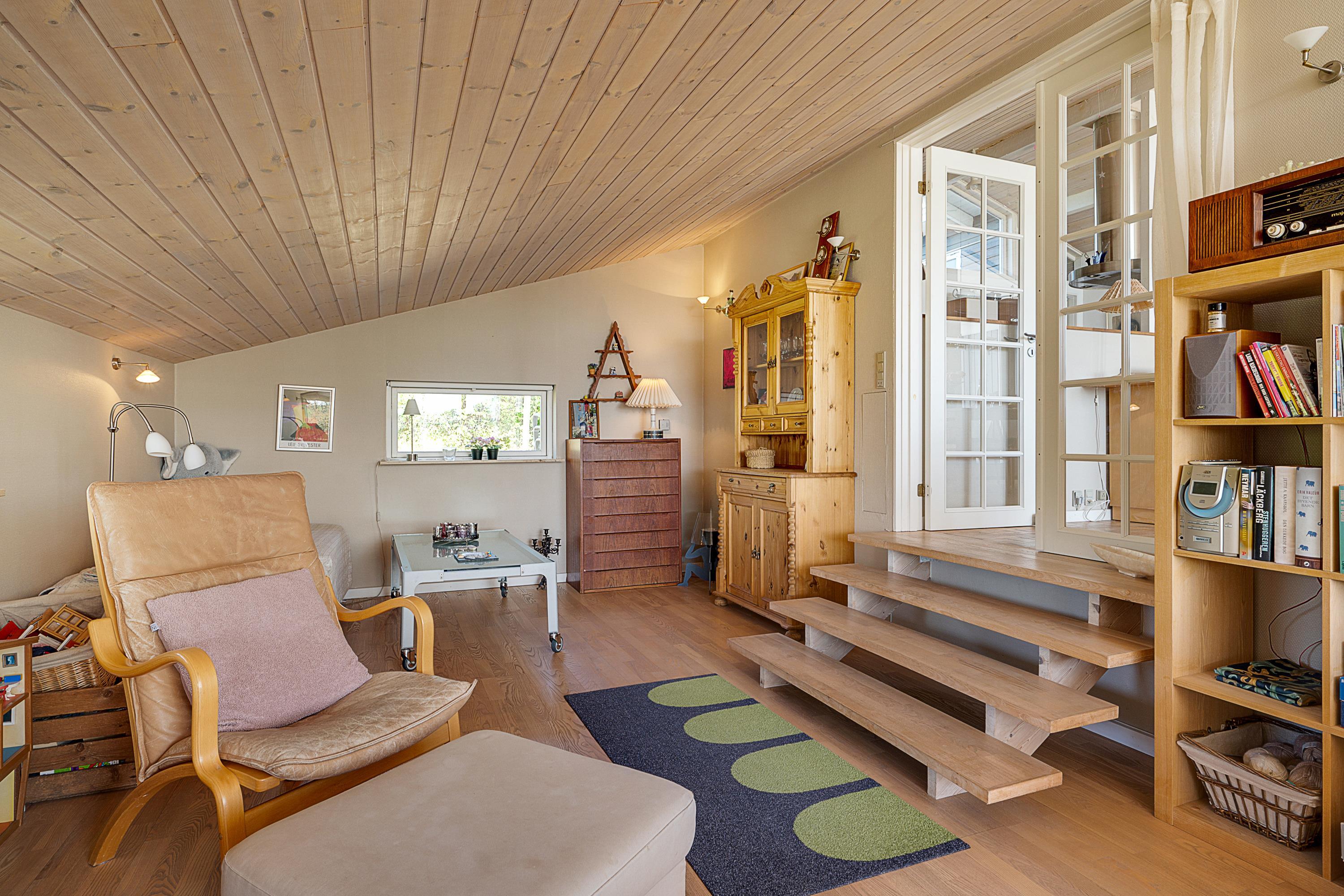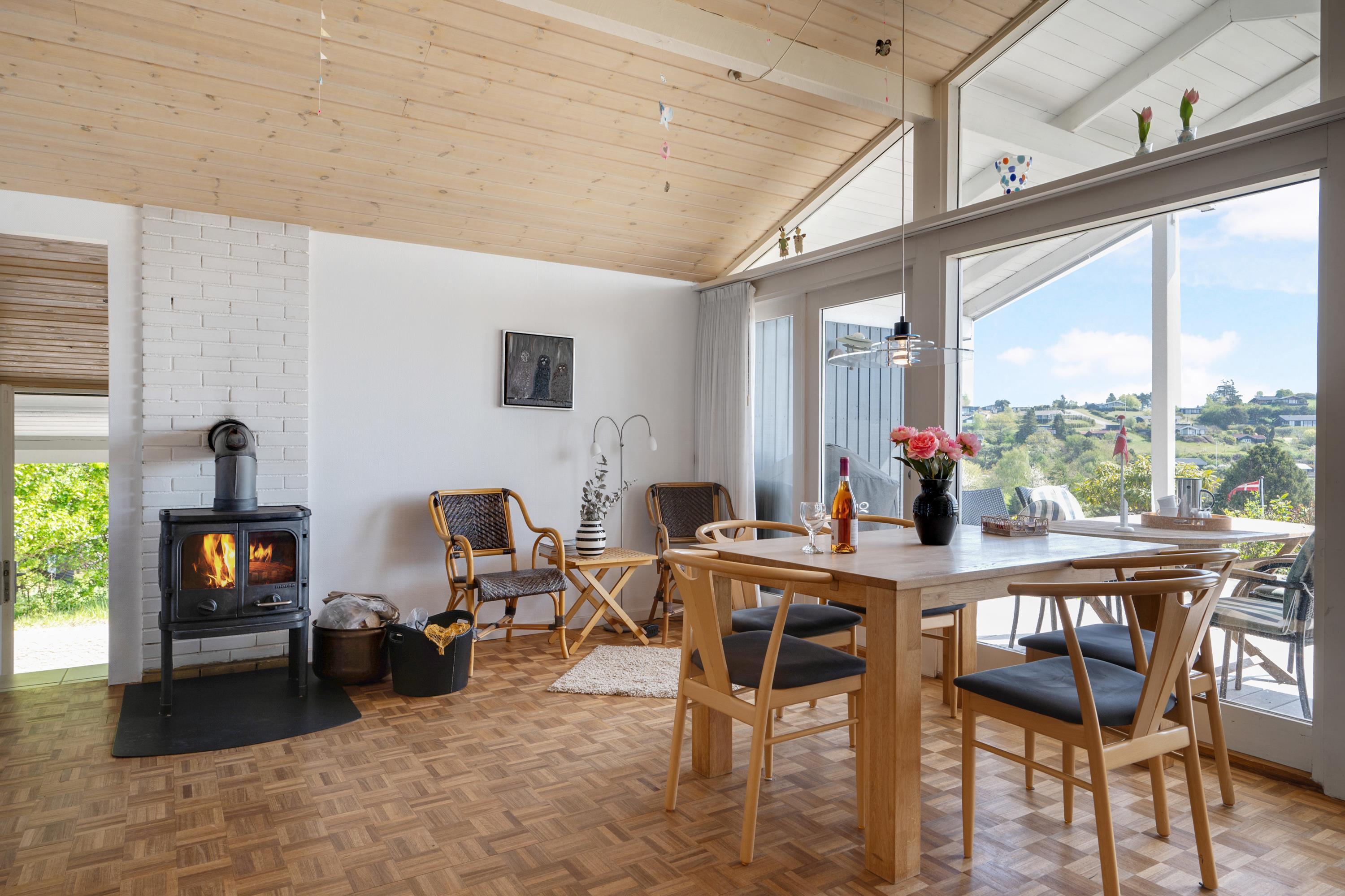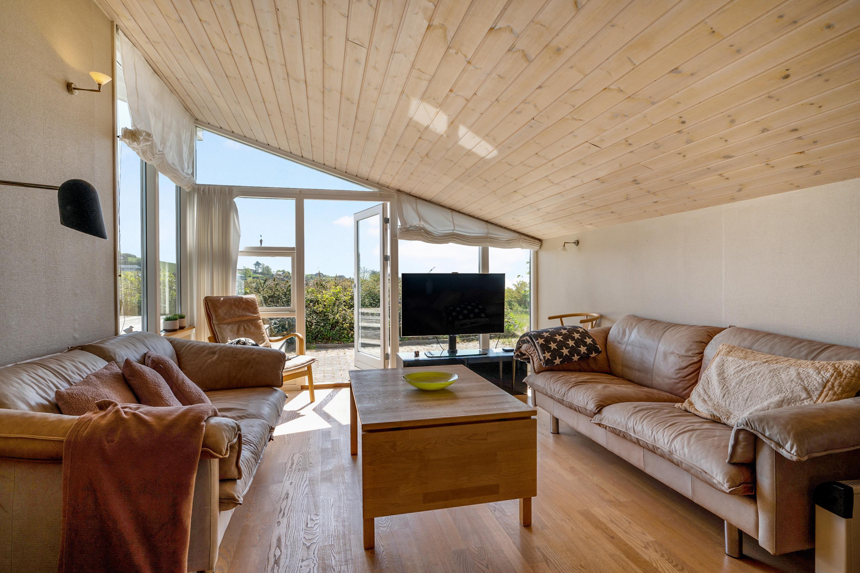 Fra entréen kommer man ind i stor, lys opholdsstue/alrum med lofter til kip ligesom i resten af huset og med udgang til terrasse, spiseplads til 7 personer og brændeovn. Det veludstyrede, dejlige køkken med god arbejdsplads ligger i åben forbindelse med alrum og har keramiske kogeplader, indbygningsovn, køle-/fryseskab, opvaskemaskine samt mikrobølgeovn. En lille trappe fører fra alrummet ned til opholdsstuen, som også har udgang til terrasse samt sofamøblement og fladskærms-TV med chromecaster – bemærk, at der ingen kanaler er tilkoblet, alt indhold skal streames fra PC eller andet medie. Lækkert og rummeligt badeværelse med gulvvarme, bruseniche og skabsarrangement, og i bryggerset er der desuden vaskemaskine, strygebrædt og strygejern. De 7 sovepladser fordeler sig på 2 lyse og gode soveværelser med dobbeltseng, 1 dobbelt sovesofa i alrummet samt 1 enkeltseng i et hjørne af opholdsstuen. Internetadgang.