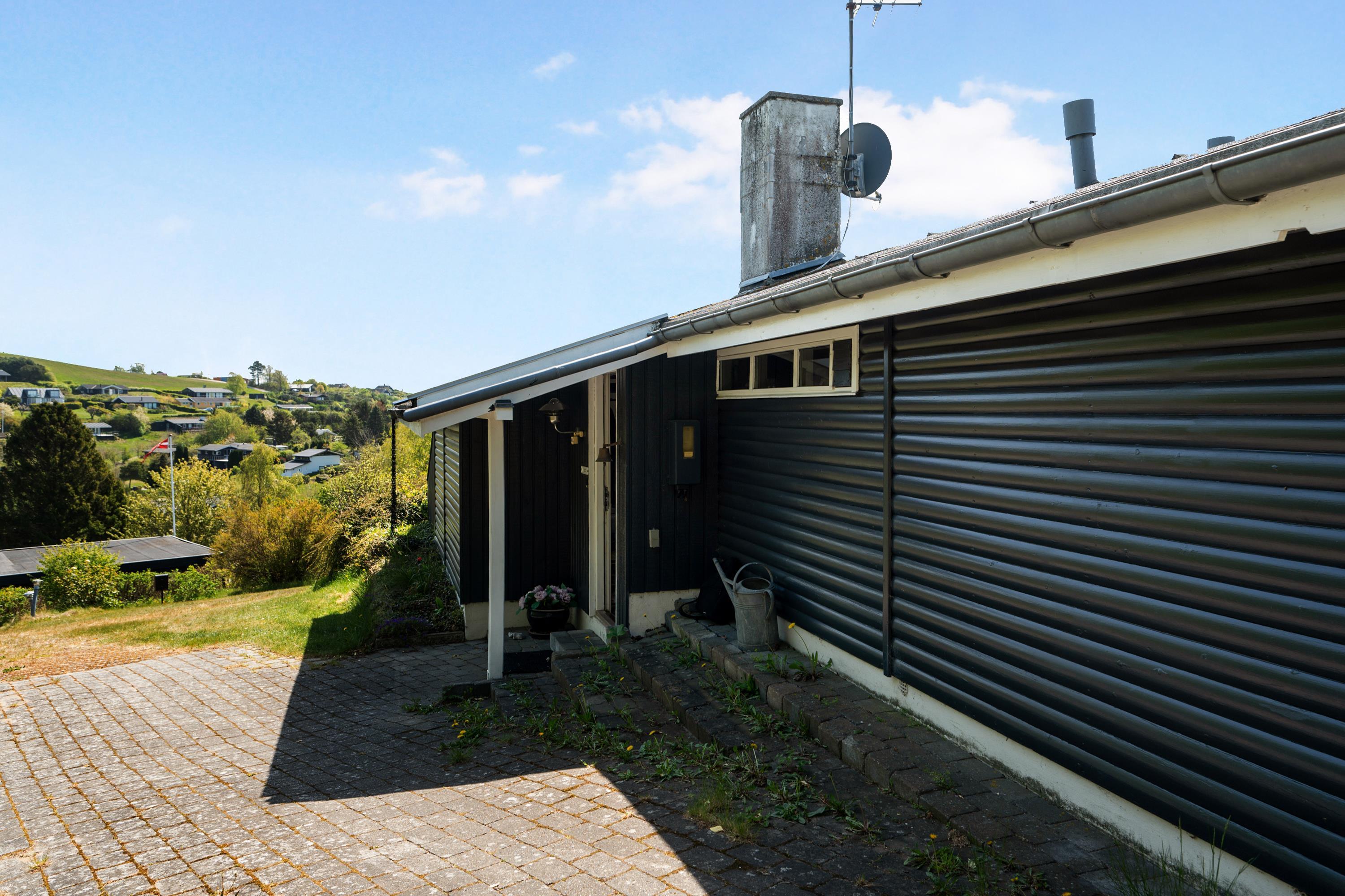 På højt beliggende naturgrund med den flotteste udsigt over Ebeltoft Vig og Handrup Bakker ligger dette dejlige, velholdte, ældre hus, som emmer af hygge og sommerhusstemning. Huset er omgivet af skønne terrasser og solkroge, bl.a. stor, syd- og vestvendt træ-/fliseterrasse, delvist overdækket, med gode havemøbler, liggestole, parasol og grill. En lille ferieoase for et eller to par eller børnefamilien.
