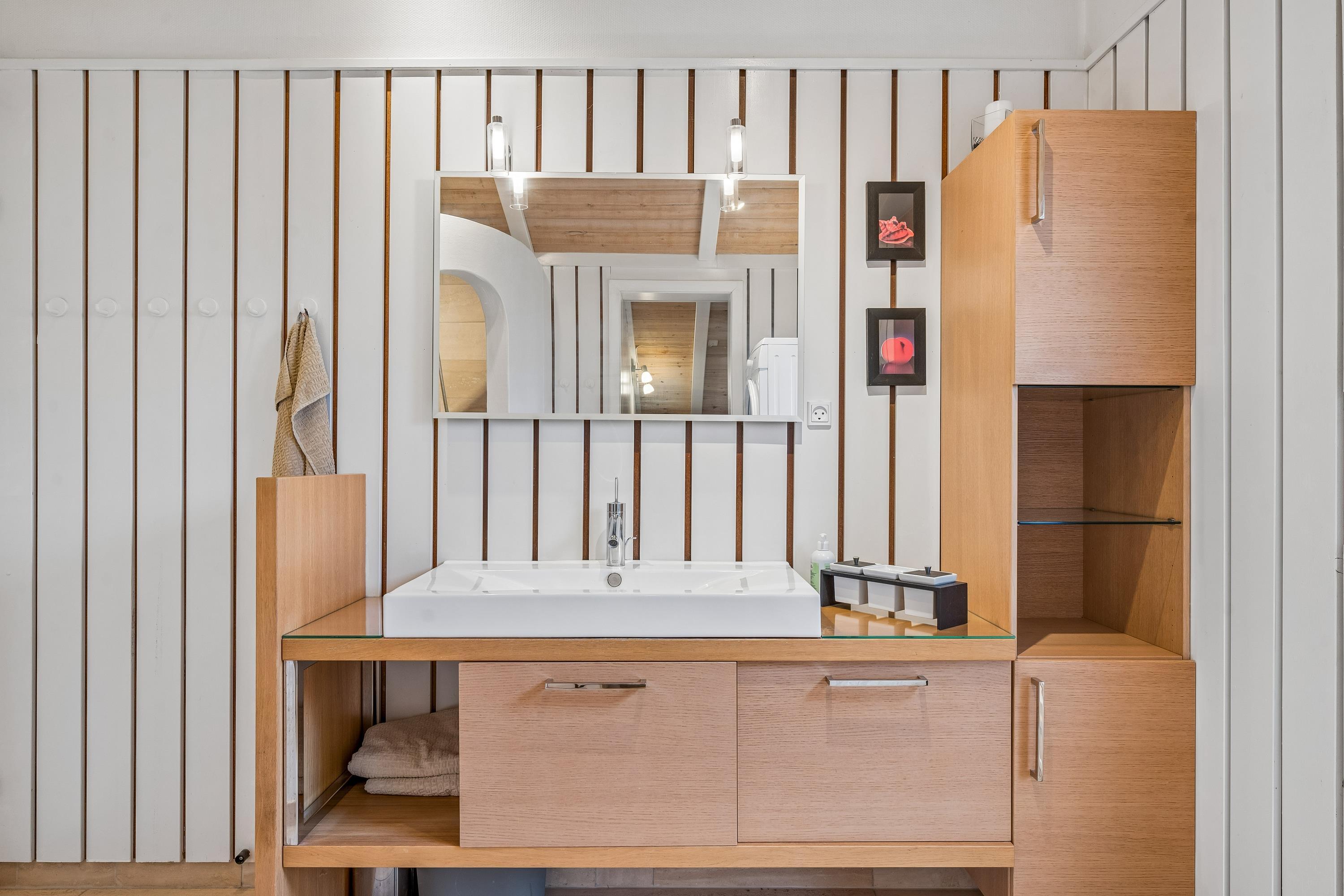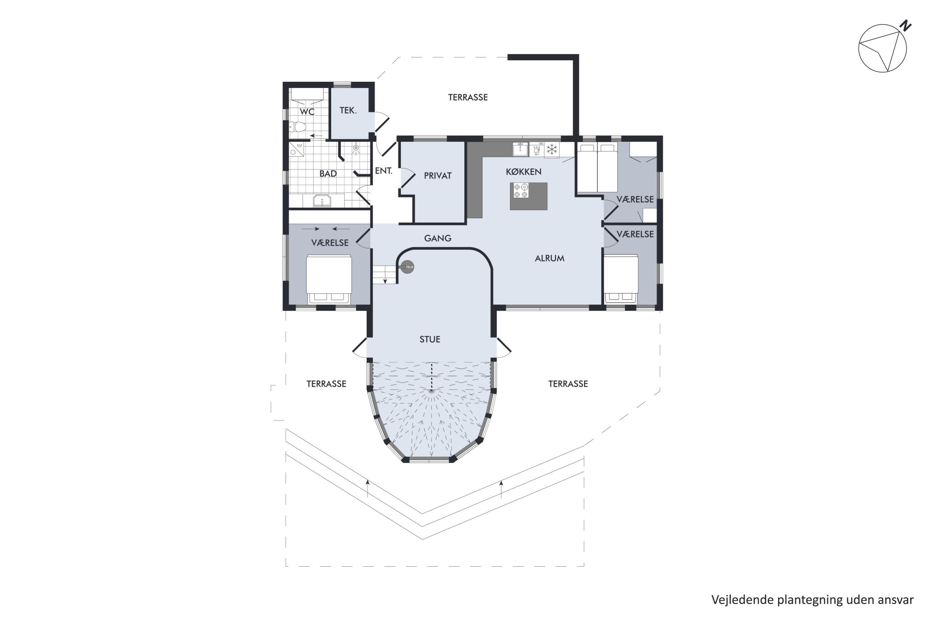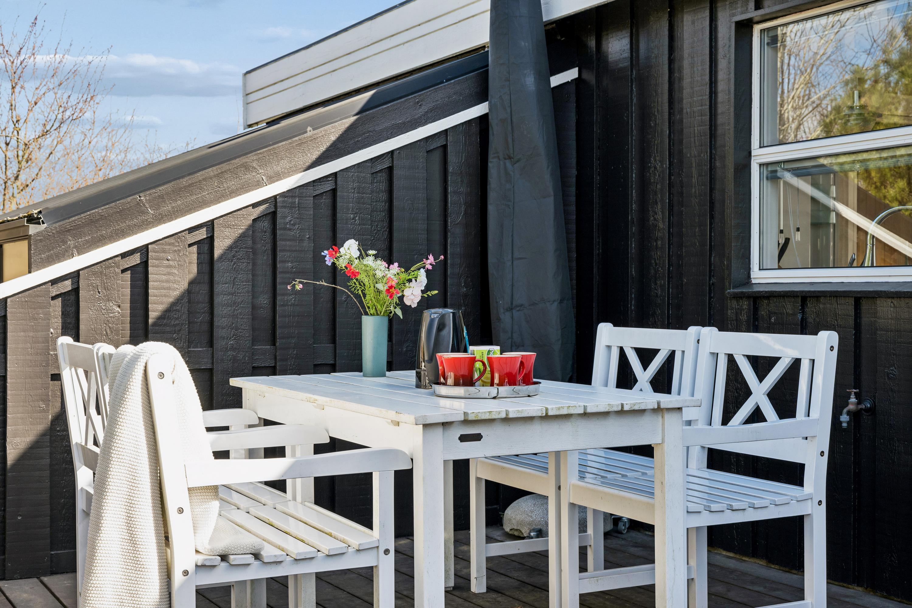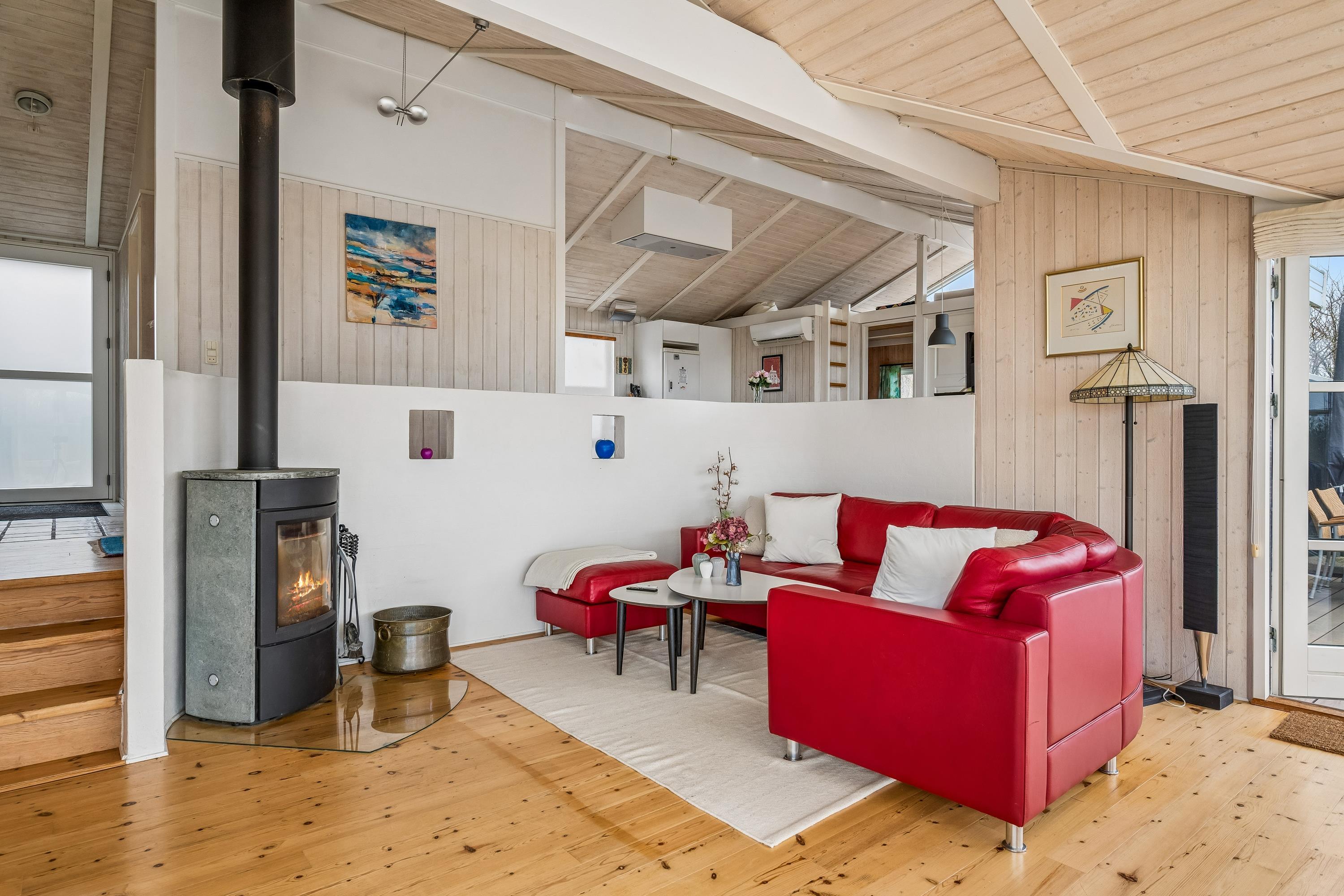 Det store badeværelse har gulvvarme, bruseniche samt vaskesøjle med vaskemaskine og tørretumbler. Den forsænkede opholdsstue med komfortable møbler og brændeovn giver hygge og varme, og herfra er der direkte adgang til en dejlig terrasse med havemøbler, hvorfra man kan nyde den smukke udsigt til vandet.