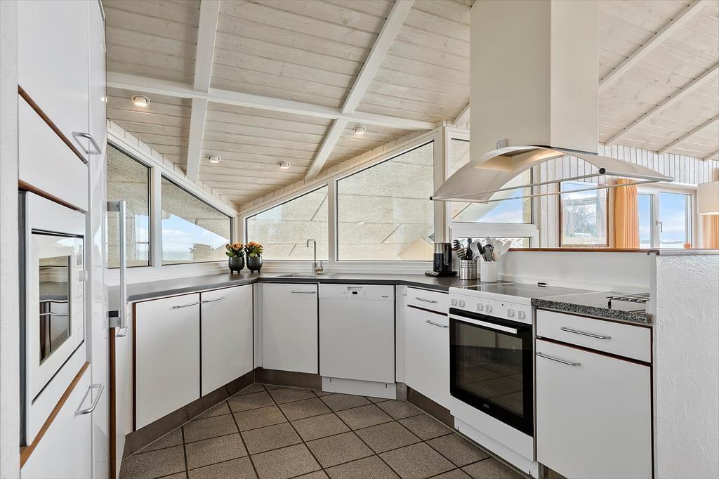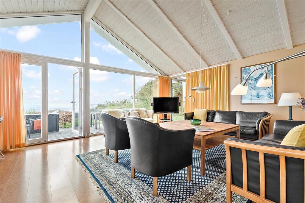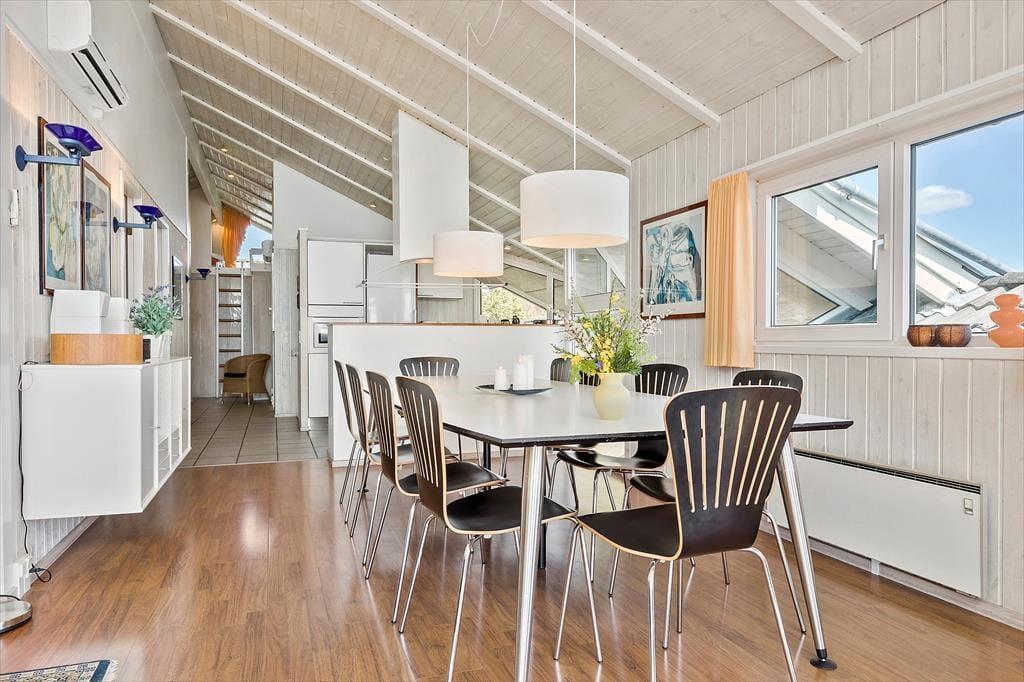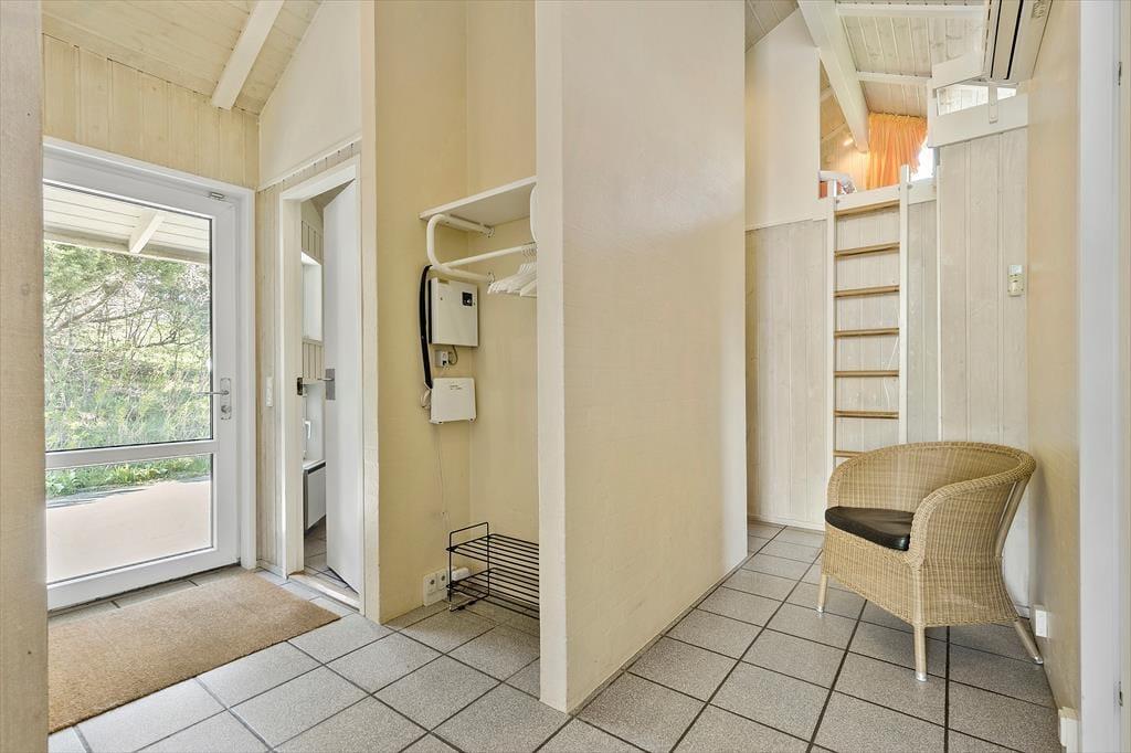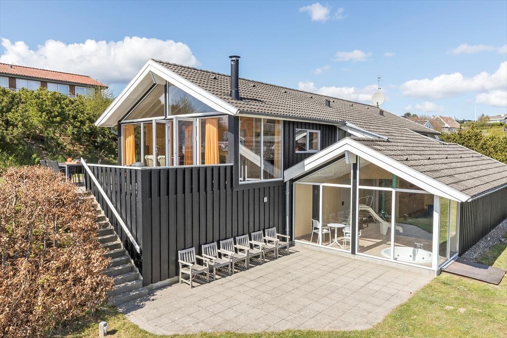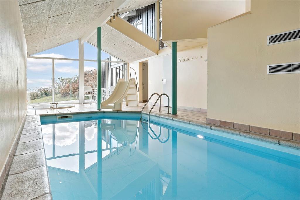 Stuen byder på hyggelig indretning af høj kvalitet og når brændeovnen er tænd kan roen virkelig falde over alle som er der.Fra køkkenet og spisestuen kan man se poolen og dermed holde øje med børnene.Huset byder desuden på 5 værelser samt en stor hems med børneståhøjde og på hemsen er der et ekstra tv, og parabol.Der er 2 badeværelser og ekstra bruser i pool rummet. Badeværelserne har gulvvarme.