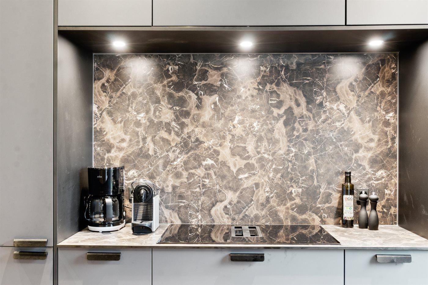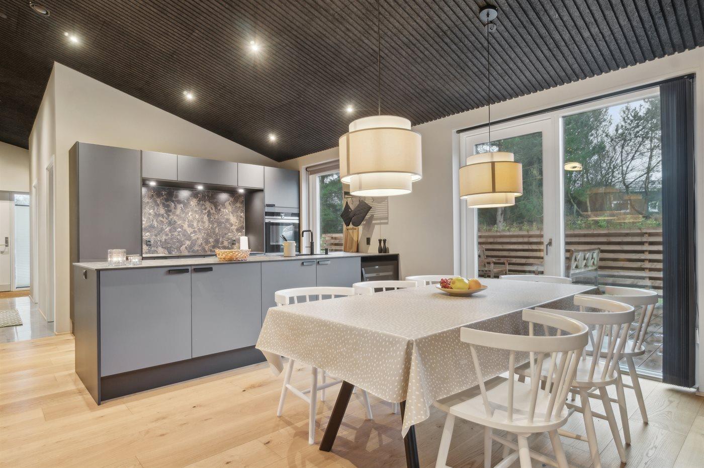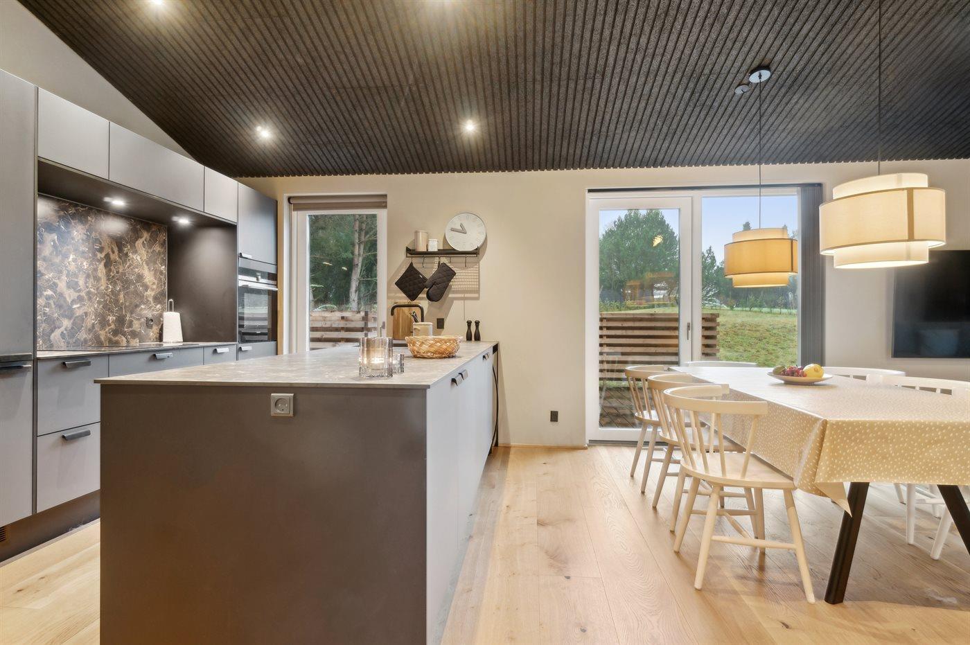 Køkkenet er udstyret med 1 køleskab. Der er 4 induktionskogeplader, varmluftovn, mikrobølgeovn samt opvaskemaskine.