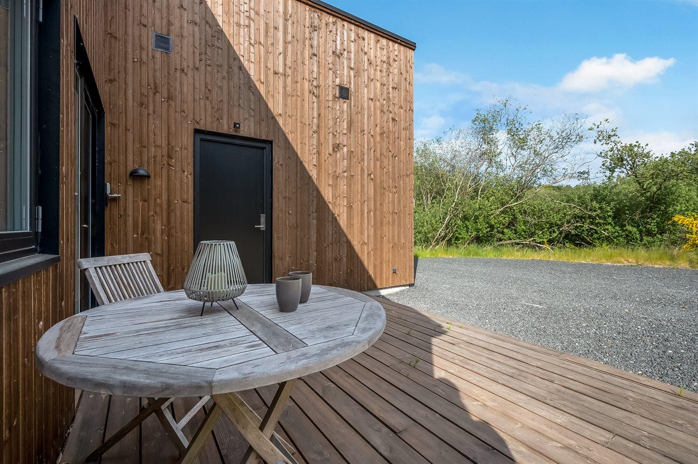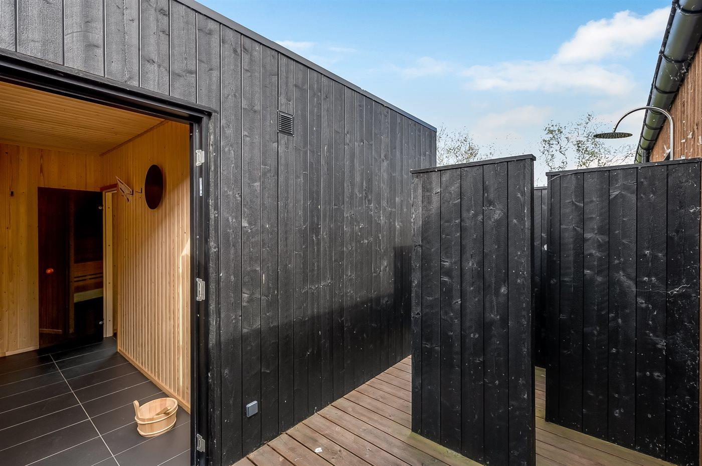 Udenfor god og stor terrasse samt udesauna og vildmarksbad. Udebruseren er til rådighed fra uge 17 til og med uge 44. Feriehuset ligger på en dejlig, stor grund i fredelige omgivelser.
