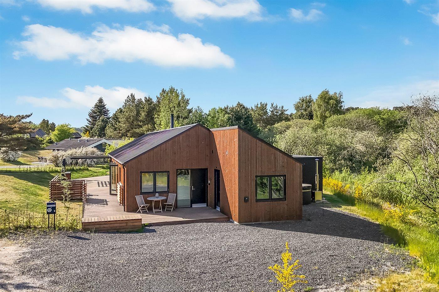 Nybygget sommerhus ved Handrup Strand med sauna, vildmarksbad og aktivitetsrum til familien.