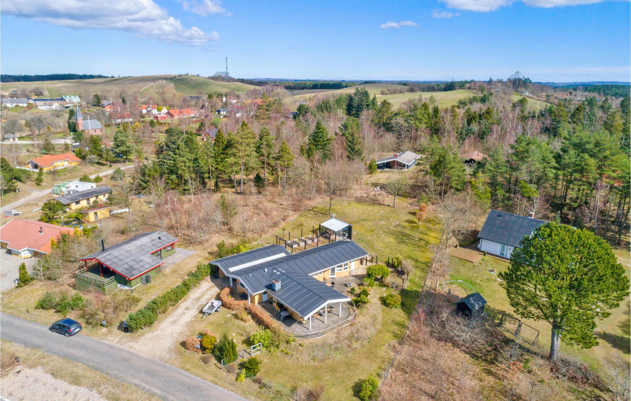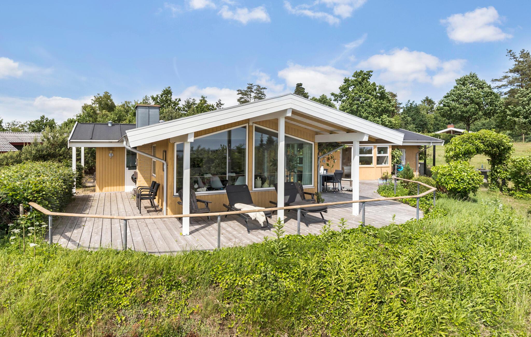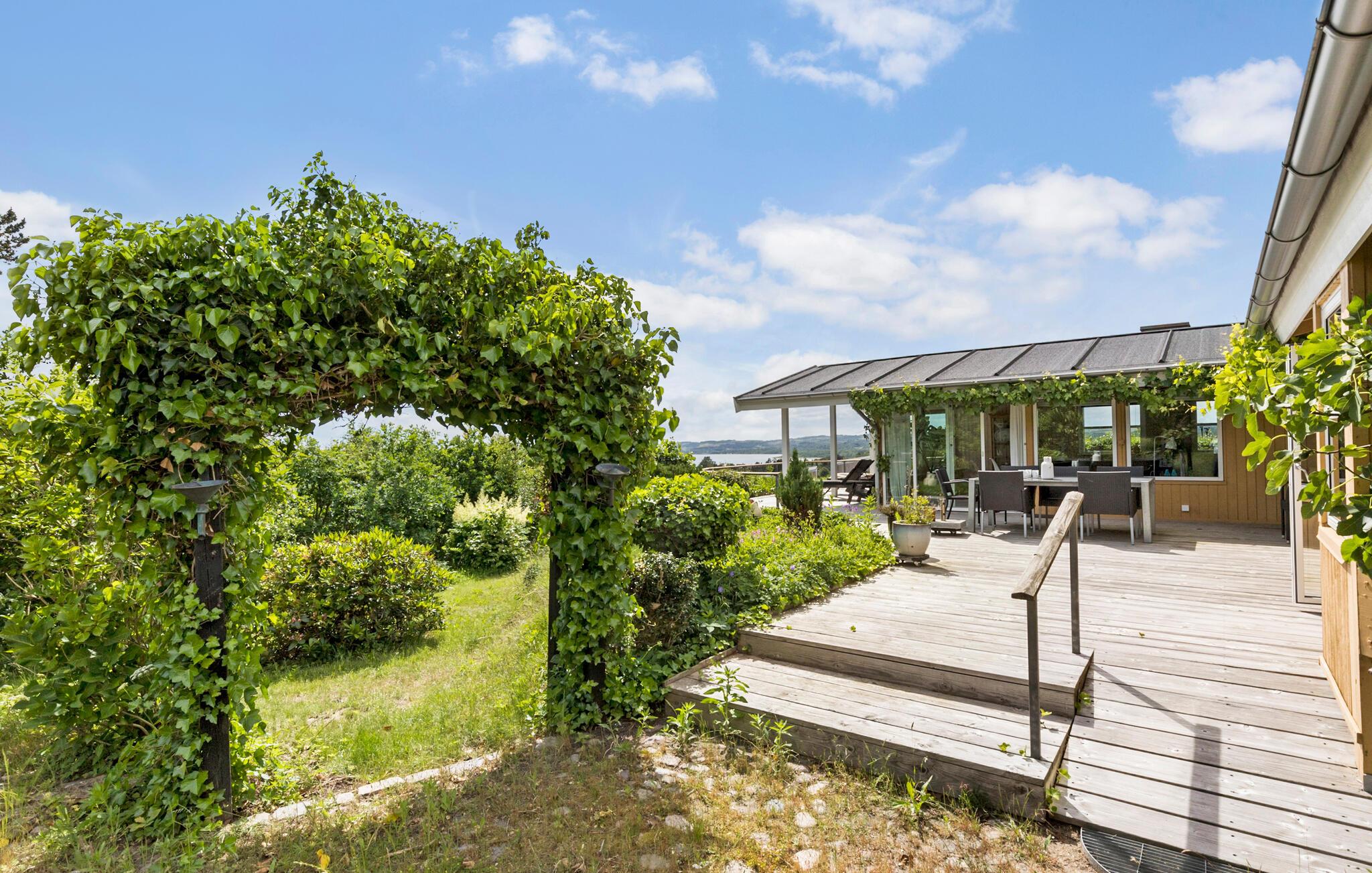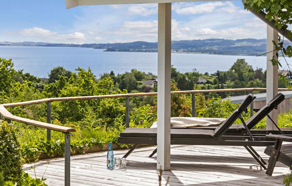 Nyd en moderne feriebolig med panoramaudsigt over Ebeltoft Vig og kort afstand til stranden ved Handrup Strand.