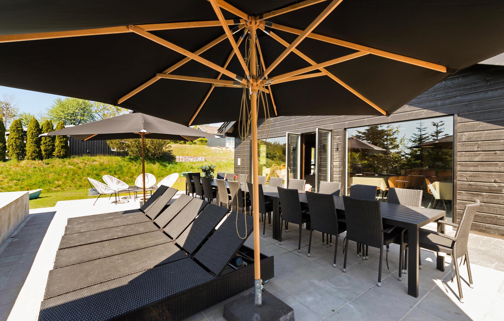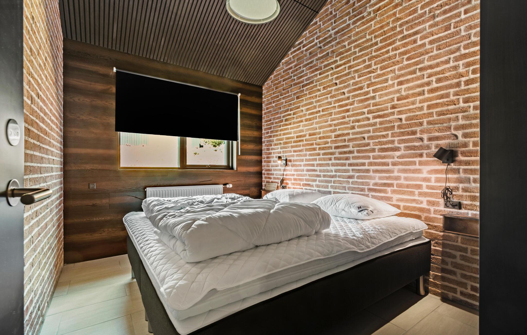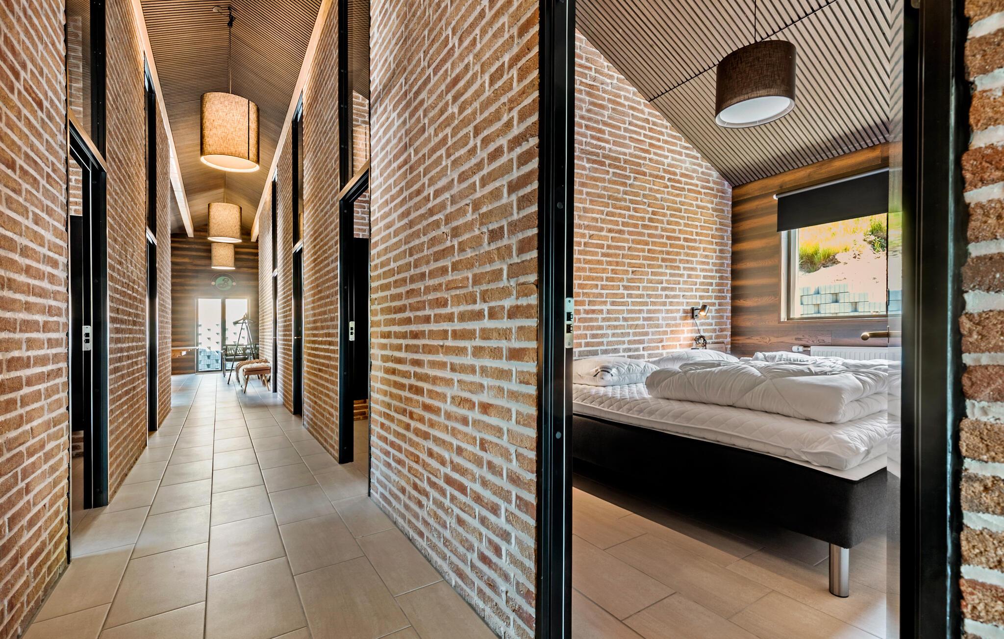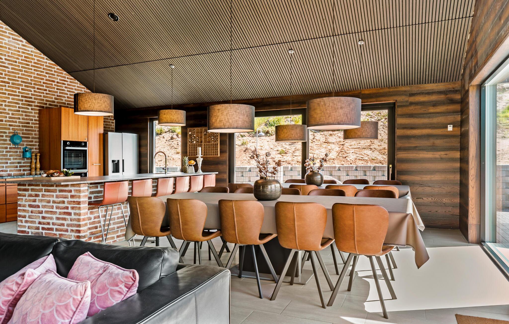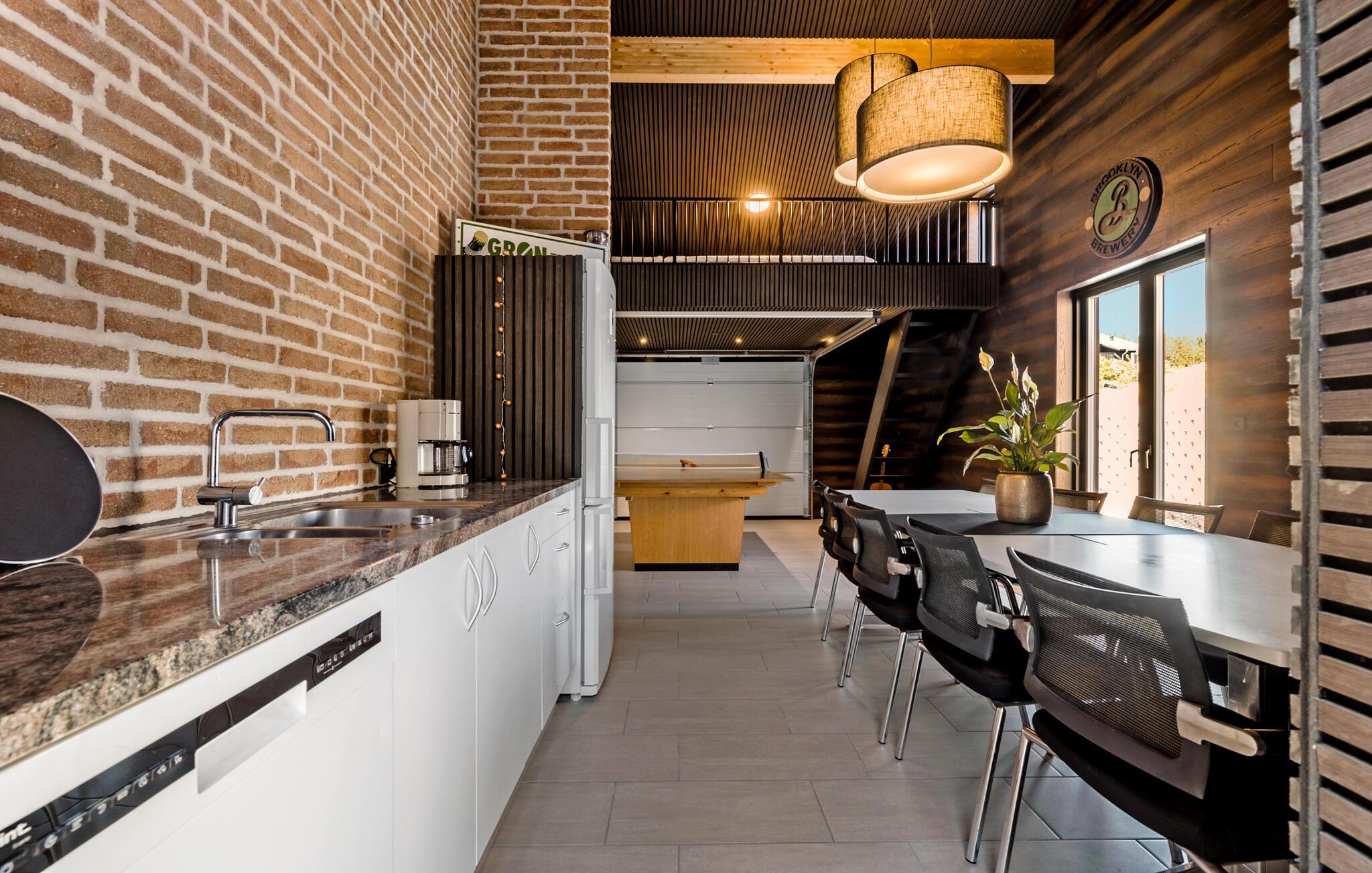 Hvis I er på udkig efter en bolig til årets sammenkomst med den store familie eller en vennefamilie, og hvis I ikke går af vejen for komfort og underholdning på tværs af generationerne, er I kommet til det helt rette sted. Dette flotte og familievenlige hus ligger kun en kort gåtur fra stranden, og indretningen fremtræder virkelig attraktivt med loft til kip, rå murstensvægge og store vinduespartier, der giver den åbne stue et lyst og luftigt udtryk. Hvis vejret viser lidt tænder, kan I tænde op i brændeovnen, der giver varme og stemning til madlavningen i det moderne køkken, mens andre duellerer ved bordtennisbordet eller dækker op ved spisebordene med plads til alle og en dejlig udsigt. Lad en dejlig dag gå på hæld med snacks og en hyggelig filmaften i det komfortable sofaområde, mens I lægger planer for de kommende dage.
