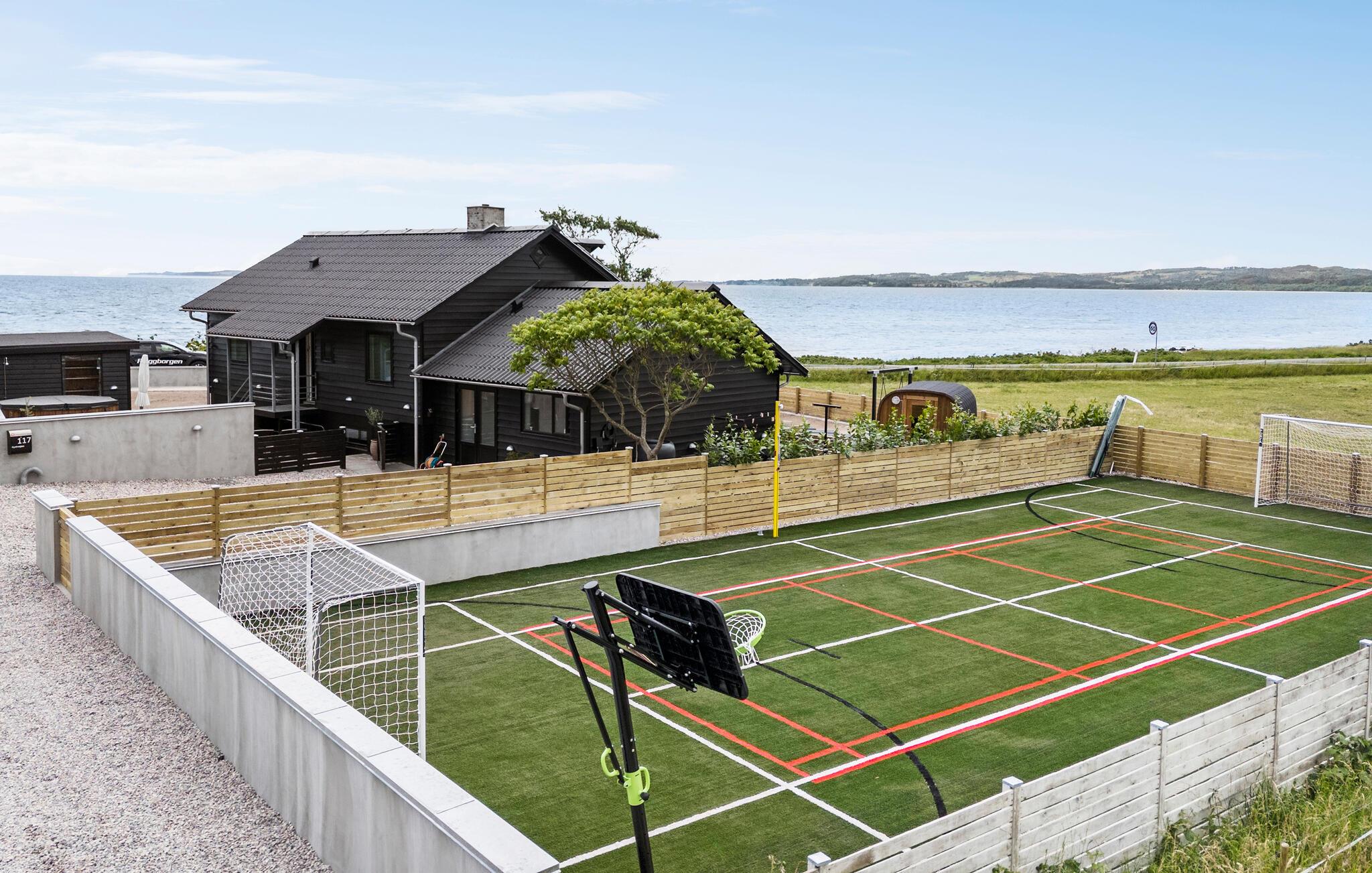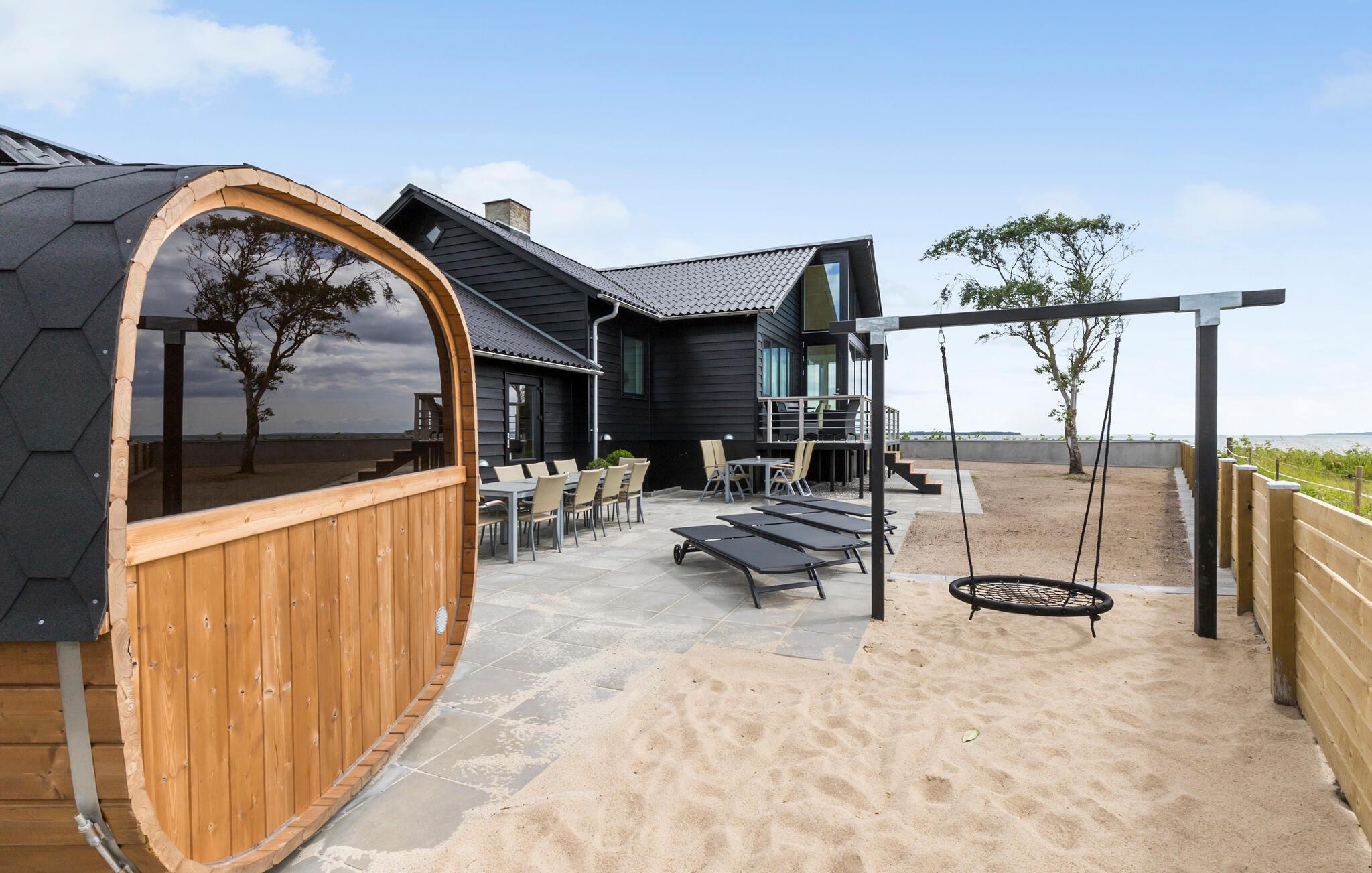 Udeområdet er tilsvarende lækkert. Begynd dagen i ro og mag med en friskbrygget kop kaffe, nyde roen og den friske luft, inden I trasker ned til vandet for dagens første dukkert. Der er masser af plads i haven til leg og en fodboldkamp, inden der tændes op i grillen ud på eftermiddagen. Og måske I skal forkæle jer selv med en aftentur i saunaen eller vildmarksbadet?