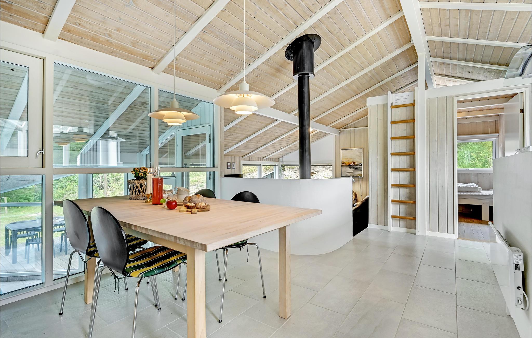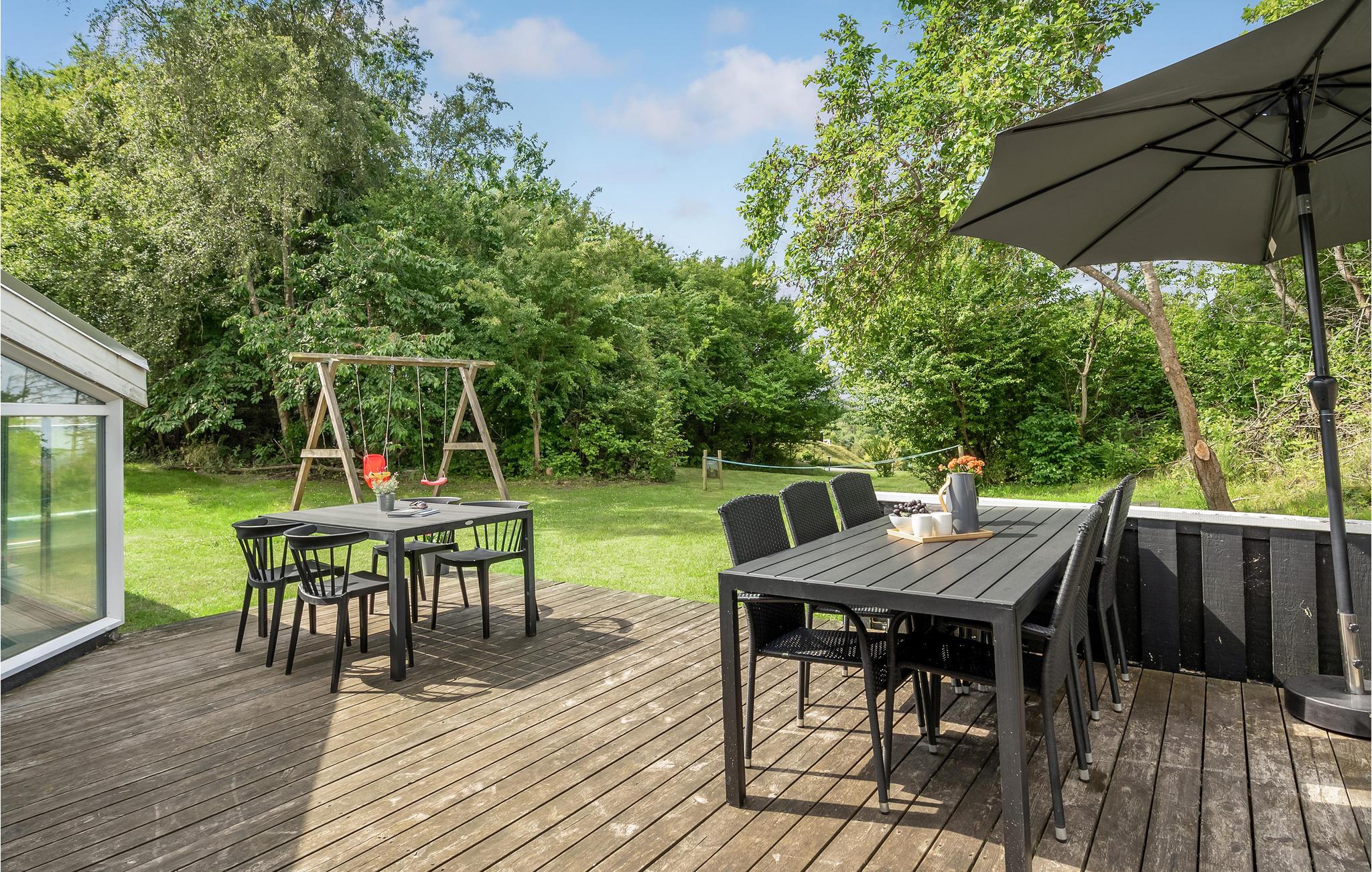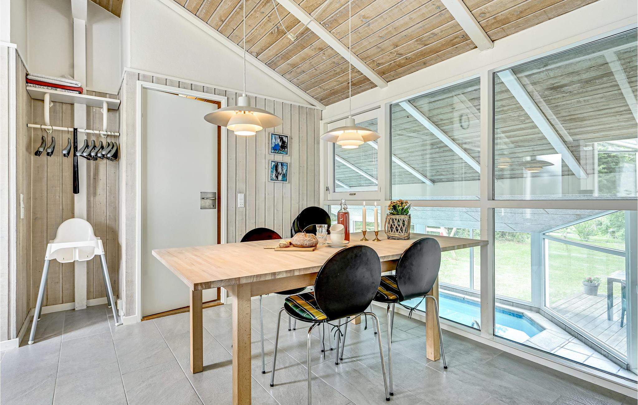 I familievenligt og roligt område med rigt dyreliv ligger dette feriehus. Huset er godt indrettet og byder på mange faciliteter, bl.a. swimmingpool og sauna. Såvel fra stuen som spisepladsen har I mulighed for at følge med i alle aktiviteterne i poolrummet. Hvad enten I er en eller to familier der ønsker at holde ferie, er der god plads til alle. Udendørs er der masser af plads til leg og boldspil og de tre gode træterrasser giver optimale betingelser for at nyde det dejlige vejr hele dagen. Området er et godt udgangspunkt for ture rundt på det naturskønne Mols eller egnens mange attraktioner.