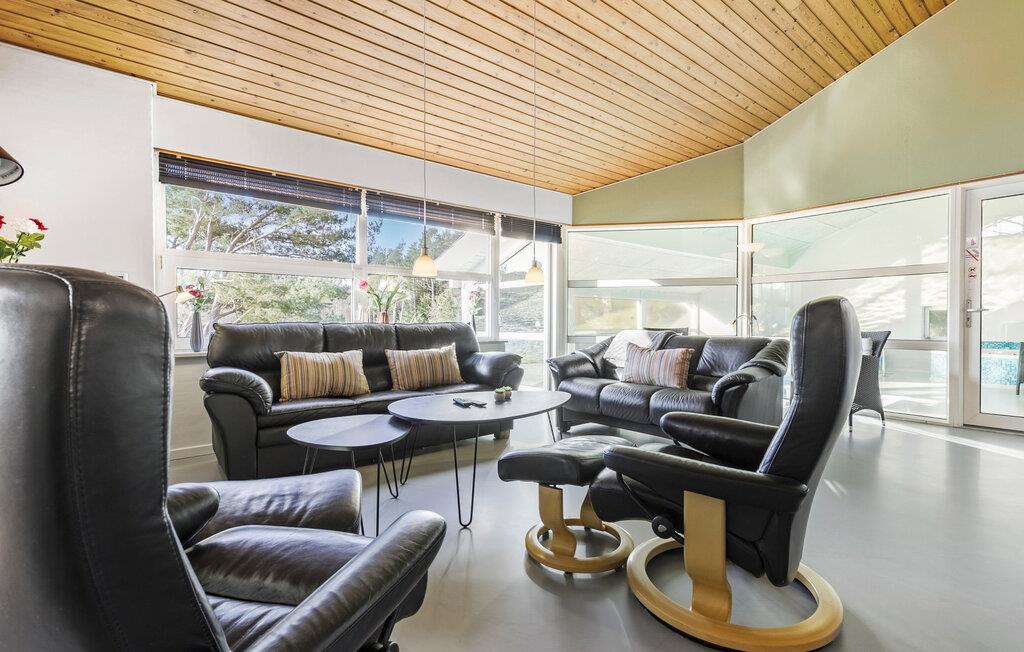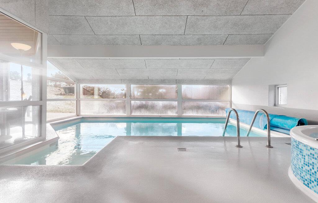 Dette skønne sommerhus indeholder bl.a. en dejlig poolafdeling med både swimmingpool, børnepool og et spabad til fire personer. Fra den hyggelige stue-/køkkenafdeling har I et godt udsyn til poolafdelingen, så I kan holde øje med de badendes leg i poolen, som opvarmes med en energibesparende varmepumpe. Børnene vil elske at opholde sig på den store hems, hvor der er lavet legeområde med bl.a fladskærm, madrasser og masser af puder, hvorfra de også kan kigge ned i stuen.