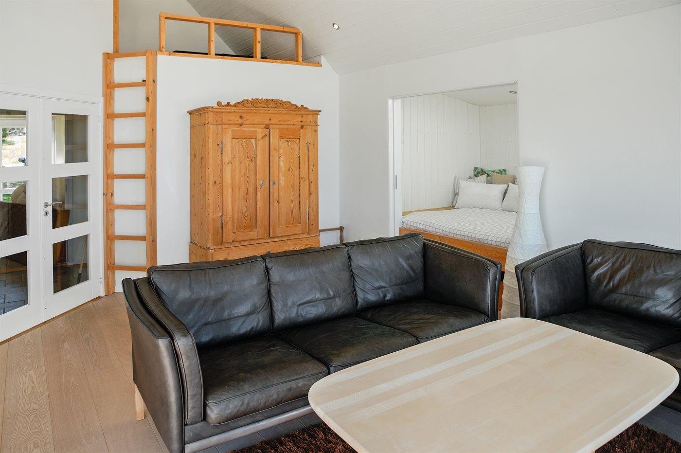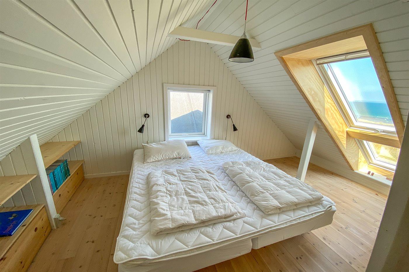 Der er i alt 3 soveværelser. Sovepladserne fordeler sig på: 6 sovepladser i dobbeltsenge. 2 sovepladser på madrasser. 2 sovepladser i alkove. 2 af disse sovepladser befinder sig i opholdsstuen og 2 af dem befinder sig på hemsen.