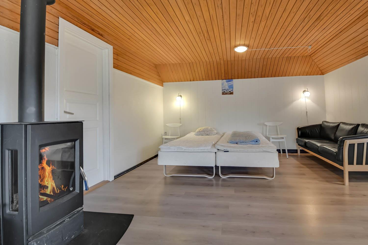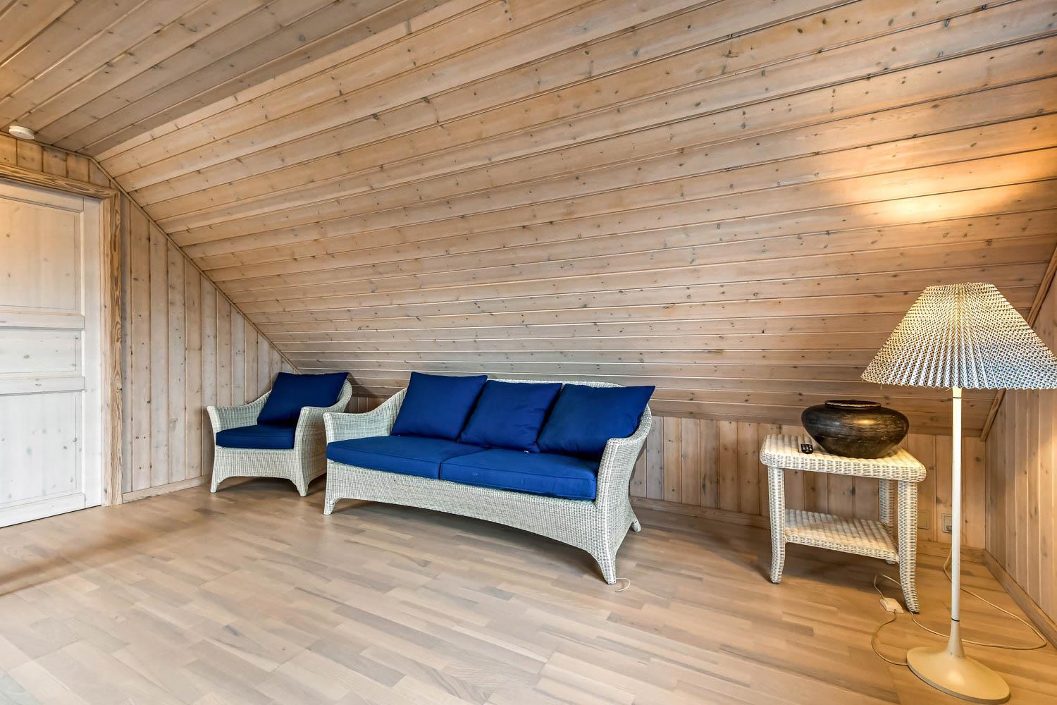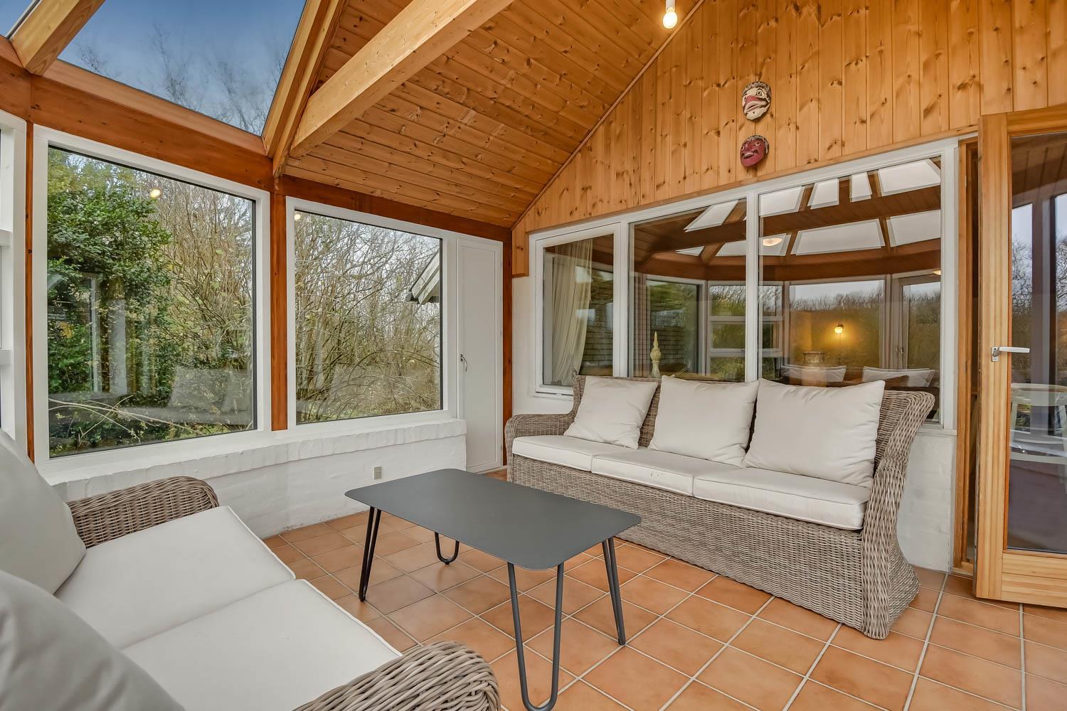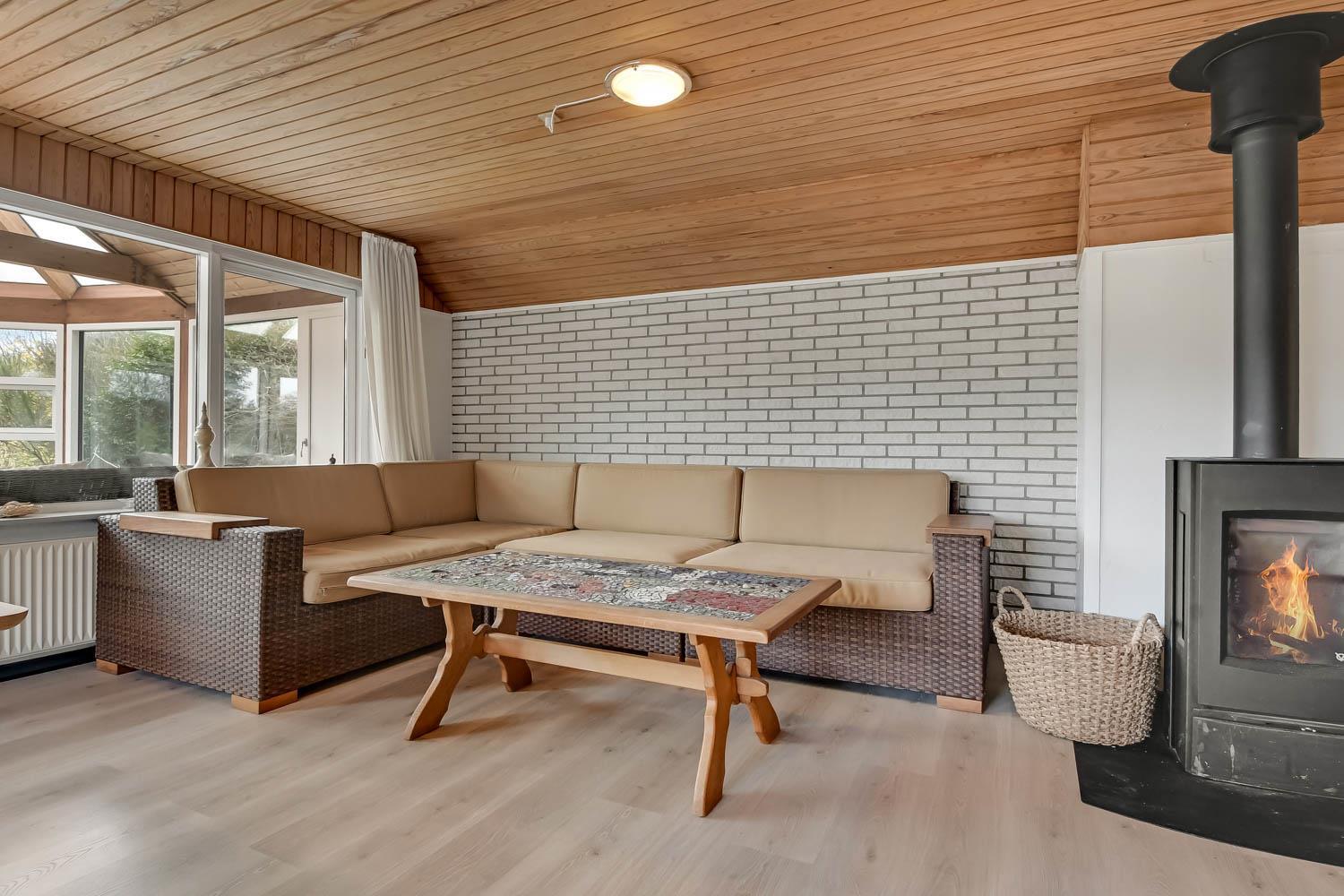 Overetagen består også af en mindre stue med udsigt over naturgrunden. Her er sofagruppe, sofabord og fladskærm med danske og tyske kanaler. Heroppe er der også et soveværelse med dobbeltseng plus et par ekstra løse madrasser. Hus nummer 2 har et køkken med mikroovn, ovn og køleskab med fryseboks på 20 liter. Her er ligeledes komfur og emhætte samt et hyggebord hvor 2 med plads til 2 personer. Fra køkkenet kan man gå ind i stuen og her er både brændeovn, fladskærm med dansk tv samt sofagruppe med bord samt en mindre sofa med plads til 3 personer. Der er også et spisebord til 4 personer og 2 sengepladser. Fra stuen kan man gå ud i en lækker havestue hvor der kommer masser af lys ind. Her er sofaer og og borde til 5 personer. Hus 2 har endvidere et rum med dobbeltseng, som man kommer ind fra via stuen. Går man et rum videre kommer man til et værelse med køjesenge. Da man er nødt til at passere dobbeltsengsværelset for at komme ind til køjesengsværelset anbefaler vi dette hus 2 til familien med mindre børn. Der findes naturligvis også et badeværelse med toilet, bruser og vask. Der er også installeret varmepumpe