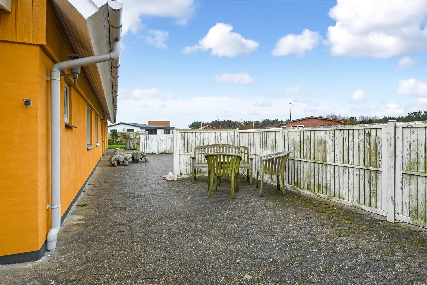 På nordsiden af det ene hus bør den indhegnede gårdhave fremhæves. Her er næsten altid læ og halvtaget gør at man altid kan sidde komfortabelt her og her kan mange sommeraftener nydes, mens man griller maden. Til huset hører naturligvis parasol, havemøbler, 4 solvogne og grill.