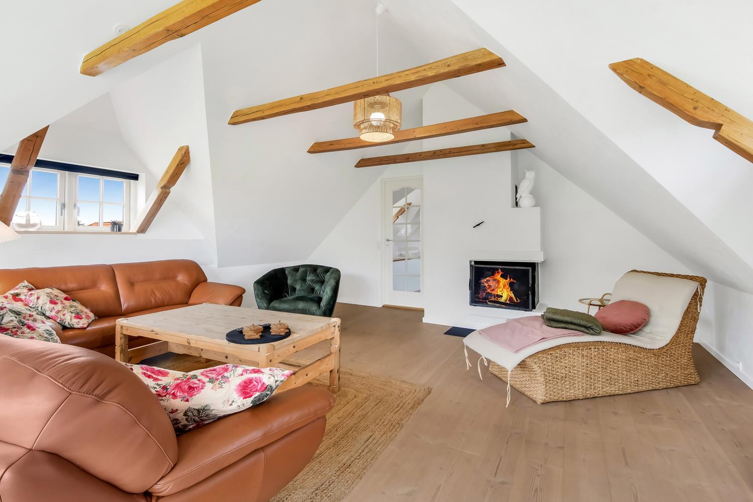 Via trappen ved køkkenet kommer I op på 1. etage. Her er der en åben repos med dobbelt sovesofa (1DS). Dejlig opholdsstue med en fantastisk udsigt over landskabet og fjordkig. Opholdsstuen er indrettet med dejlige møbler, Smart-TV med danske og tyske programmer samt mulighed for streaming af TV / Radio / Apps via Chromecast. Badeværelse med toilet, håndvask og bruser. Stor soveværelse med (1DS) og TV i loftet med danske og tyske kanaler samt udgang til en pragtfuld altan med vandkig og udsigt til landskabet.