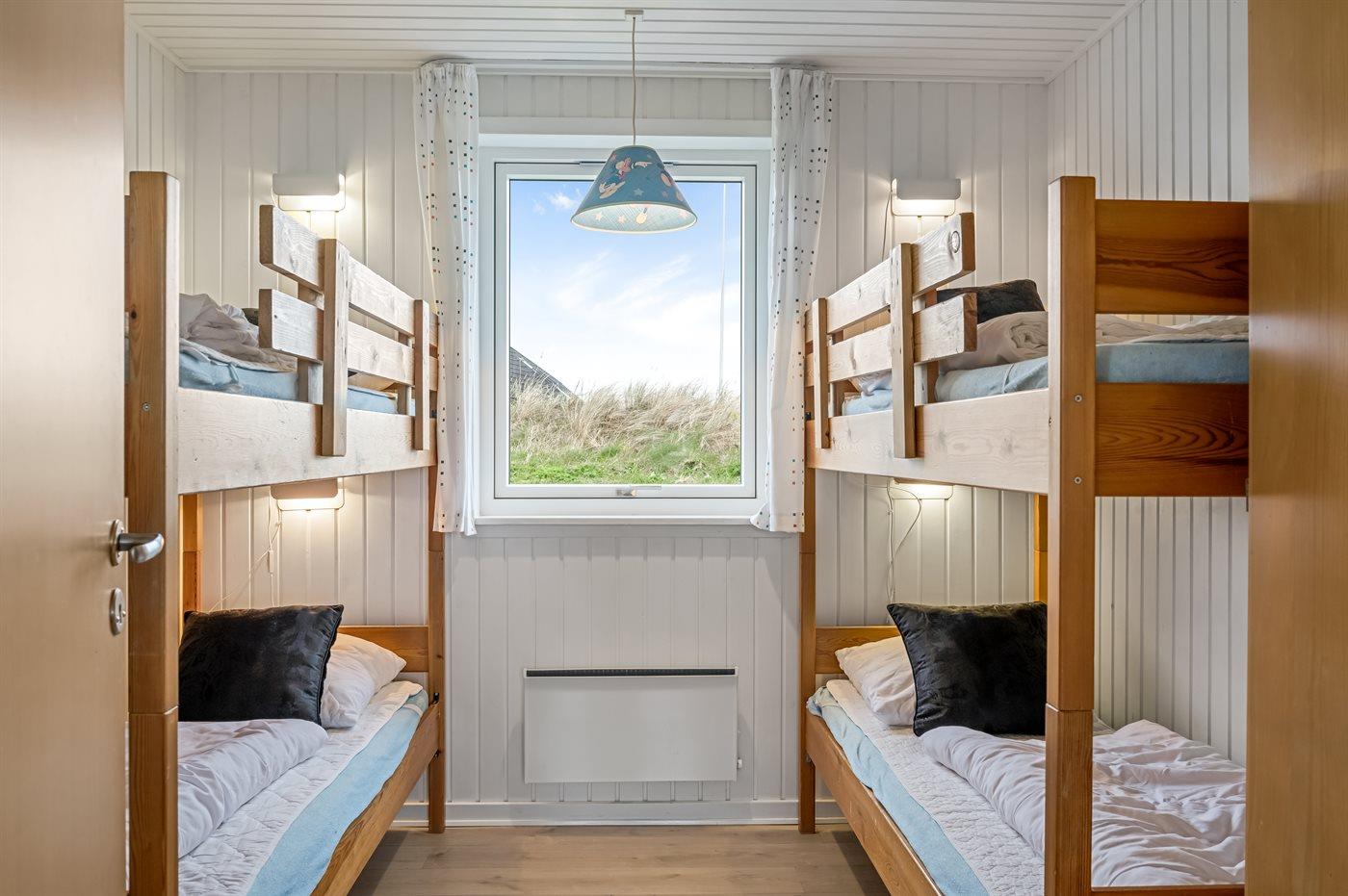 Der er i alt 4 soveværelser. Sovepladserne fordeler sig på: 6 sovepladser i dobbeltsenge. 4 sovepladser i køjesenge. Derudover er der 1 stk. barneseng.