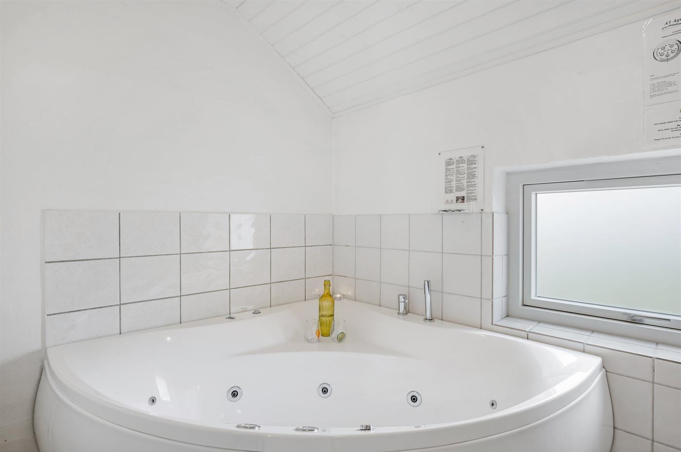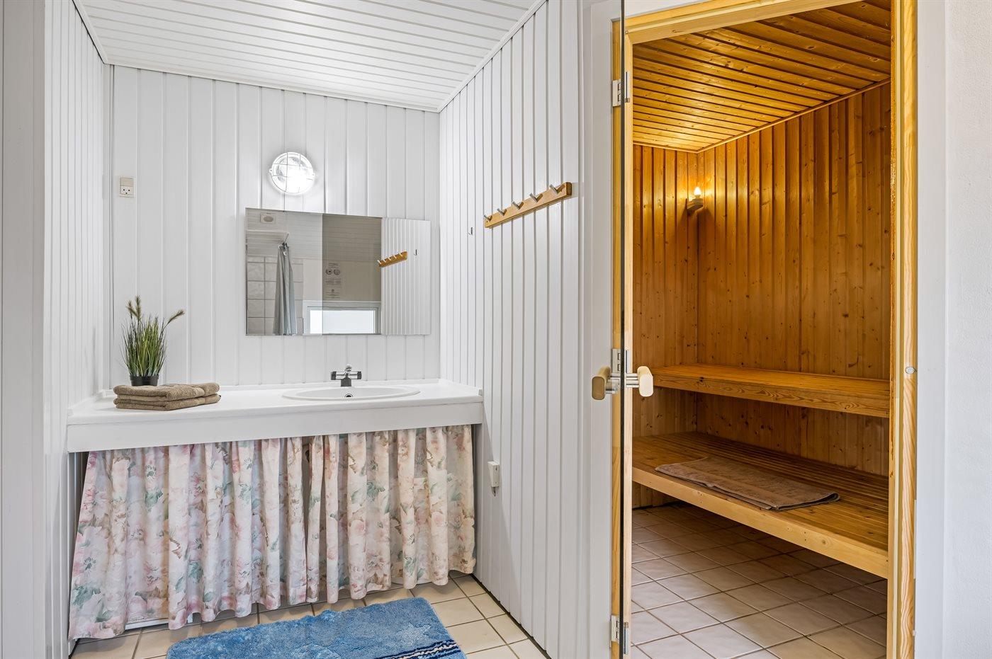 Der er 2 badeværelser med bruseniche og 2 toiletter. Der er gulvvarme på 2 badeværelser. I saunaen er der mulighed for afslapning.