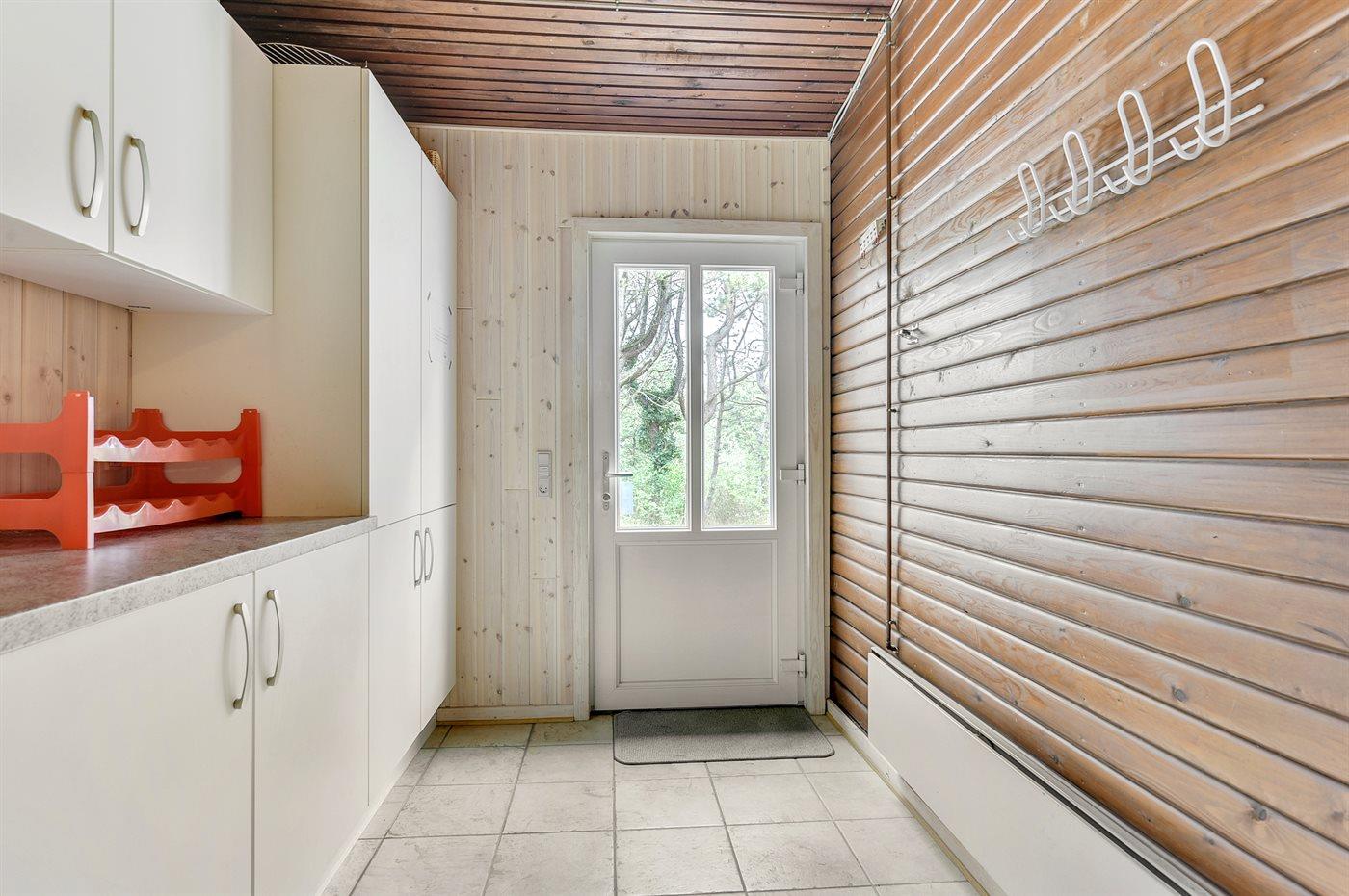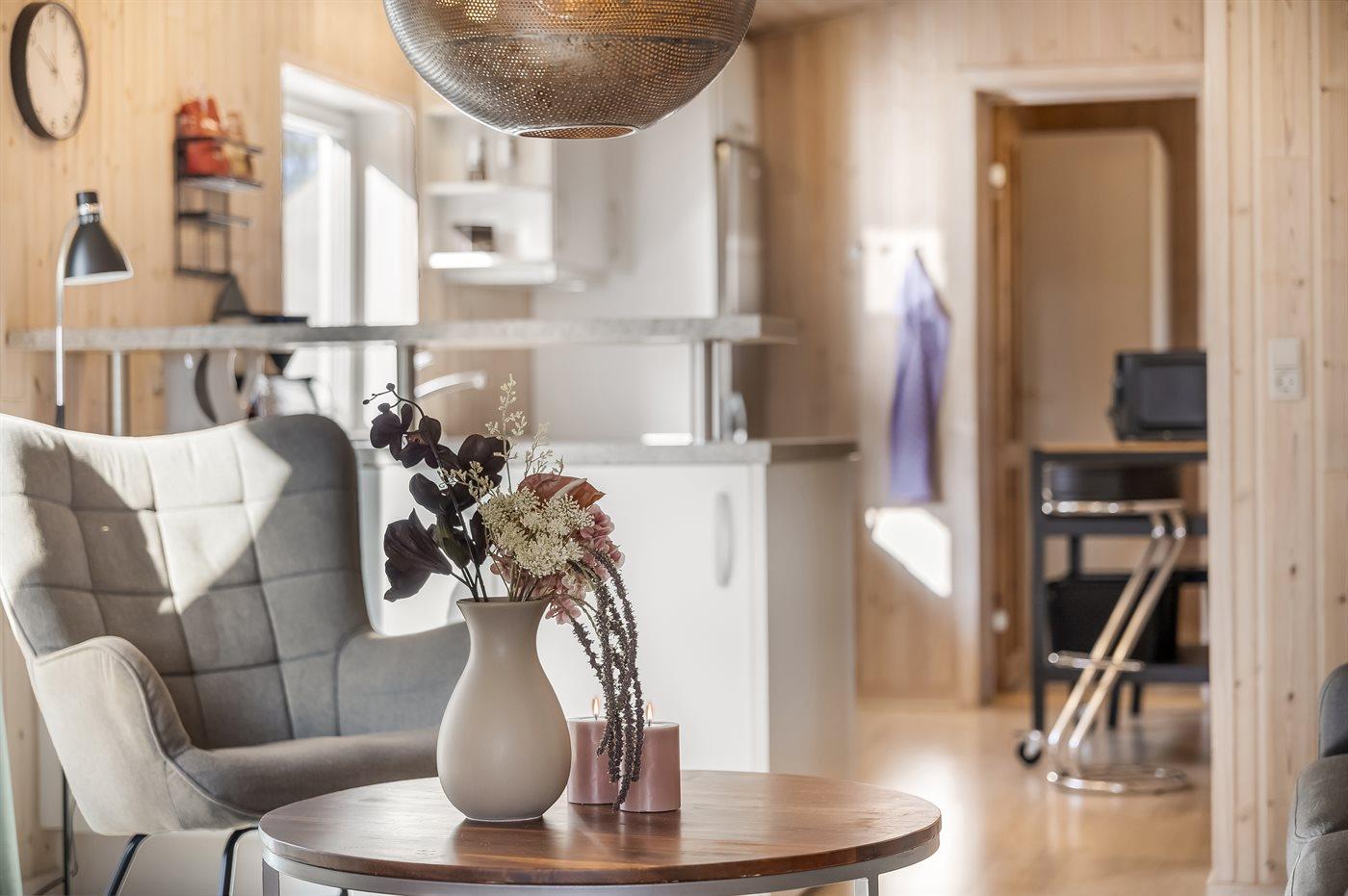 Køkkenet er udstyret med 1 køleskab. Der er 4 keramiske kogeplader, varmluftovn, mikrobølgeovn samt opvaskemaskine.