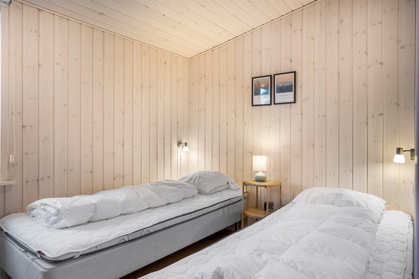 Der er i alt 3 soveværelser. Sovepladserne fordeler sig på: 2 sovepladser i dobbeltseng. 3 sovepladser i enkeltsenge. Derudover er der 1 stk. barneseng.
