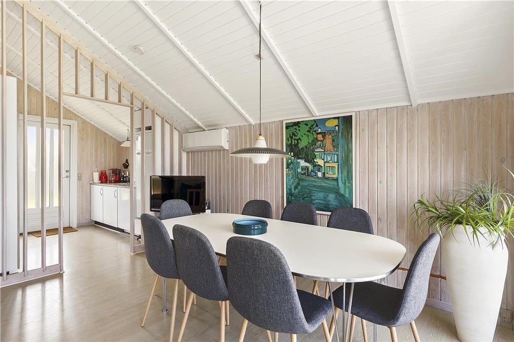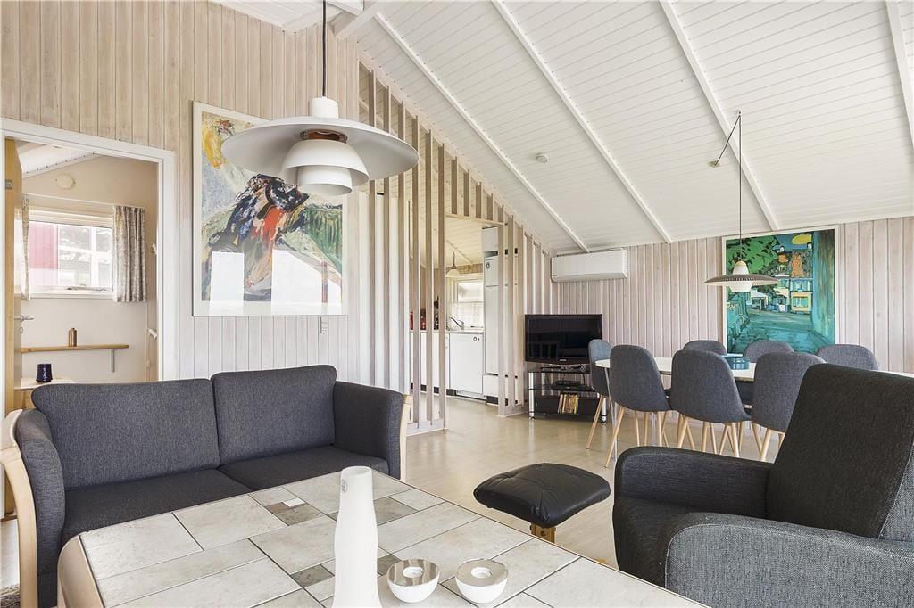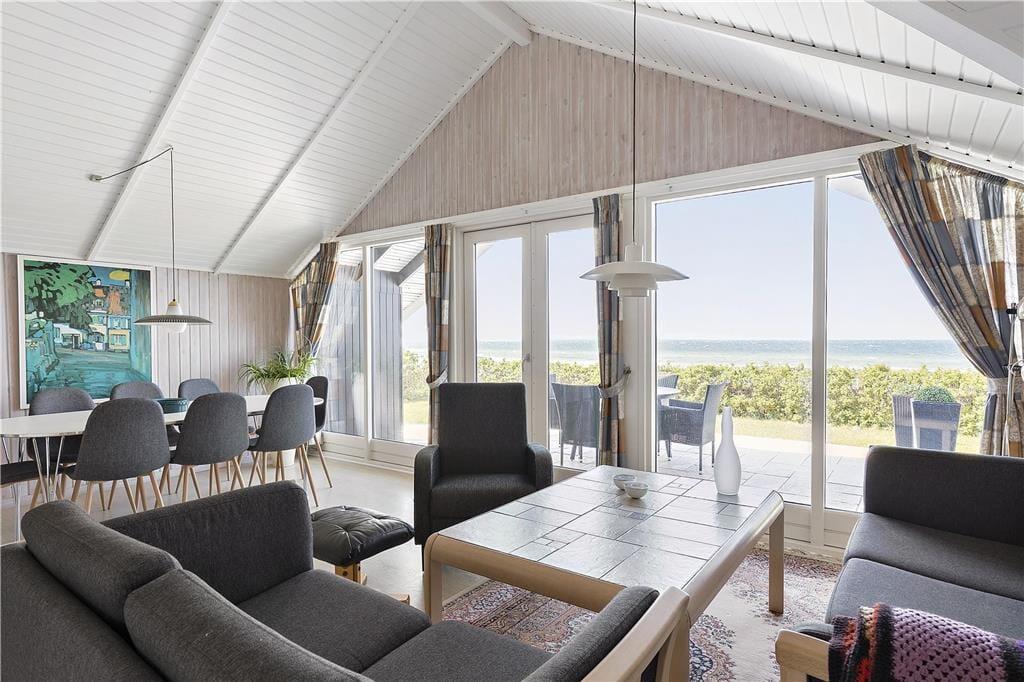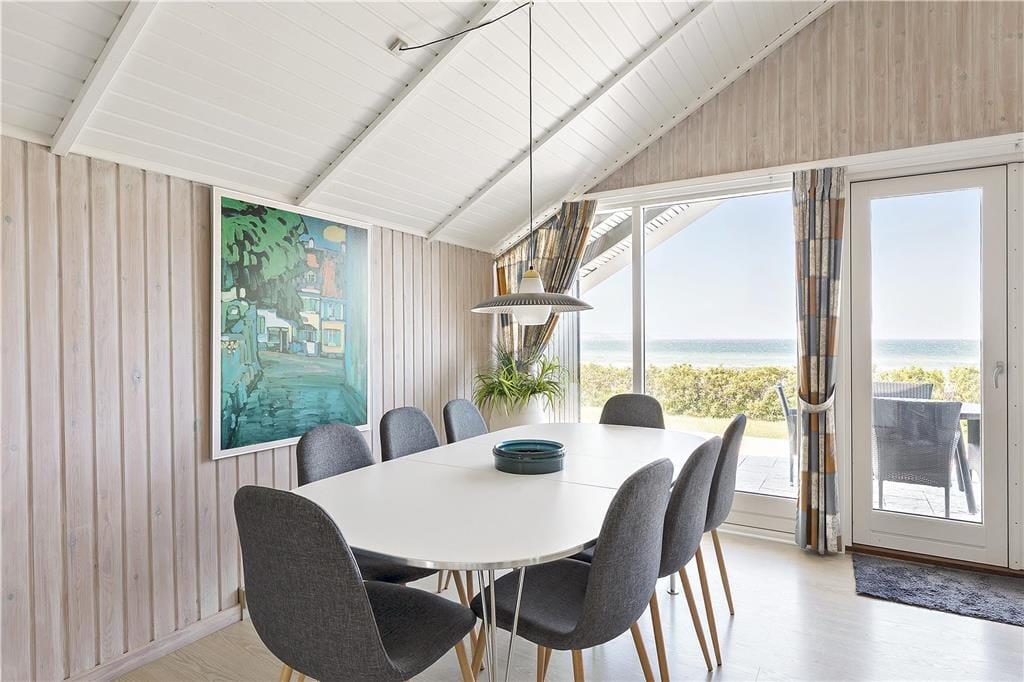 I den lyse, rummelige stue med sofa, spisebord og loft til kip, har du udsigt over havet i Nekselø Bugten og kan se både Nekselø og Sejerø samt følge lysets skiftende reflekser i det blå hav gennem dagen. Det kan være svært, at få øjnene fra udsigten i første række til havet, men i stuen kan du også samle familien om spisebordet til et brætspil, puslespil eller bingo.